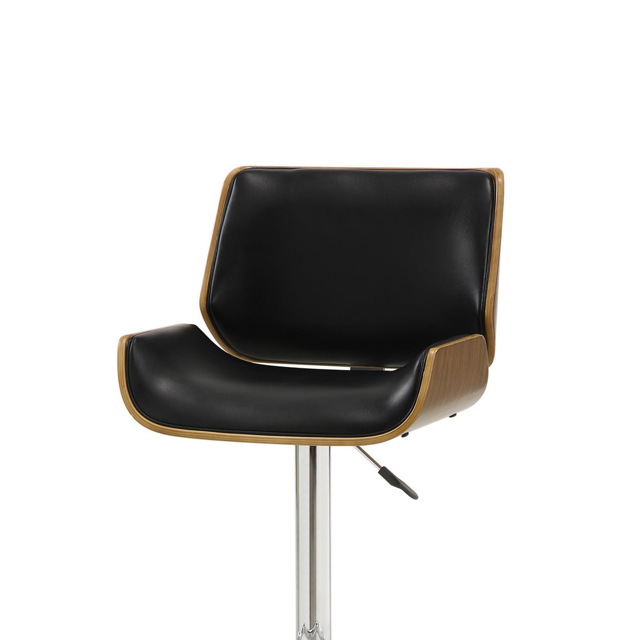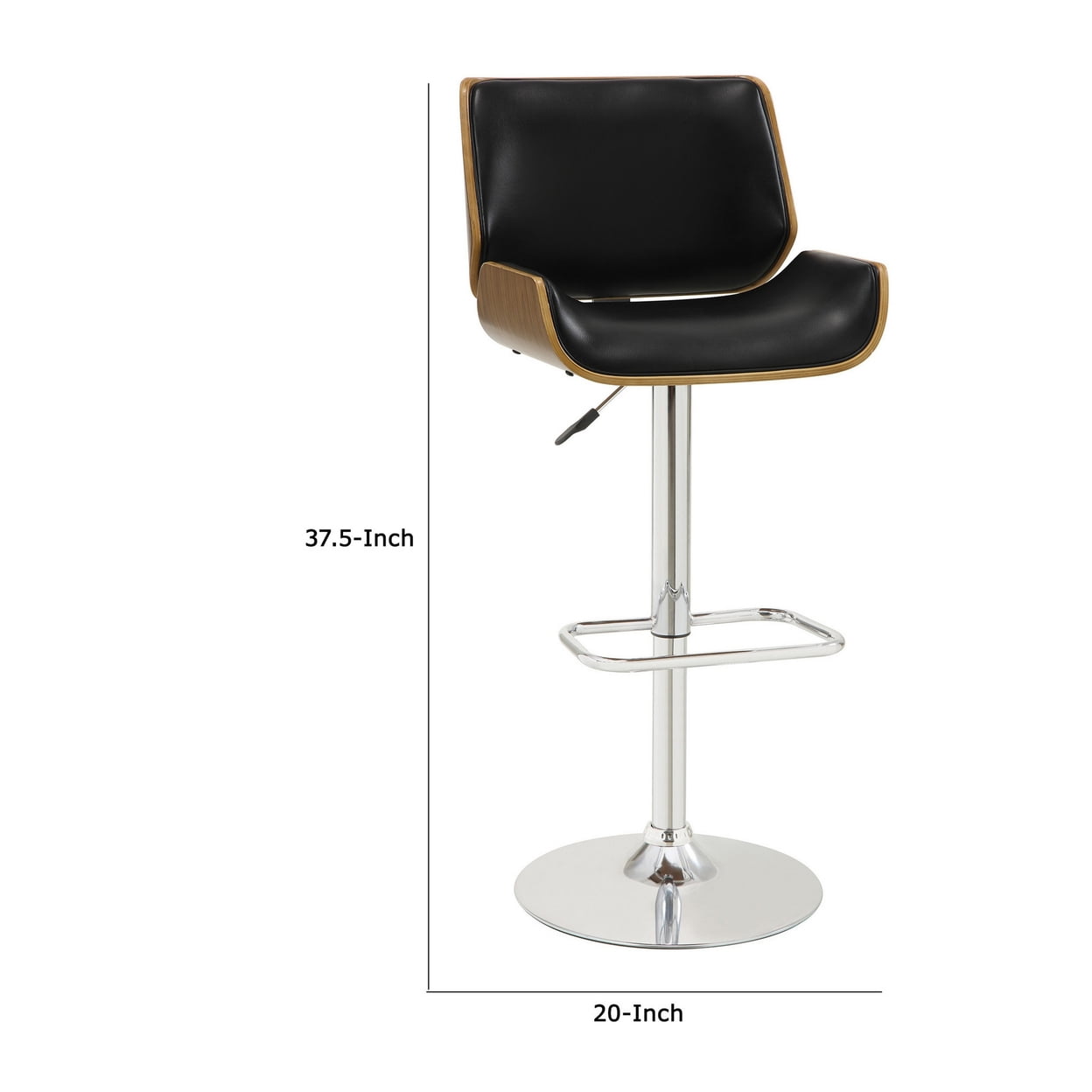 Contemporary Small Back Adjustable Bar Height Stool Black and Walnut – Saltoro Sherpi Comfortable and luxurious this exceptional Contemporary Small-Back Adjustable Bar Height Stool is designed to create a uniquely modern and chic office space. Ultra modern and chic stool is upholstered in Black leatherette and finished in walnut. This excellent bar height stool features an adjustable seat a swivel design and a footrest to provide comfort. Crafted from wood and veneer this stool has a contemporary design.