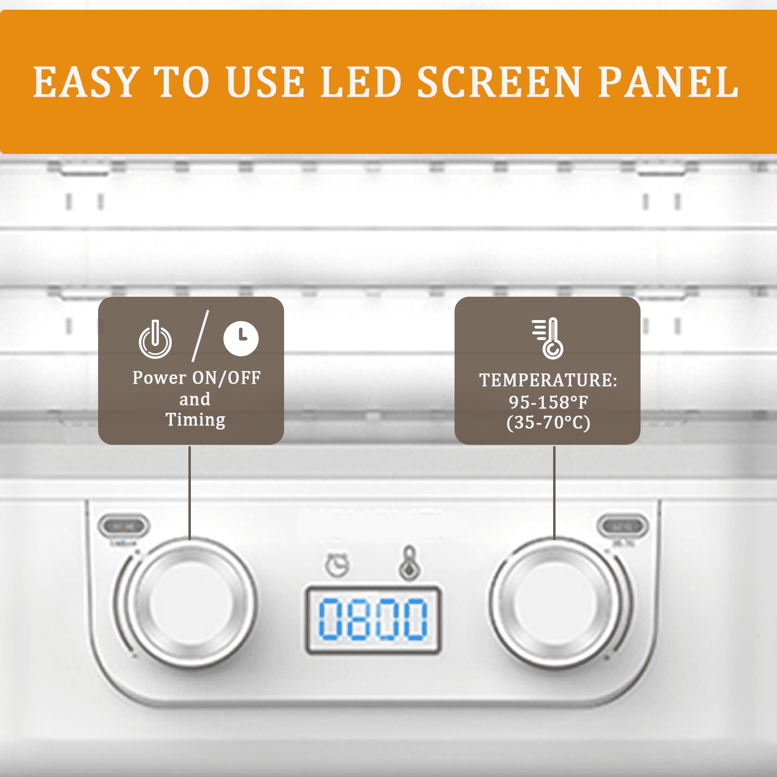 【Removable Tray】 The dehydrator for food and jerky comes with 5 BPA-Free trays that can stack on top of each other to be a good space saver. Rotate each layer you can get 2 adjustable heights for different sizes of food, giving you plenty of drying space and capacity. 【360 ° Circulating Hot Air】The food and jerky dehydrator adopts 360-degree circulating hot air technology, which can accelerate steam discharge, effectively remove excess moisture in food, dry evenly and quickly, while retaining the original flavor of food, and easily locking in minerals and vitamins. 【Intelligent Timer and Temperature Control Function】The dryer has an LED digital control panel, with an intelligent timerthat can be set directly before drying food without manual supervision at all times. It can run continuously for up to 48 hours, which is convenient and safe. The dryer provides a temperature control function with an adjustable range of 95-158 degrees Fahrenheit. You can set the temperature with one click through the digital control panel, just adjust the left button, which is easy to operate. 【Easy to Clean】To clean, simply remove the trays from the machine and wash them using soapy water or through a dishwasher. All materials are of Culinary-Grade and BPA-FREE, which also ensure the high quality and long service life. 【Multi-Purpose】Healthy Snacks—Our food dehydrator makes fast, easy, and healthy snacks. Enjoy dehydrated vegetables, dehydrated fruit for cocktails, dehydrated meats, banana chips, fruit roll-ups, & beef jerky. Fun and crafts—Perfect for hobbyists to dry flowers, potpourri, or dough crafts and pet lovers to prepare healthy and delicious 100% natural treats for their furry companions.