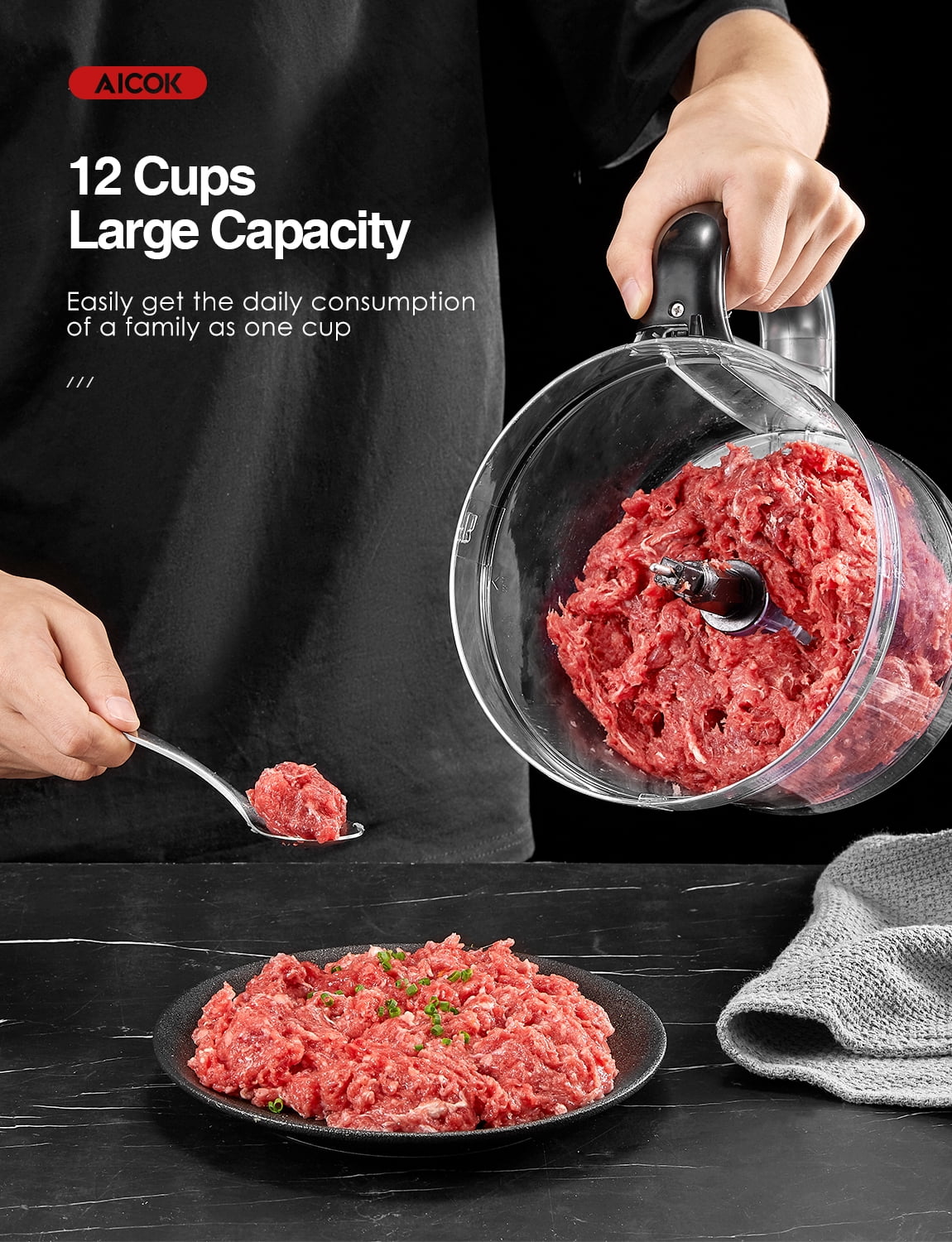 Being the perfect sous chef, the Food Processor is designed to take care of the more mundane tasks of cooking so you have more time to enjoy the parts you really love. Whether you need to chop up some chunky vegetables for a casserole or you need a little help finely slicing up ingredients to sneak into your little ones spaghetti bolognese – this food processor will bring ease to every meal you make at home. The multifunctional food processor comes with: 2 feeding tubes, 2 pushers,1 reversible disc,1 stainless steel S-blade, and 1 plastic S-blade 3 safety nodes are set up 4 suction cups 12 Cup Large Capacity