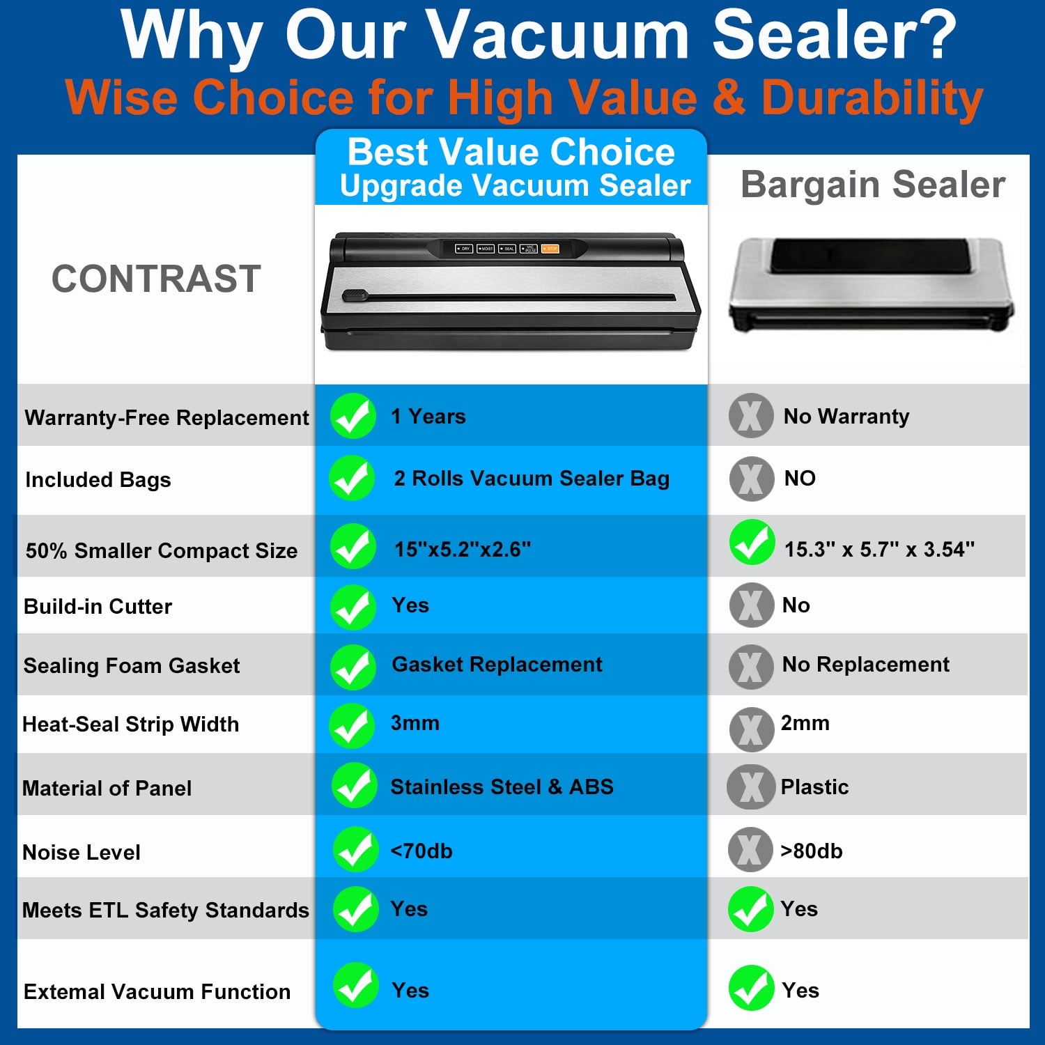 A food vacuum sealer machine is a great helper for your kitchen. You will find that the machines are fabulous for preserving food in the fridge and keeping food fresh longer with the machine. Supported 2-in-1 function combined with vacuum and sealing according to your usage needs The foods can keep the original flavor. Perfect Assistant for Your Kitchen If you want to preserve food for longer time or you are crazy about bulk food purchases and find yourself struggle to divide it up and keep its fresh taste at the same time, vacuum sealer machine absolutely exceed your expectations.Stylish and sleek design making meat sealing machine with roll bags a lot easier to store or even keep on the counter. Fabulous for preserving food in the fridge and keeping food freshness longer with the machine. Supported 2-in-1 function combined with vacuum and sealing according to your usage needs. Ideal Solution To Keep Food Fresher This vacuum sealer is aim to keep your meat, vegetables, and leftovers fresh and flavorful, above 10 times longer storage than traditional refrigeration, frozen storage and normal conditions. ETL TESTED & CERTIFIED: The vacuum sealer is ETL certified by Nationally Recognized Test Laboratories (NRTLs) for compliance with applicable product safety standards, SAFETY IS OUR NO.1 PRIORITY. You will get : 1 x black + stainless steel sealing machine 1 x user manual 1 x vacuum bag roll (8″X78”) 1 x vacuum bag roll (11”X118”) 5 x Vacuum bags 1 x double female external draw tube 1 x manual 1x power cord VS6616 new product advantages: 1. Built-in cutter, 2. Low-pressure heating wire (safer to use) 3. Intelligent display screen (intelligent vacuum timer, sealing time indication, countdown display) 4. 4 function keys (single sealing, vacuum sealing, spot pumping, pause) 5. Five modes are selected (normal mode, soft mode, dry mode, wet mode, ultra-wet mode. Note that the machine will automatically jump to soft mode when ultra-wet mode is selected) 6. LED function indication accuracy bar. 7. High-end simple stainless steel panel design. 8. Power: 110W (more energy saving). 9. NTC overheat protection and TF temperature fuse double protection. Easy to operate with simple automatic electric plug-in design Soft touch digital buttons with LED light indicator Features two separate sealing modes for Dry or Moist foods Integrated roll storage & cutter Efficient Sealing Multi Bags
