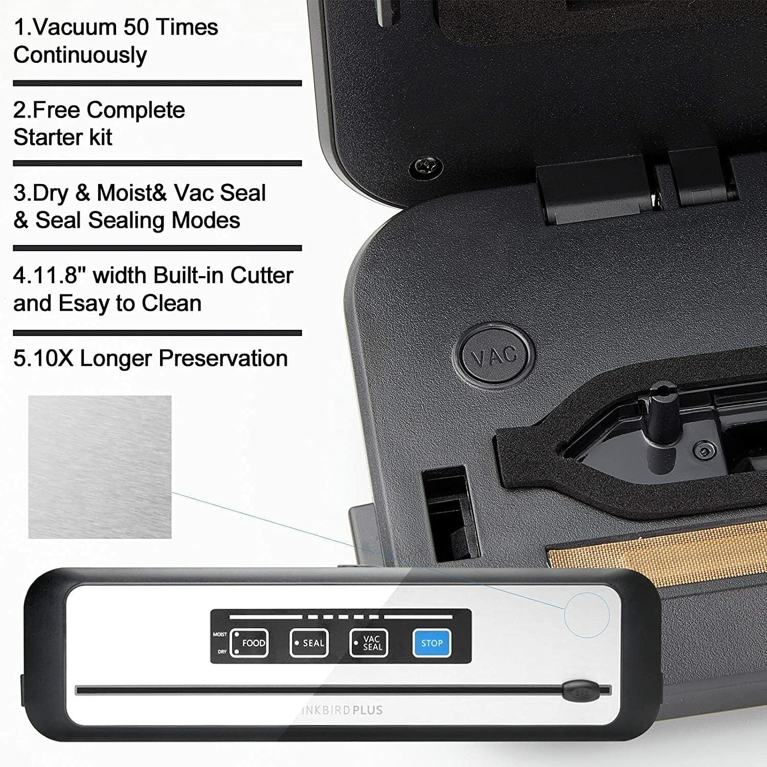 Inkbird Food Vacuum Sealer Machine 7X Longer Preservation with Dry & Moist Dual – mode Bag Sealing & complete Storage Starter Kit 80Kpa Suction
