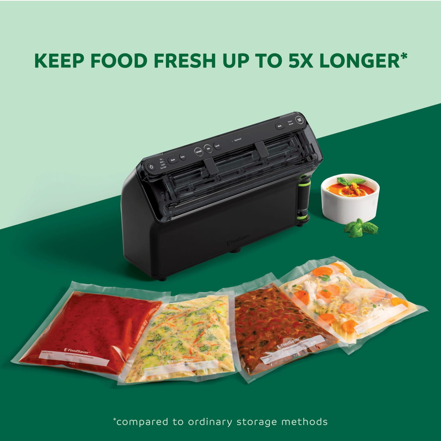 Keep food fresh up to 5x longer* and vacuum seal like never before with the FoodSaver Elite All-in-One Liquid+™! For the first time ever, use your FoodSaver vacuum sealer to seal liquids like soups, sauces, and salsas,** in addition to proteins, produce, and pantry items. With 6 custom sealing settings plus a retractable handheld sealer, this vacuum sealer machine provides unprecedented versatility for fridge, freezer and pantry storage, and allows you to enjoy fresher ingredients, less waste, and fewer trips to the market. Convenient features like built-in roll storage and cutter bar make it easy to create custom-size bags in seconds, and machine automatically locks when it senses bags are in position. From meats and seafood, to sauces and soups, the FoodSaver Elite All-in-One Liquid+™ vacuum sealer makes makes food preservation and saving money easier and more enjoyable than ever before!. (*vs. ordinary storage methods; **Liquids with a viscosity of 1.39 mPa·s or higher).
