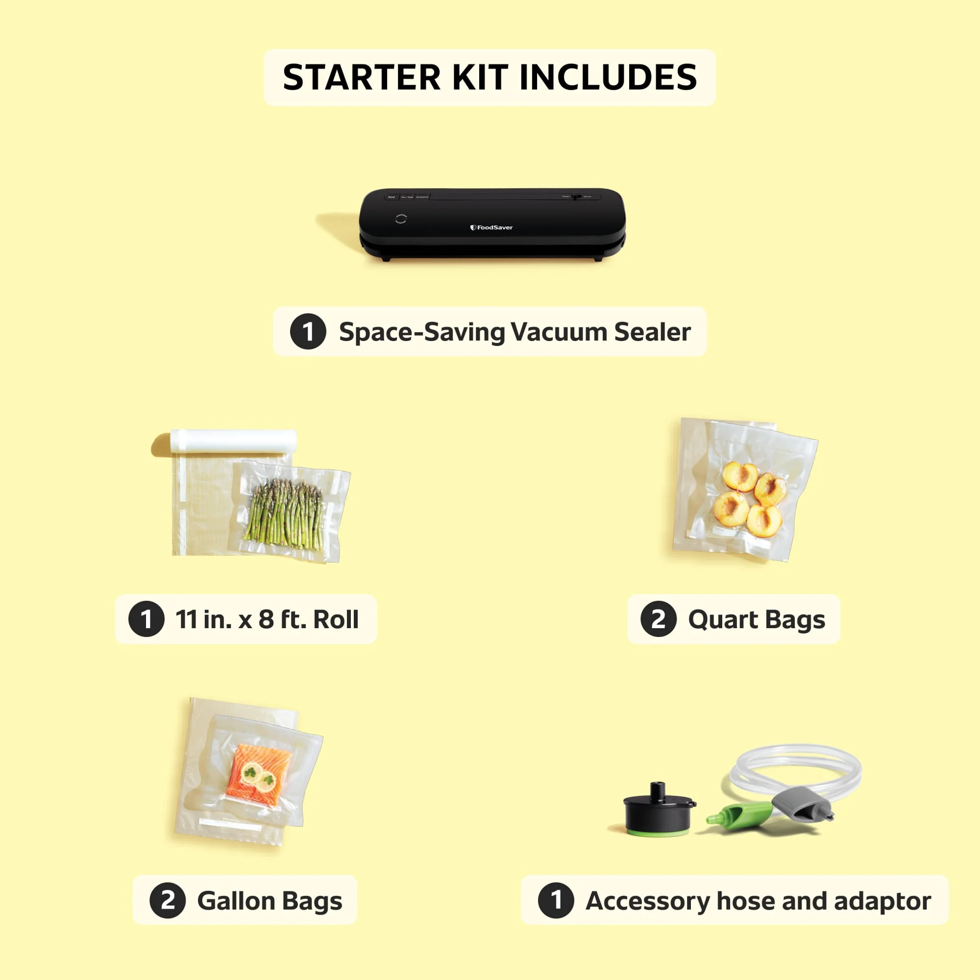 Keep air out and freshness in longer with FoodSaver® Space-Saving Vacuum Sealer. This space-saving appliance saves 30% more space than other FoodSaver models with full-size power for everyday sealing, allowing you to enjoy fresher food, less waste, and fewer trips to the market. When not in use, easily tuck your vacuum sealer machine away in a drawer or cabinet or store vertically on counters. Not only does this sleek food sealer keep food fresh up to 5x longer,* it also prevents freezer burn, so take advantage of grocery deals and stock up with confidence. Intuitive controls include Push to Lock system and simple button controls for Seal Only, Accessory, and Vac/Seal to form an airtight seal around meat, seafood, fruits, veggies, and dry goods, making it perfect for fridge, freezer, and pantry storage. The Easy Bag Alignment feature helps lessen bag waste, meaning food preservation and saving money is easier than ever!. *vs. ordinary storage methods.