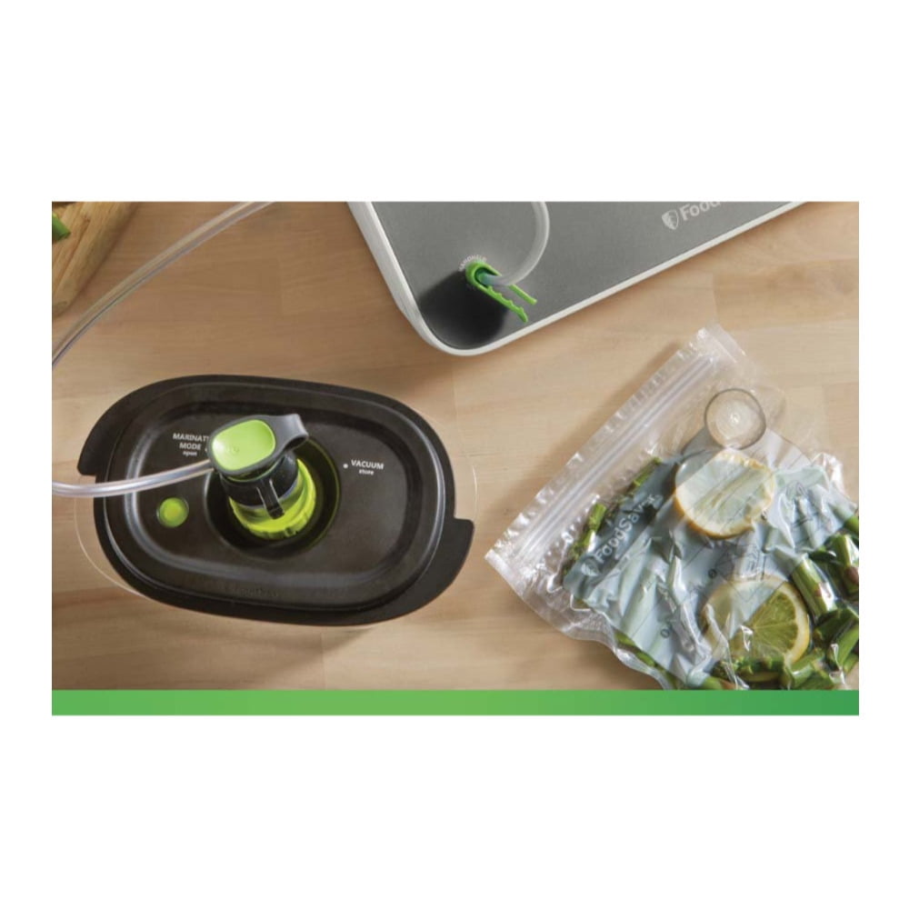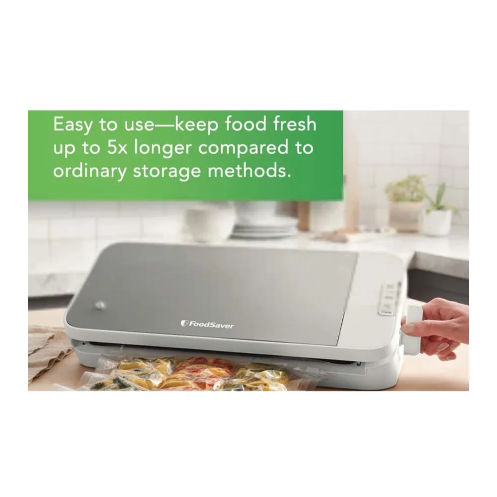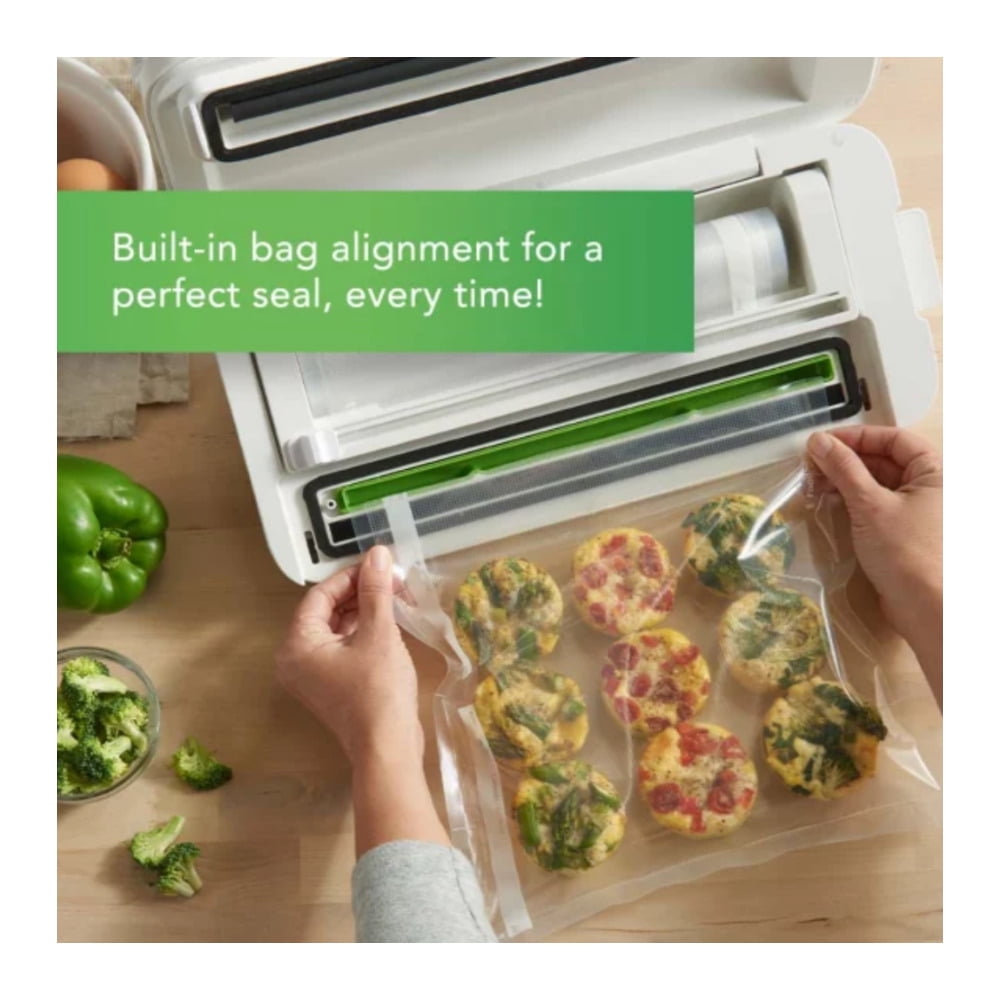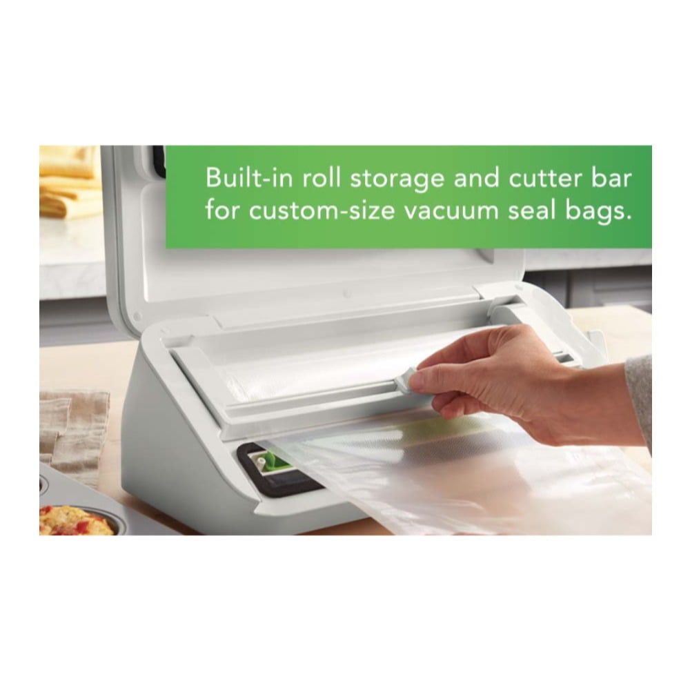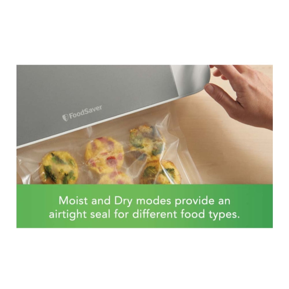 Keep Food Fresh Longer: keeps food fresh up to 5x longer compared to ordinary storage methods, and helps prevent freezer burn Includes: One 11-inch x 8-foot vacuum seal roll; 2 quart-sized vacuum seal bags; 2 gallon-sized vacuum seal bags; and 1 handheld sealer and accessory hose Roll Cutter and Storage Bar: Features built-in roll storage and a cutter bar to easily make custom-sized bags without scissors Convenient: Dishwasher-safe removable drip tray for easy cleanup; easy-lock latch for 1-handed operation while you’re securing the bag; and handheld sealer, accessory port, and hose so you can also use zipper bags, containers, and more Compatibility: It is compatible with all FoodSaver bags, rolls, and accessories.