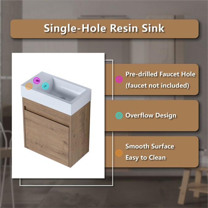 Introduce sleek sophistication and eco-friendliness to your small bathroom with our 18-in floating wall-mounted bathroom vanity. Featuring a paint-free board to minimize environmental impact, this compact vanity is perfect for tight spaces with its space-saving floating design. The soft-close door and pristine white resin sink add a tranquil, luxurious touch, while the ample storage keeps essentials neatly organized. Upgrade your bathroom to a modern sanctuary with this stylish, functional vanity.