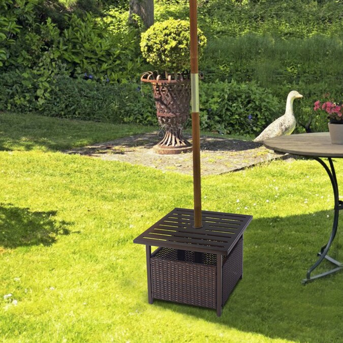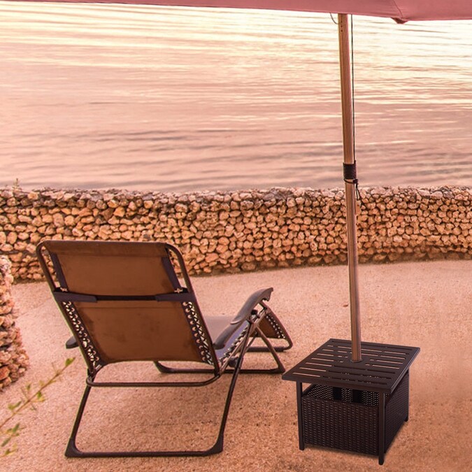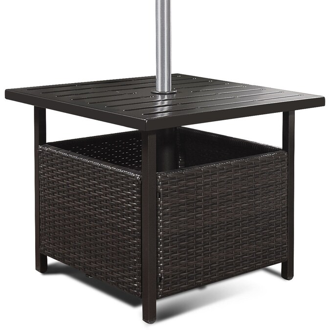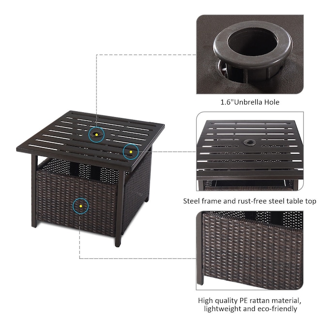 This brown rattan side table with a reserved umbrella hole is perfect for outdoor space, such as patios, gardens, backyards, poolsides, etc. Also, its curved and polished feet make it suitable to be used indoors. Made of steel, it’s sturdy with a strong bearing capacity. There is a storage space under the tabletop. It can be used to store sandbags to increase the stability of the table. It also can be used to store other household items when used indoors. It will be a great addition to your living space.