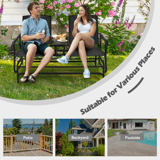 - Two-person rocking chair is made of heavy-duty steel frame and weather-resistant fabric
