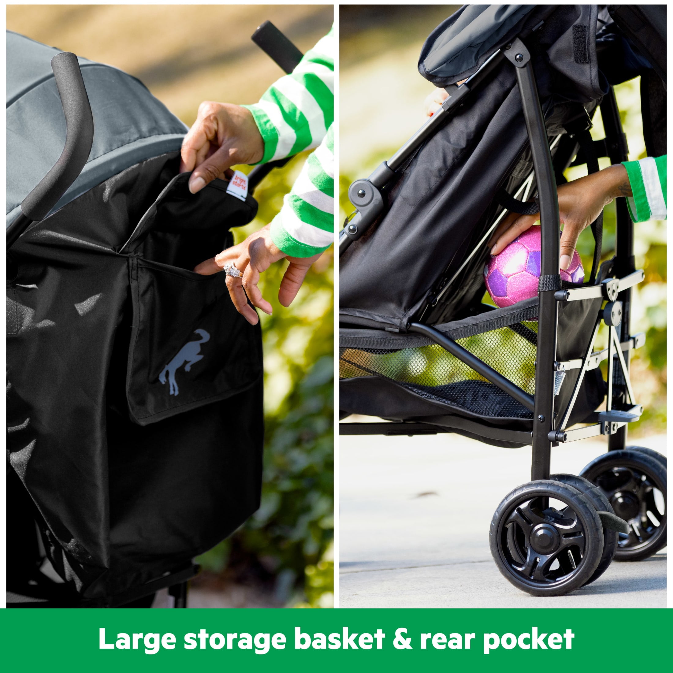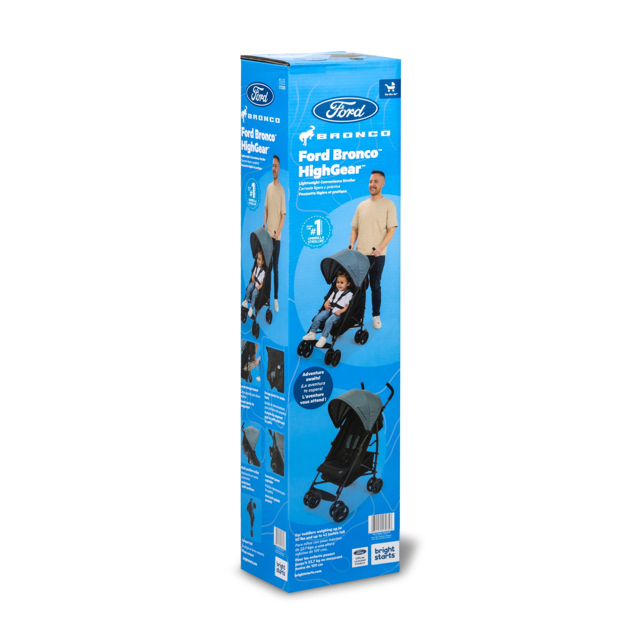 Stroll into adventure-mode with the Ford Bronco HighGear Lightweight Convenience Stroller by Bright Starts! With classic Ford tough durability, this lightweight stroller features a steel frame to get you and your little passenger where you need to go. The stroller folds compactly, so you can pack it in the trunk when hitting the open road or just running errands. When its time to park it, this convenient easy-fold design allows for simple storage too. Light on weight but heavy on comfort, our Bronco stroller features a large seat area and multi-position recline. Protect baby from the sun with the adjustable canopy, which includes a flip out sun visor. Catch eyes without catching rays in the iconic Ford Bronco Area 51 color. Features a padded 5-point safety harness, anti-shock front wheels, and lockable rear wheels. Sport meets utility in this rugged stroller with several storage spots and conveniences for your strolling road trips: a large storage basket holds up to 10 lbs, rear storage pocket, and cup holder. Maximum weight: 50 pounds. Maximum height: 43 inches. Product dimensions: 33.5L x 19.5W x 42.5H (unfolded); 42.75L x 12W x 9.75H (folded).