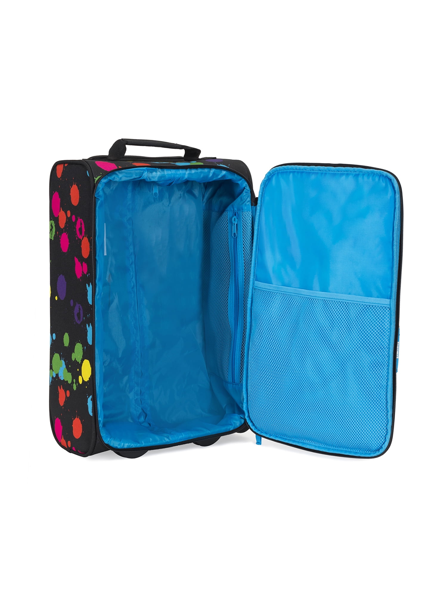 Inline wheel system, Telescoping handle, Front zip pocket, Interior mesh pockets, Molded rubber logo, Branded webbing zipper pull, Branded lining