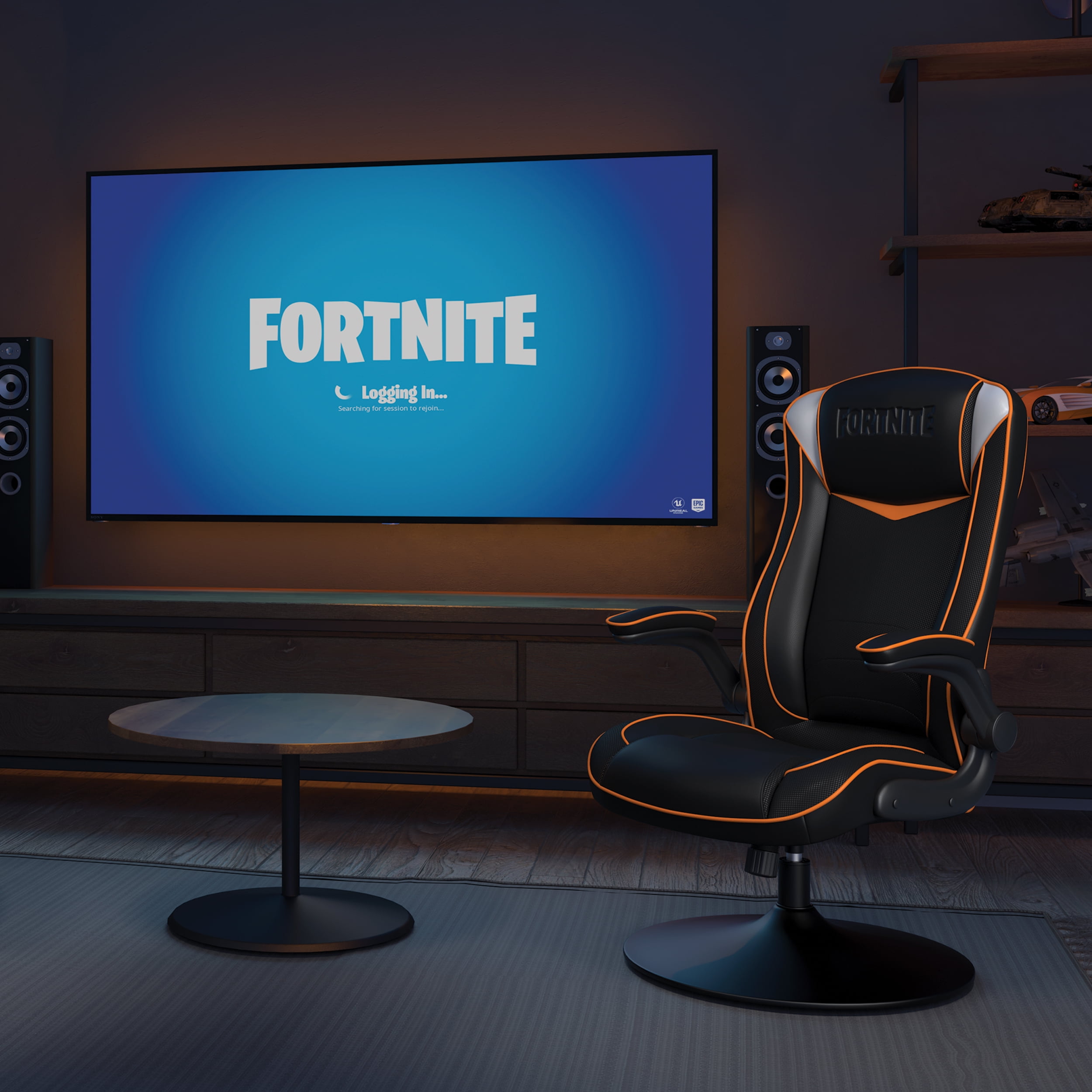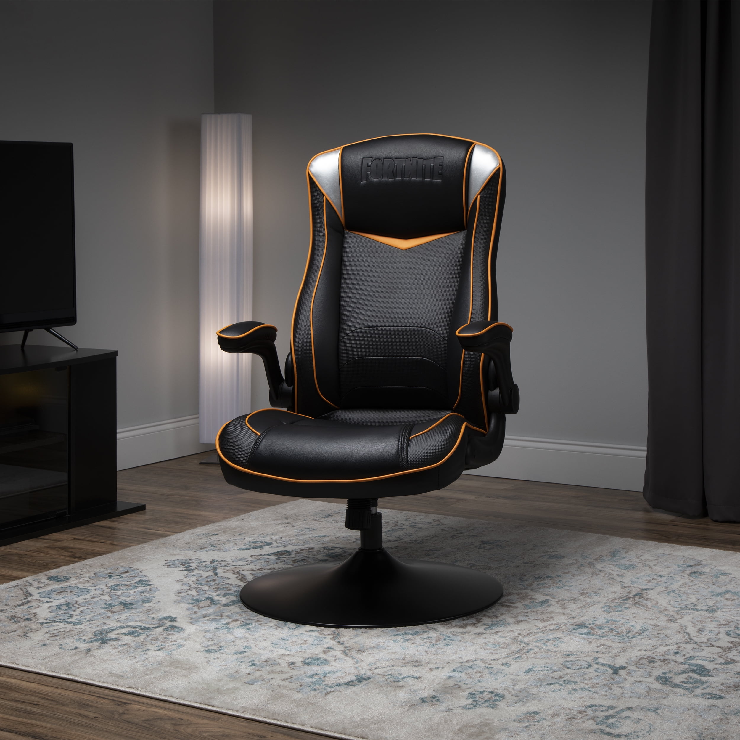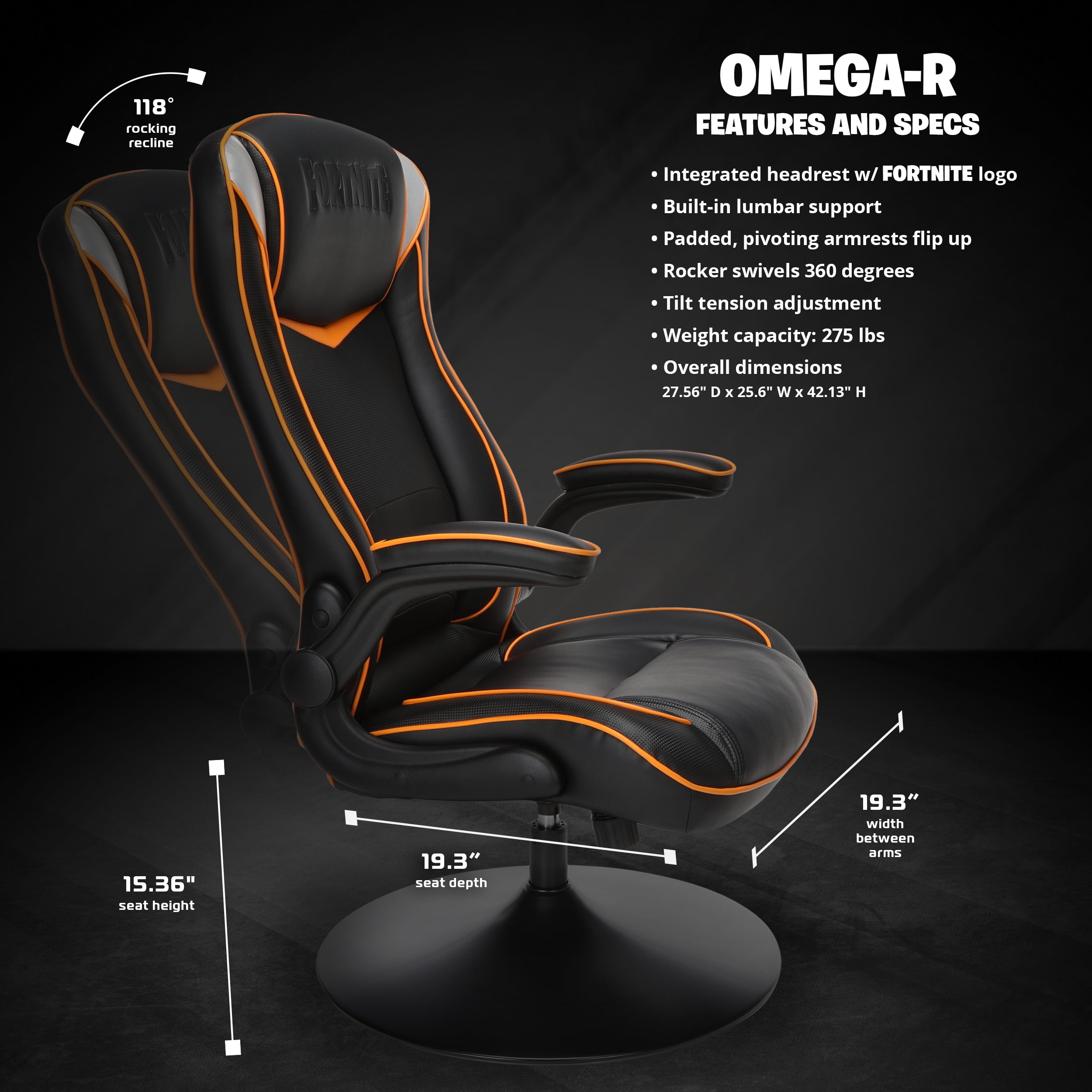 The Fortnite edition Omega-inspired gaming rocker features accents that allow you to rep your favorite outfit along with the Fortnite logo embossed in the headrest The RESPAWN Fortnite Omega gaming rocker is the perfect solution for the console gamer, letting you get lower and closer to the action The rocker features a high back with segmented padding and extra head and neck cushioning because you don’t need to feel like you’ve been gaming all day Padded, pivoting armrests flip up, out of the way, when needed The rocker provides robust built-in lumbar support for long hours in front of the TV This gaming chair was designed with the console gamer in mind to help support you for casual to extreme gaming sessions This gaming chair is covered in stain-resistant materials that provide for long-wearing, extended-use Rocker gaming chair swivels 360 degrees making placement in your gaming room easy The gaming chair features tilt tension adjustment so that you can adjust how easily the chair rocks back to its full 118-degree recline The game chair’s trumpet pedestal base provides sturdy support These gaming chairs measure 27.56″ D x 25.6″ W x 42.13″ H With 25 years of ergonomic workplace furniture experience, RESPAWN builds gaming furniture that is both durable and comfortable