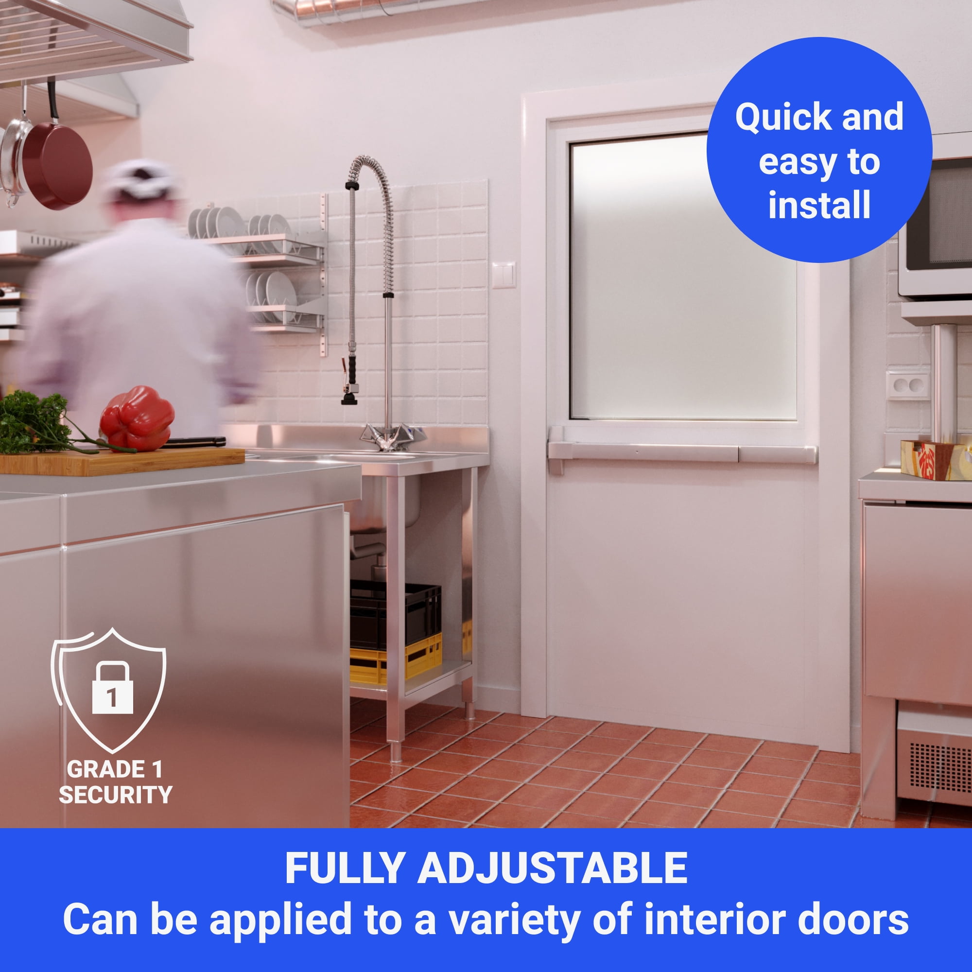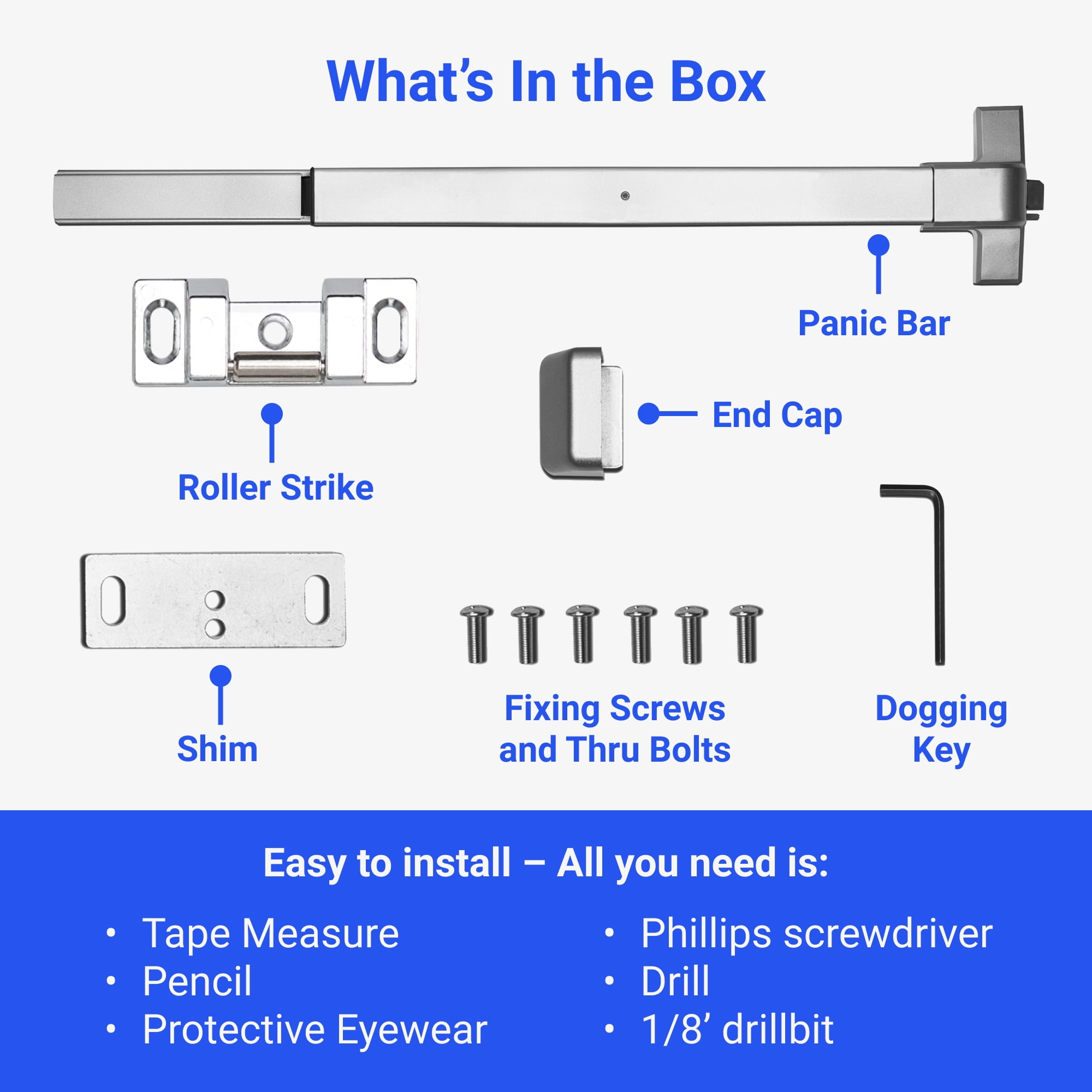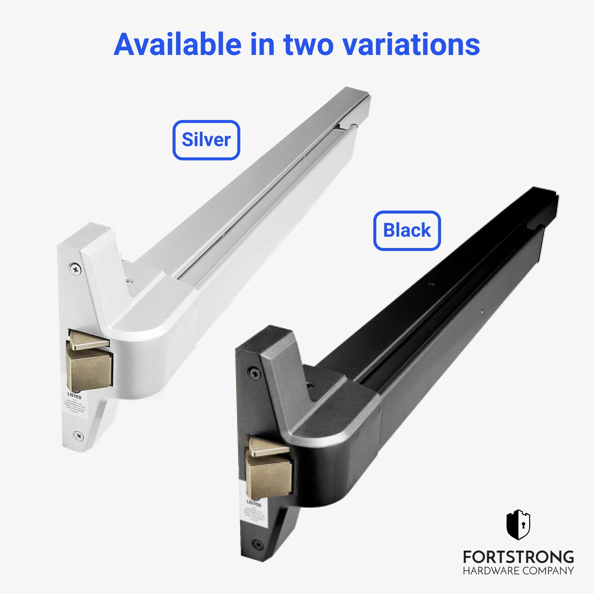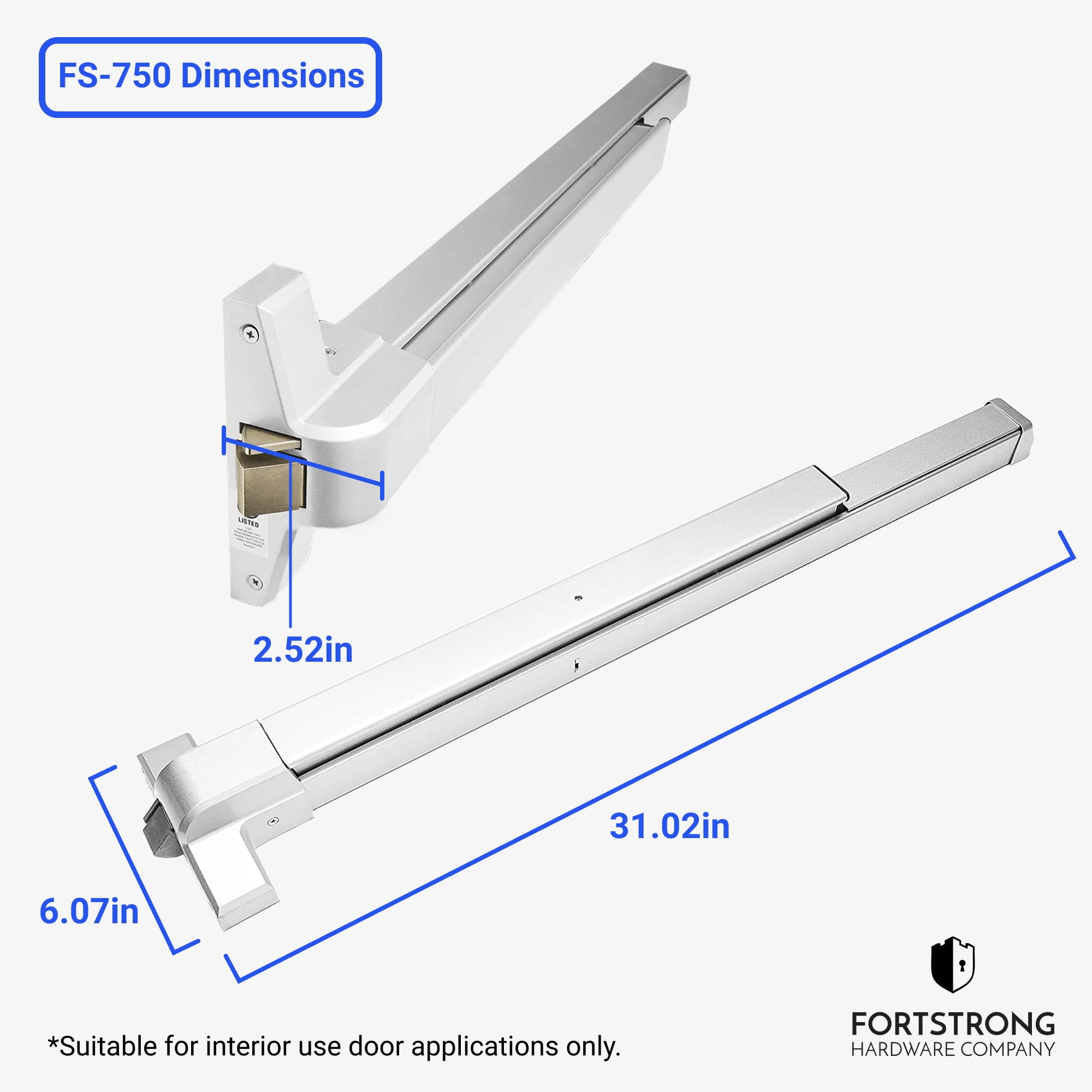 FortStrong FS-750 Series Panic Bar Exit Device – Push Bar for Exit Doors – Aluminium Silver Finish: High-Quality Hardware at a Great Value: Proven to last in over half a million test cycles, Fortstrong’s FS-750 series panic par exit device is grade 1 certified and ADA approved to work in medium to high traffic areas. With our quality aluminum silver finish and reliable hardware, our push bar exit is an incredible product for a great price. Secure & Seamless: Our FS-750 panic door keeps doors in high traffic areas securely and safely closed while providing easy access to authorized persons by using the push bar. Fully Adjustable: Supplied with a reversible roller striker and shim, our exit security bar can be applied to a variety of interior doors whether they’re wood, metal, or composite doors. Easy To Install: Each of our exit door bars comes with a detailed guide that includes a fitting template, saving you time and a trip to the general contractor. Watch our exclusive door push bar installation video for additional instruction. Everything You Need In One Box: Our FS-750 heavy duty commercial door push bar comes with a retractable dogging key, roller strike and shim, fixing screws, and thru bolts. No need for a hardware store run — we’ve got you covered! Suitable for interior use door applications Package Includes: FH-750 Heavy Duty Panic Bar Dogging Key End Cap Fixing Screws Thru Bolts Roller Strike & Shim Fitting Template Fortstrong is the smart choice in home and commercial hardware. 5 Year Limited Warranty
