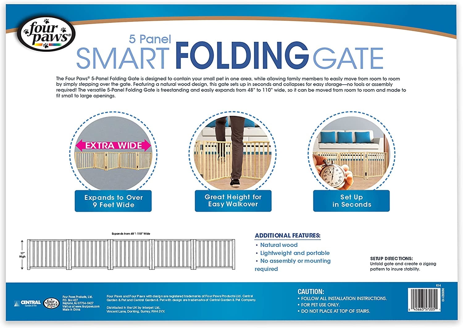 This Four Paws 5 Panel Smart Folding Gate Wood sets up in seconds and can be used on carpet or hard floors. This gate is perfect to easily assemble and remove without any use of tools. Made of attractive real wood, it is the perfect gate to keep small pets out of where they shouldn’t be. Wood gate designed for small pets Easy to set up and move from room to room 17″ high, easy to step over This gate is 17″ high which makes it small enough to easily move around and step over if needed. Each panel is 24″ wide and distance between slats is approximately 2″ apart. Dimensions: 5 Panel Gate Fits openings 48″-110″ Wide x 17″ Tall
