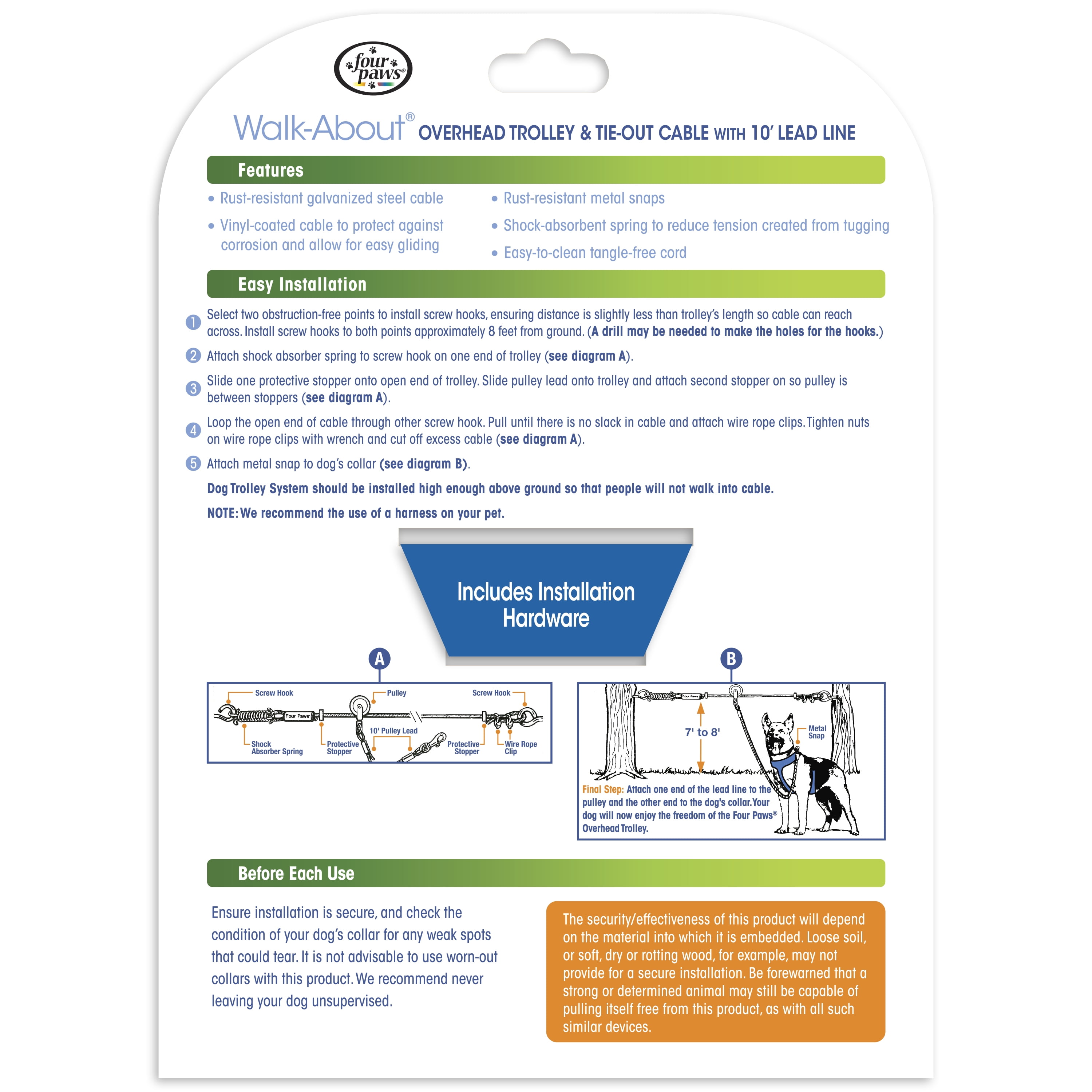Don’t let your fur kid feel cooped up! No fence? No problem! Let your dog safely roam outside with the Four Paws Heavy Weight Dog Run Cable! This tie out cable for dogs allows your fur kid to sniff around, exercise, and explore outdoors while staying safe and contained. The rust-proof dog run cable is made of durable aircraft cable and includes a 10-foot pulley lead. A big dog cable perfect for large backyards and dogs more than 50 pounds.