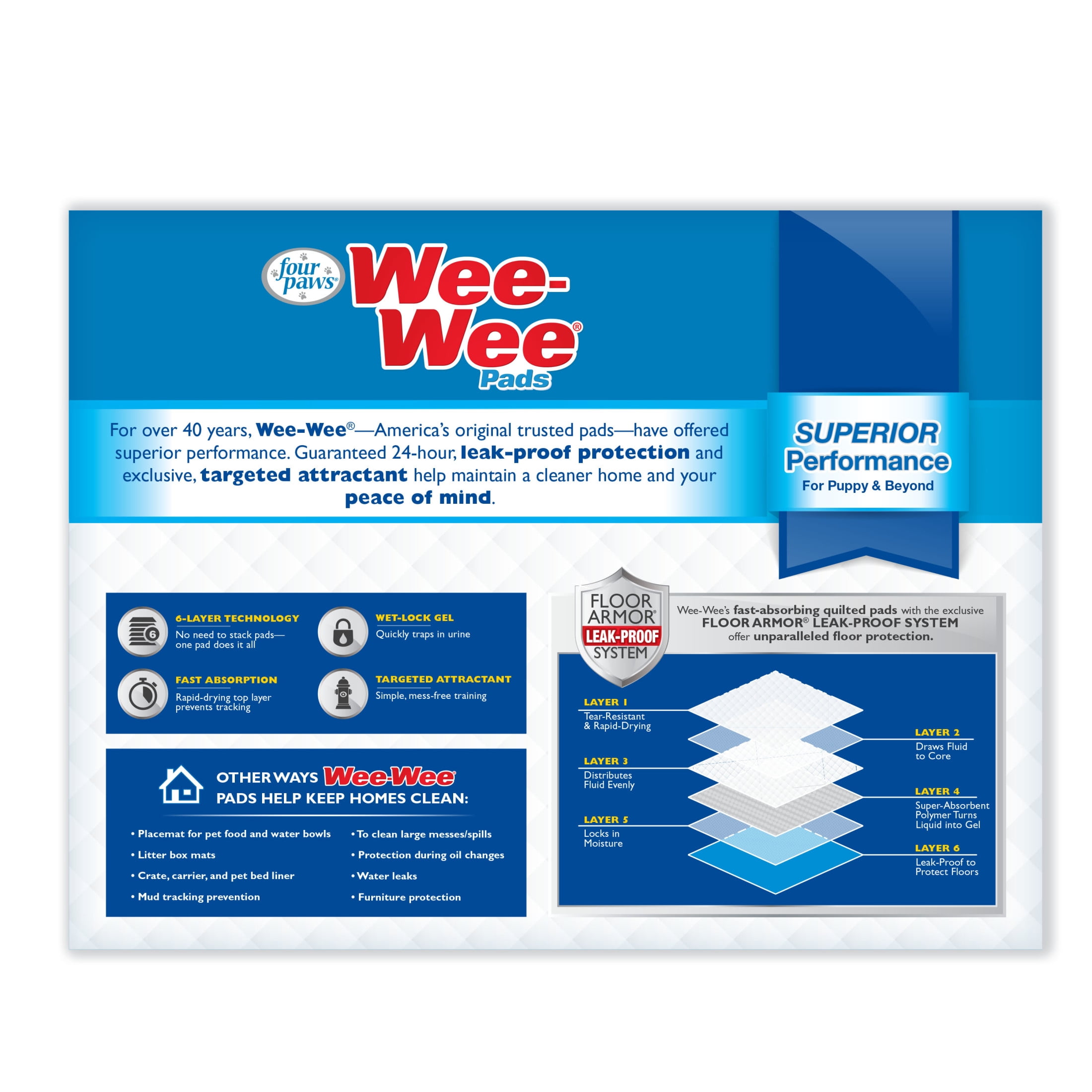 Four Paws Wee-Wee Dog Training Pads, 200-Pack Box: Wee-Wee Pads are more absorbent than ever with a 6-layer Floor Armor leak-proof system Oversized quilted pockets on dog pee pads allow for maximum absorption Pee pads contain wet-lock that quickly traps 22″ x 23″ dog training pads intended for canines of all sizes Dog training pads guaranteed to work or your money back No need to stack pads, 1 pad gets the job done Thick quilted pads for unparalleled floor protection Suitable for both puppy training and senior dogs Completely neutralizes ammonia odors Targeted attractant for simple, mess-free training Refreshed new packaging still allows you to recognize the Four Paws brand Pack of 200 dog Wee-Wee pads
