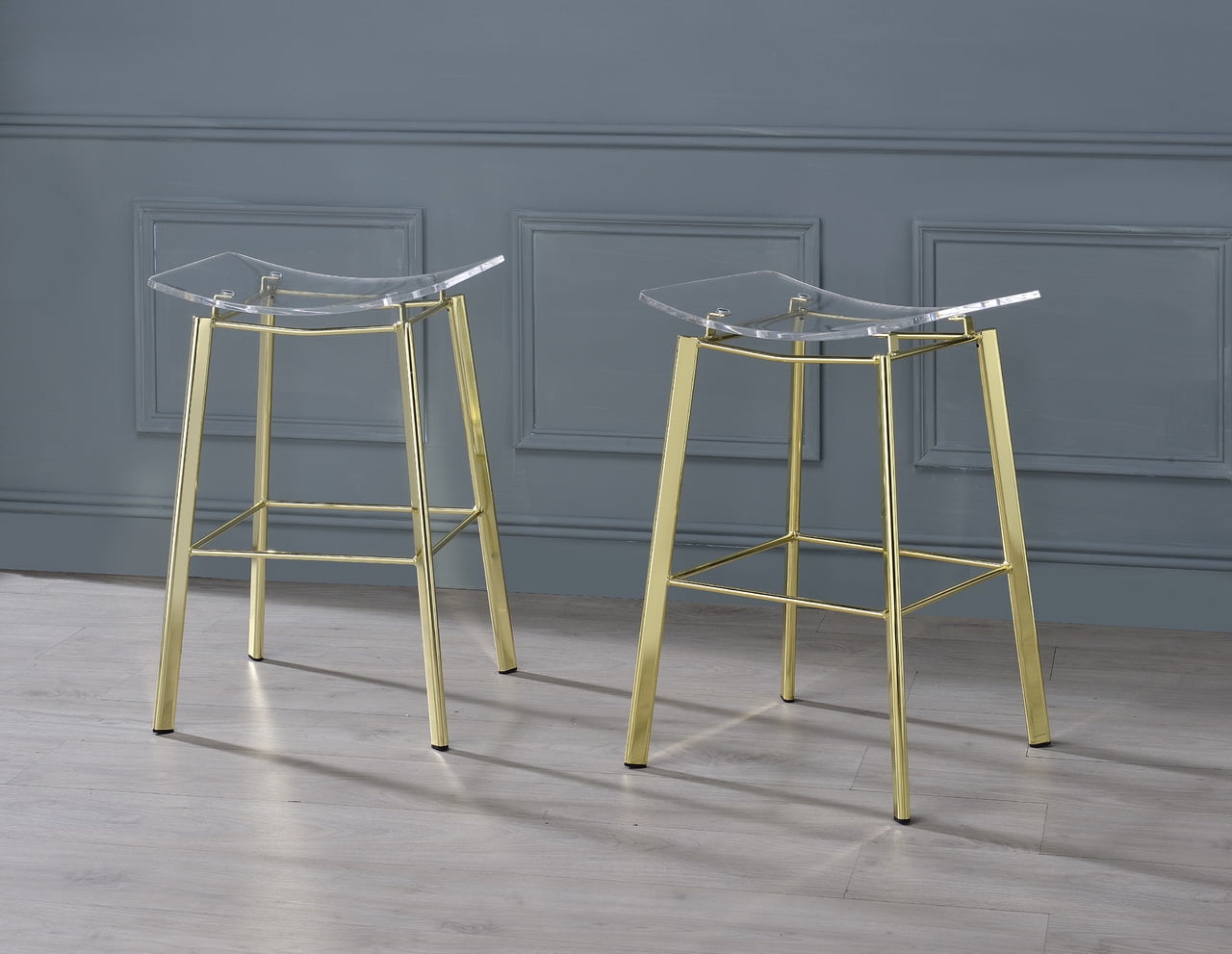 Fox Hill Trading Pure Decor Metal Barstools Saddle Seat Clear (Set of 2) Dimensions: 16.5W x 16D x 25H in.; Seat height: 24 in Acrylic saddle seat paired with a sturdy metal frame Set includes 2 stylish bar stools Available in a variety of finishes to match your decor Contemporary design ideal for modern spaces