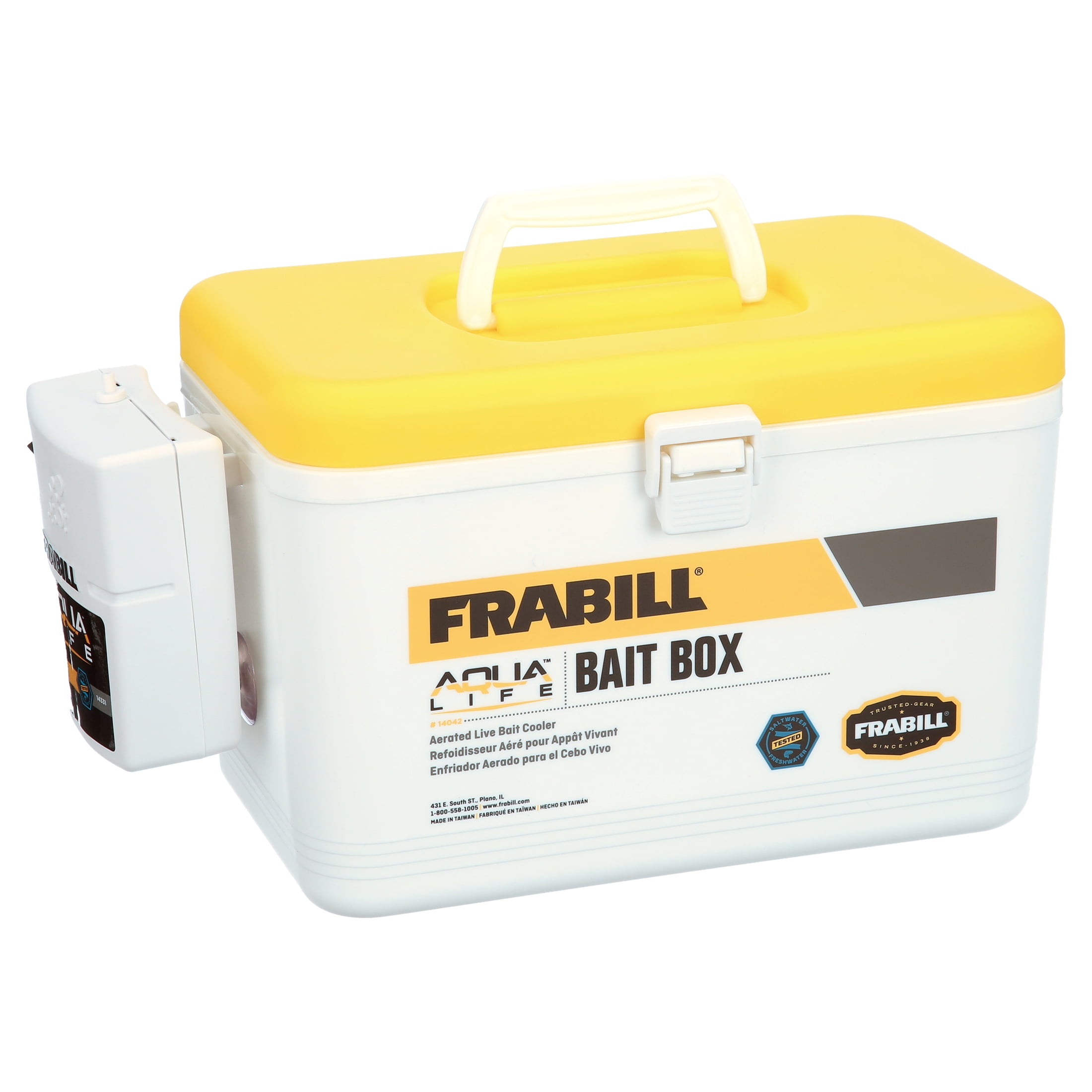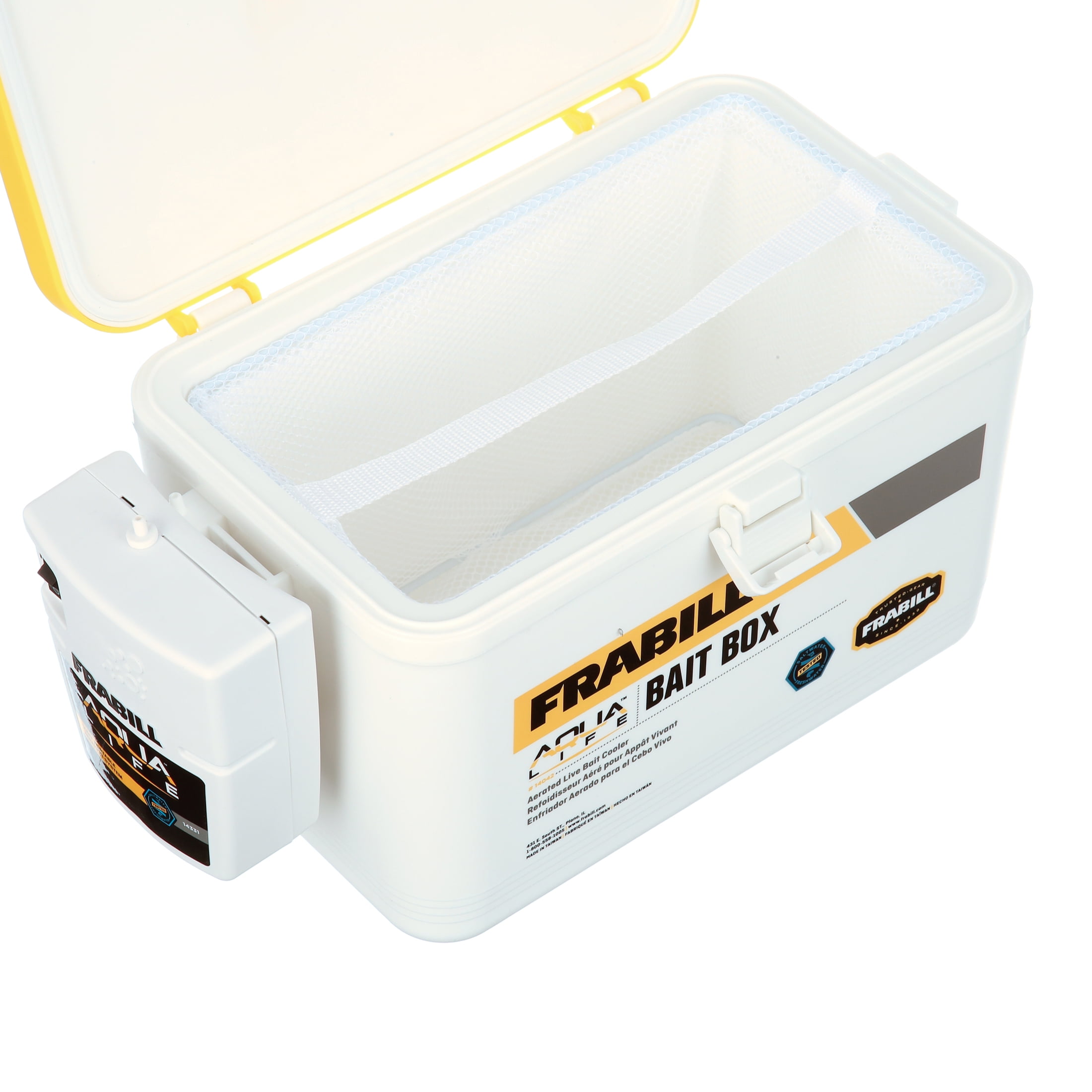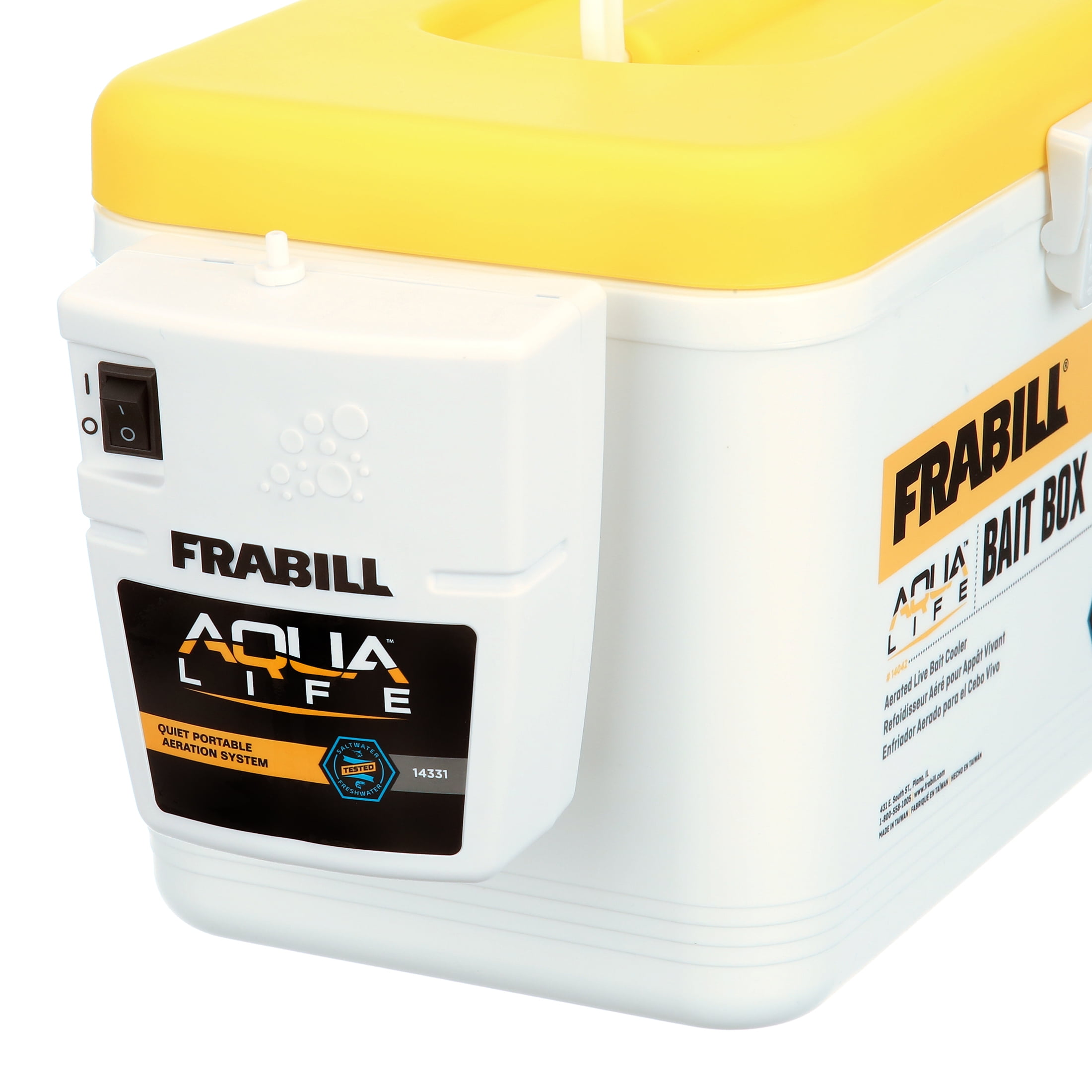 For keeping bait alive and accessible Aerator pumps in oxygen and helps bait be healthy and active Durable insulation Net liner 8 qt Frabill aerator features a lid latch Frabill is the leader in bait management systems and offers an expanded line of live bait containers, aerators, traps, tools and accessories Whether you’re fishing inland or offshore, using minnows, mullet, crayfish, leeches or crawlers, Frabill has everything you need to be armed and ready for the day Made for saltwater bait Oxygen rich Prevents spilling or tipping over bait Keeps bait healthy