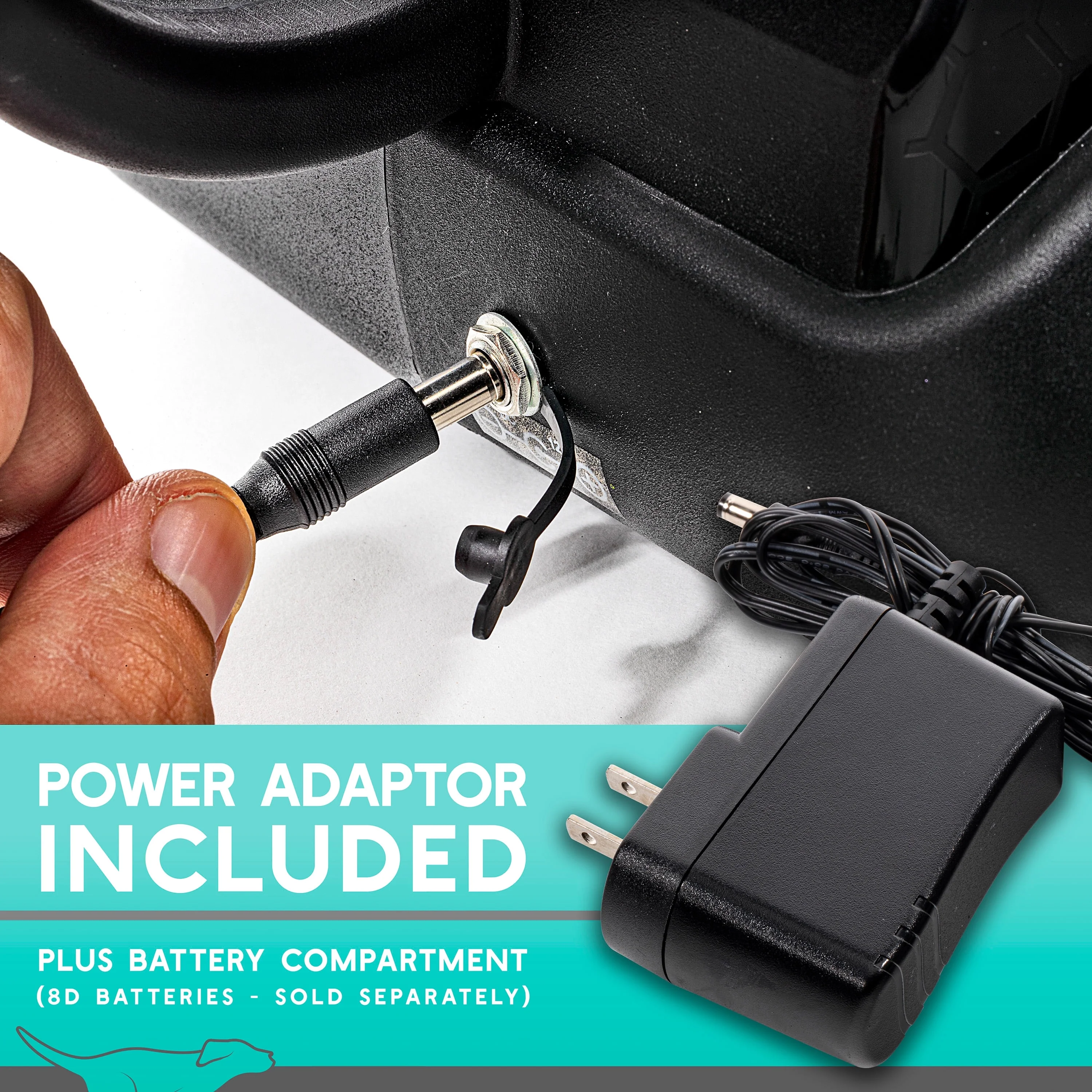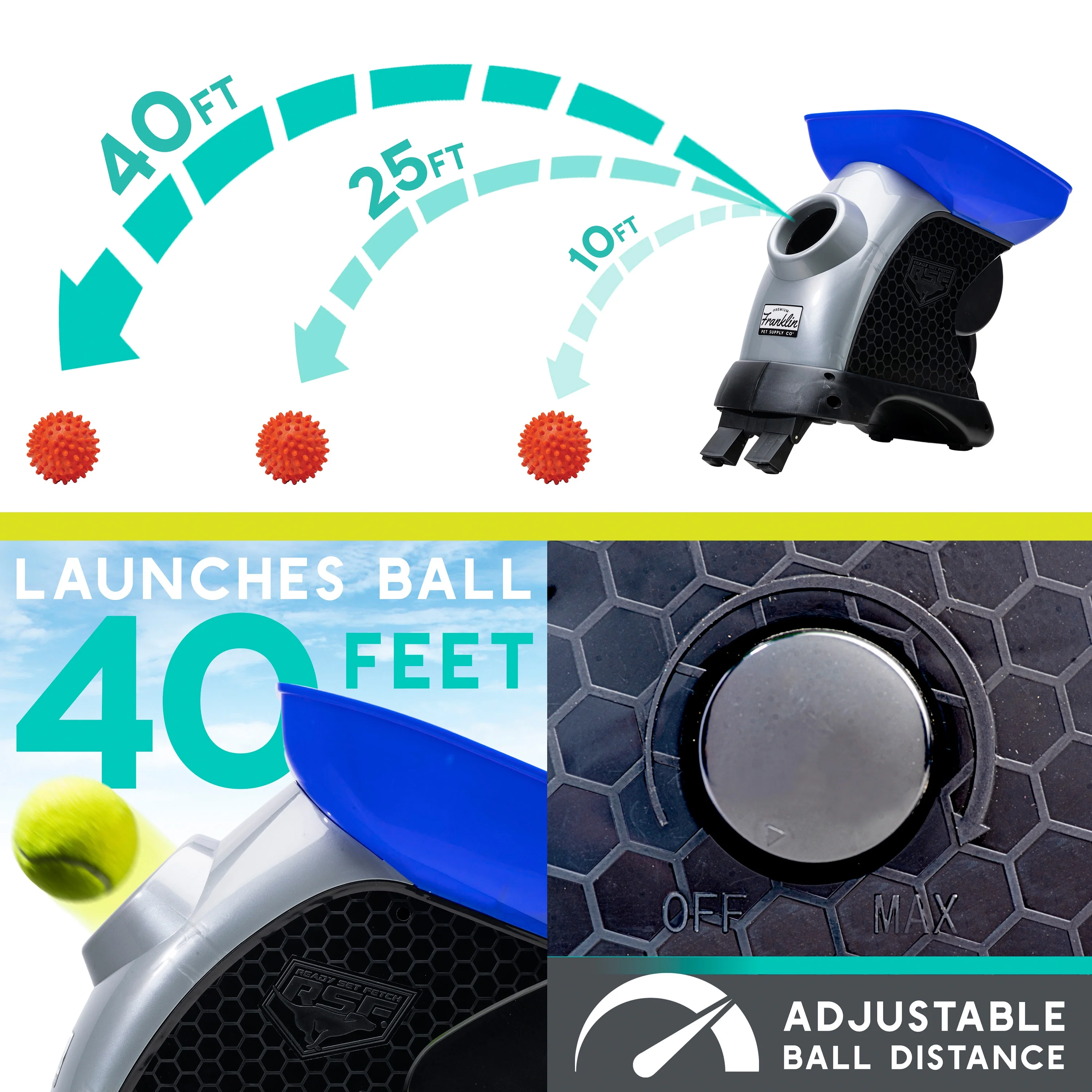 READY SET FETCH: Automatic tennis ball launcher that will provide your dog with continuous interactive play. Can be used with all brands of tennis balls POWER ADAPTER INCLUDED: Play with no end in sight. No batteries needed. Just plug and play. Also features a battery compartment for [8] D size Alkaline Batteries (sold separately) SAFETY: Set the motor dial to the desired distance. When the ball is preparing to fire there is a safety mode alerting your pet the ball is about to launch. This sound feature can be turned on and off. ADJUSTABLE FEET: Change the angle of the launch in 3 positions for added flexibility INCLUDES: 1 standard non-abrasive tennis ball and 1 specially designed all weather launcher ball! Use the launcher ball to launch up to 50+ feet even when slobbery and wet!