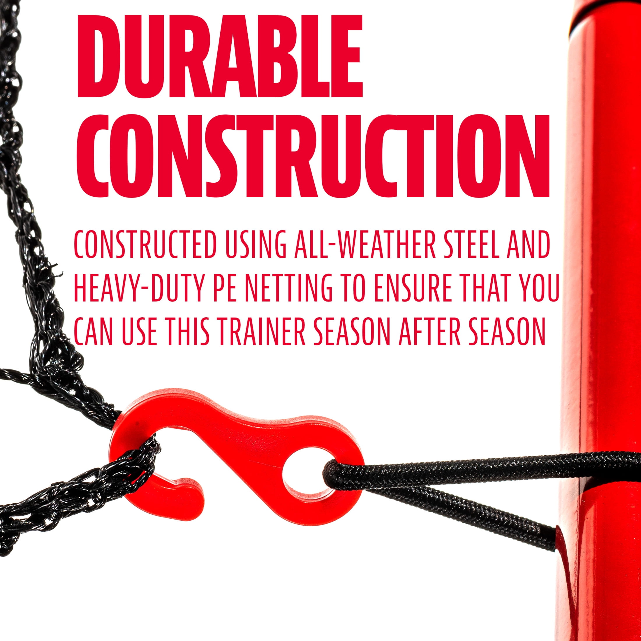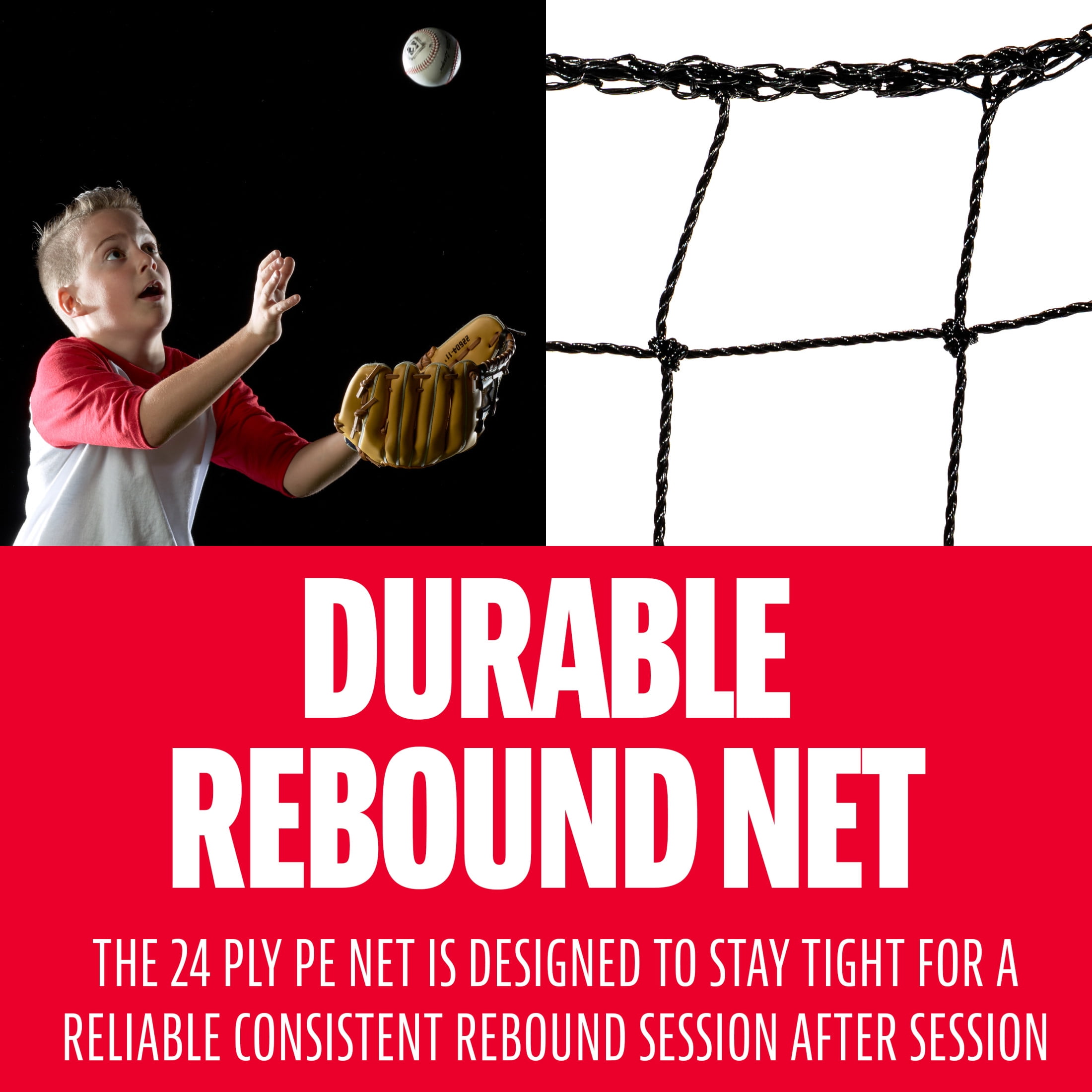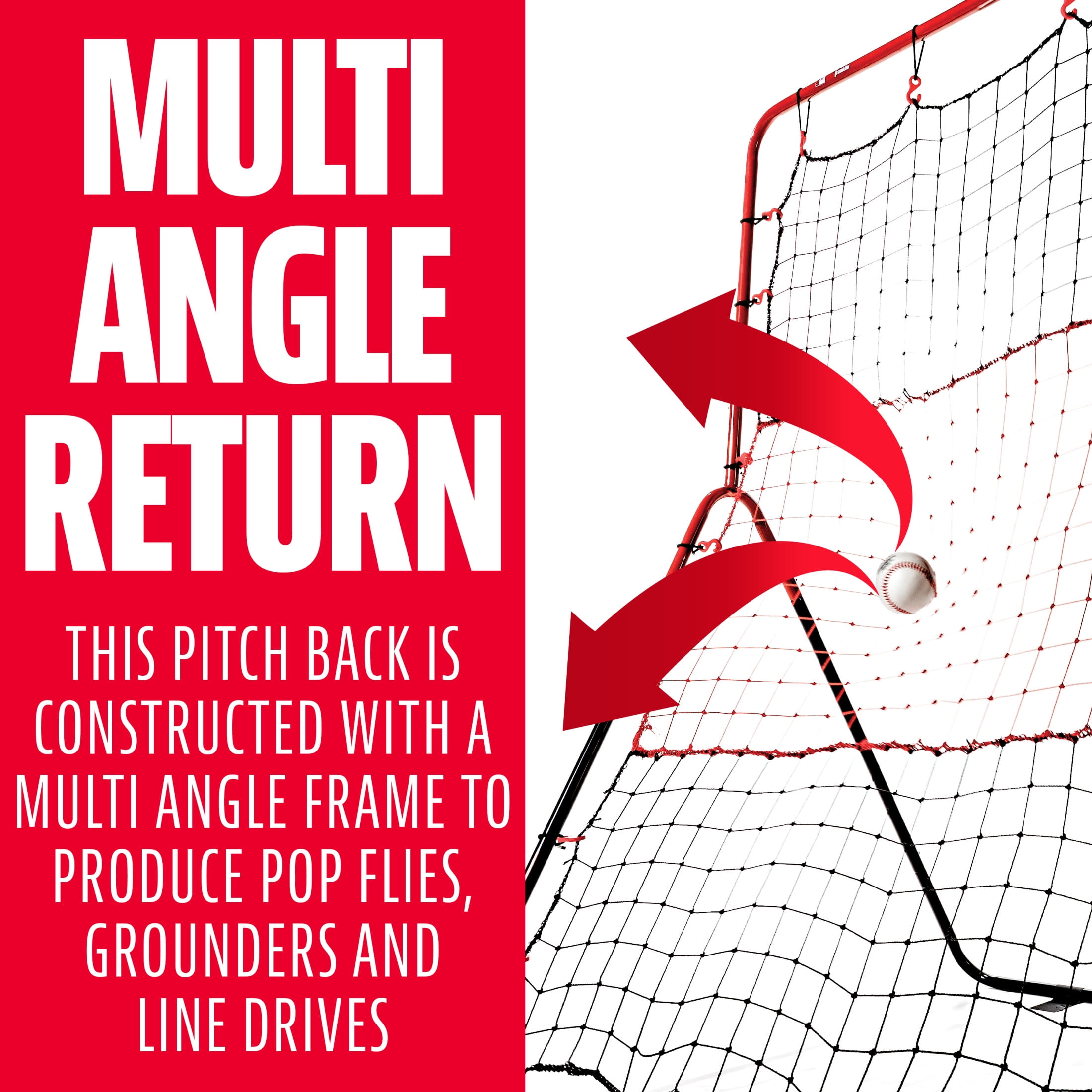 MULTI-ANGLE RETURN: This pitch back is constructed with a multi-angle frame to produce pop flies, grounders and line drives. INTEGRATED STRIKE ZONE: Work on mastering accuracy and pitching skills by using the integrated strike zone. No catcher needed, just rear back and hit your target! ALL WEATHER STEEL CONSTRUCTION: Constructed with 3/4″ inch weather resistant steel piping to ensure it can stand up to heavy use year after year! HEAVY DUTY NET: The 24 ply PE net is designed to stay tight for a reliable consistent rebound session after session! PERFECT FOR YOUTH BASEBALL: This rebounder is the perfect training tool for any Little Leaguer to practice throwing, pitching, fielding and more!