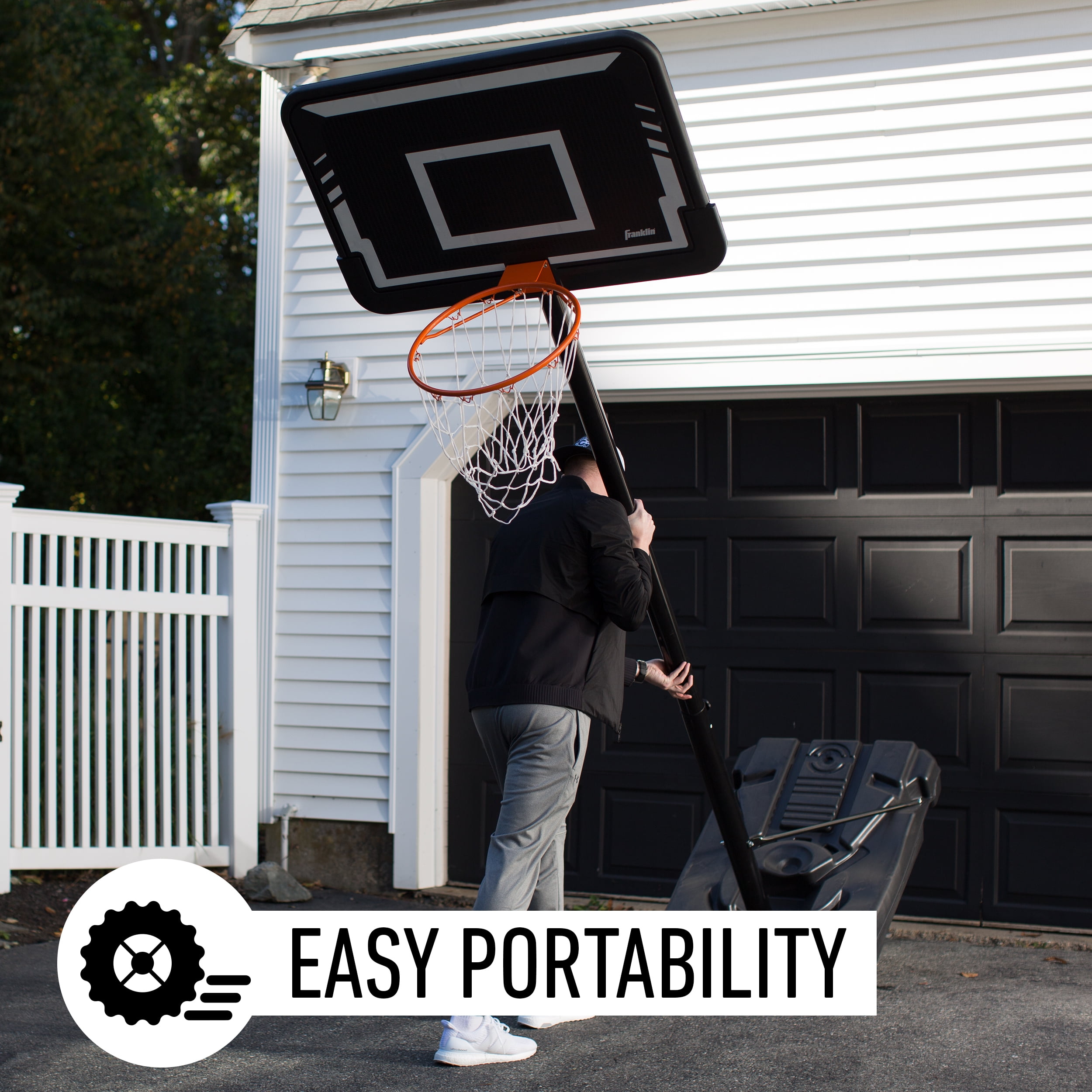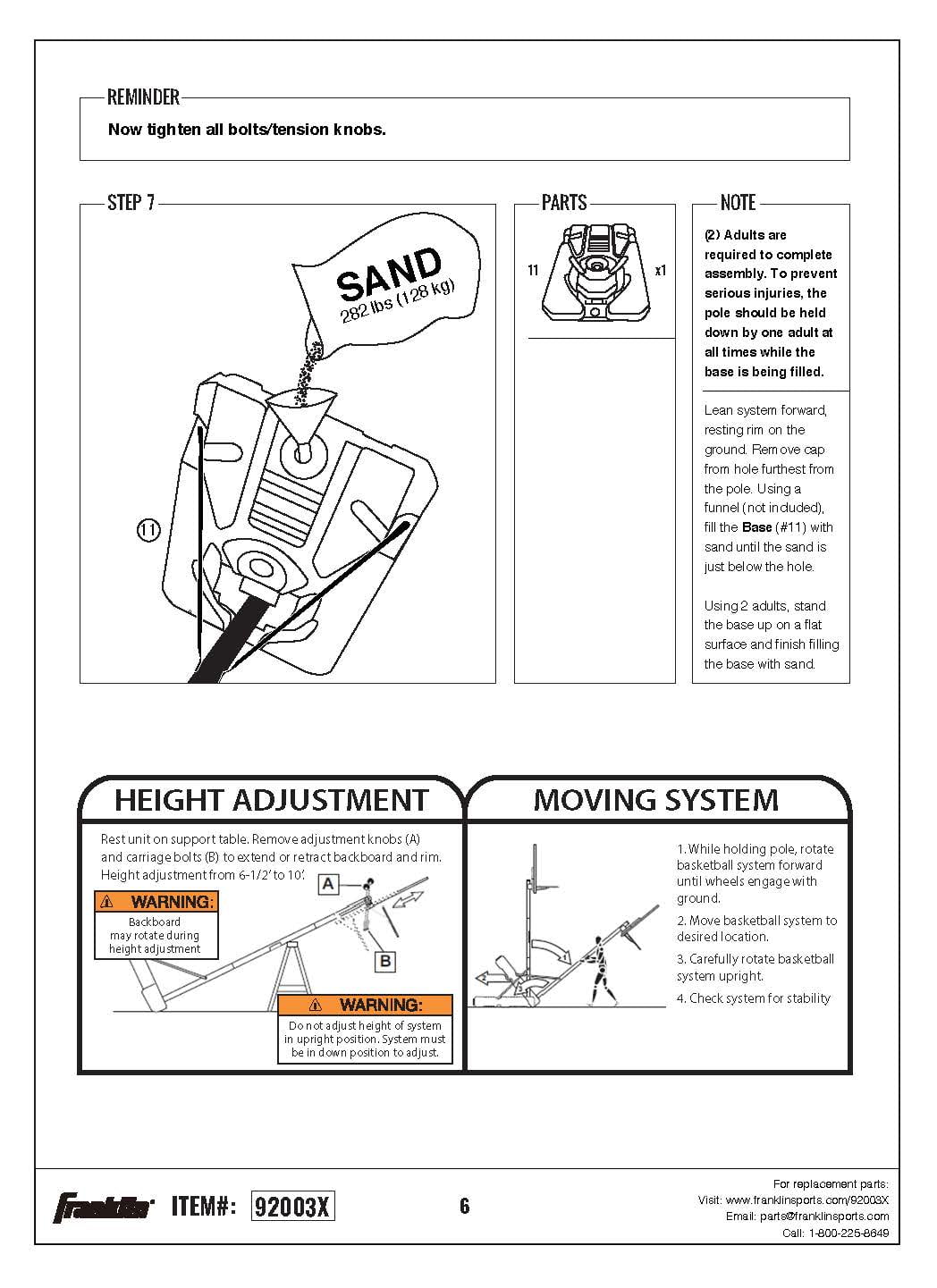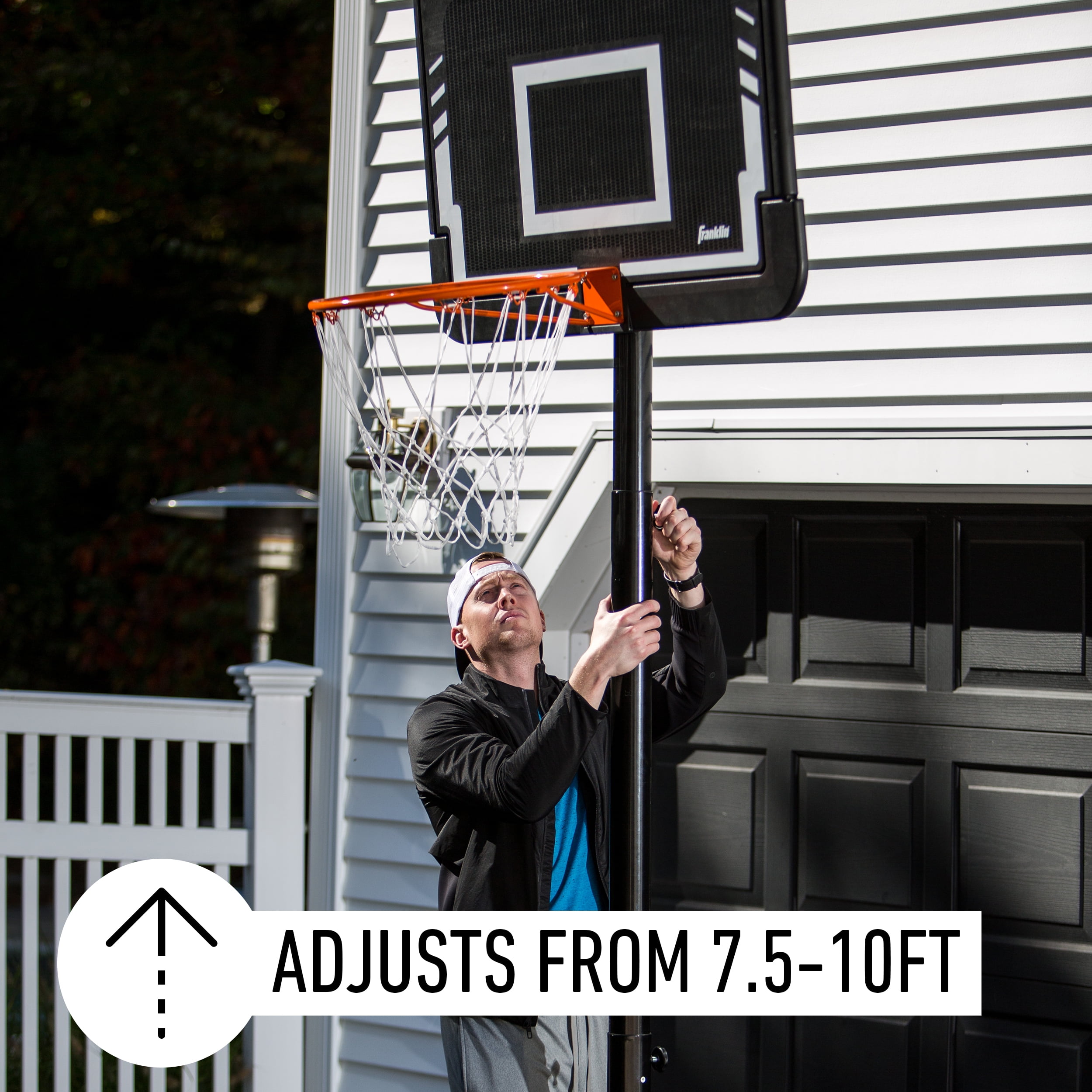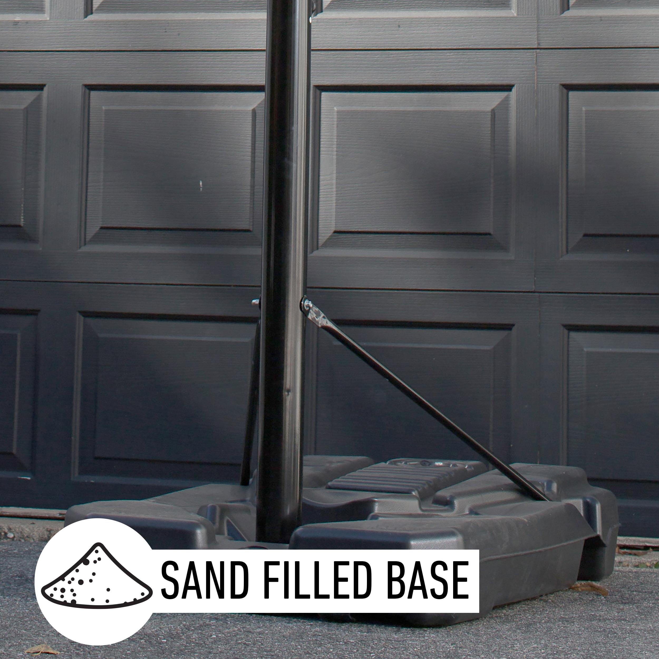 BUILT TO LAST: 44-inch injection molded backboard is practically unbreakable, 18-inch solid steel rim is made for the wear and tear of the game ADJUSTABLE: Telescoping mechanism allows hoop to adjust from 7.5 to 10-feet in 6-inch increments PORTABLE: 24-gallon base fills with sand and can easily be rolled to your desired location WEATHER RESISTANT: All-weather resistant, designed to withstand the harshest elements with no problem!