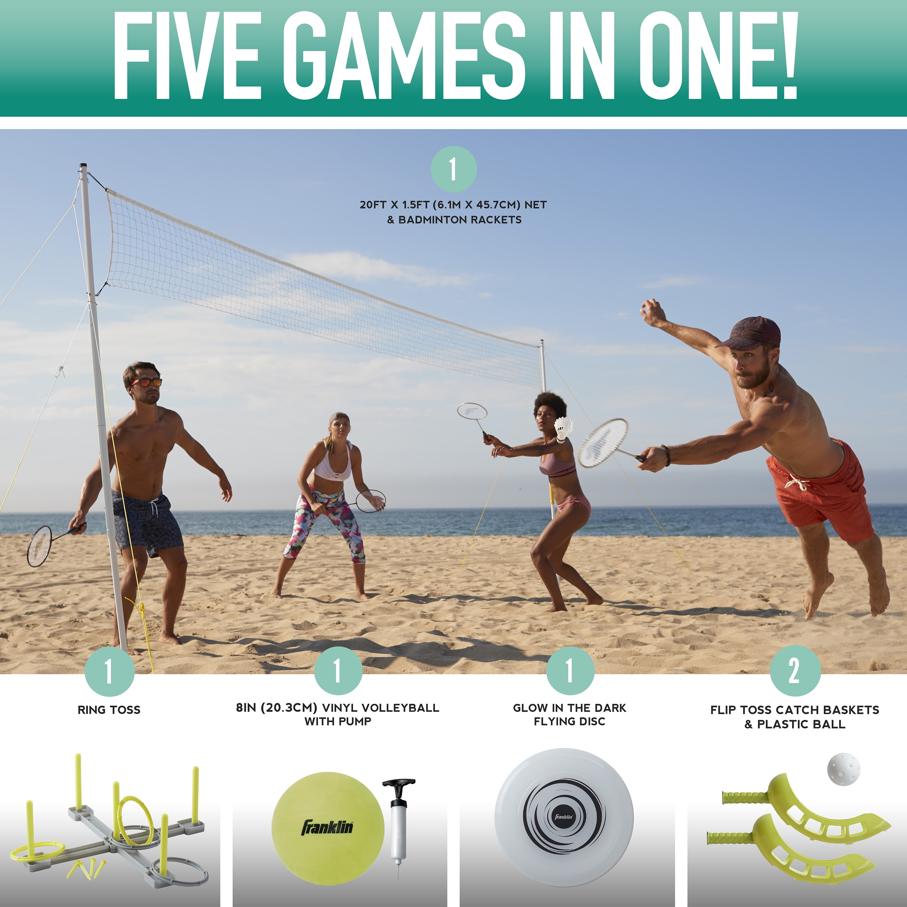 Franklin Sports Fun 5 Outdoor Games Combo Set for Beach + Backyard: 5 GAMES IN ONE: This 5 game combo set has everything kids need for a fun day at the beach, the park, or your next outdoor gathering! VOLLEYBALL + BADMINTON: This set comes with a full size 20′ foot wide, 5’1″ high net for volleyball + badminton. It also comes with a volleyball, (2) rackets, and (1) birdie so you have everything you need to play FLIP TOSS: The flip toss game comes with (2) flippers and (1) plastic ball so you can add some fun to your classic game of catch RING TOSS: Includes a full ring toss set with (4) plastic rings, target and (4) grounds stakes to secure the target to the ground FLYING DISC: Toss around the glow in the dark flying disc for some classic outdoor fun