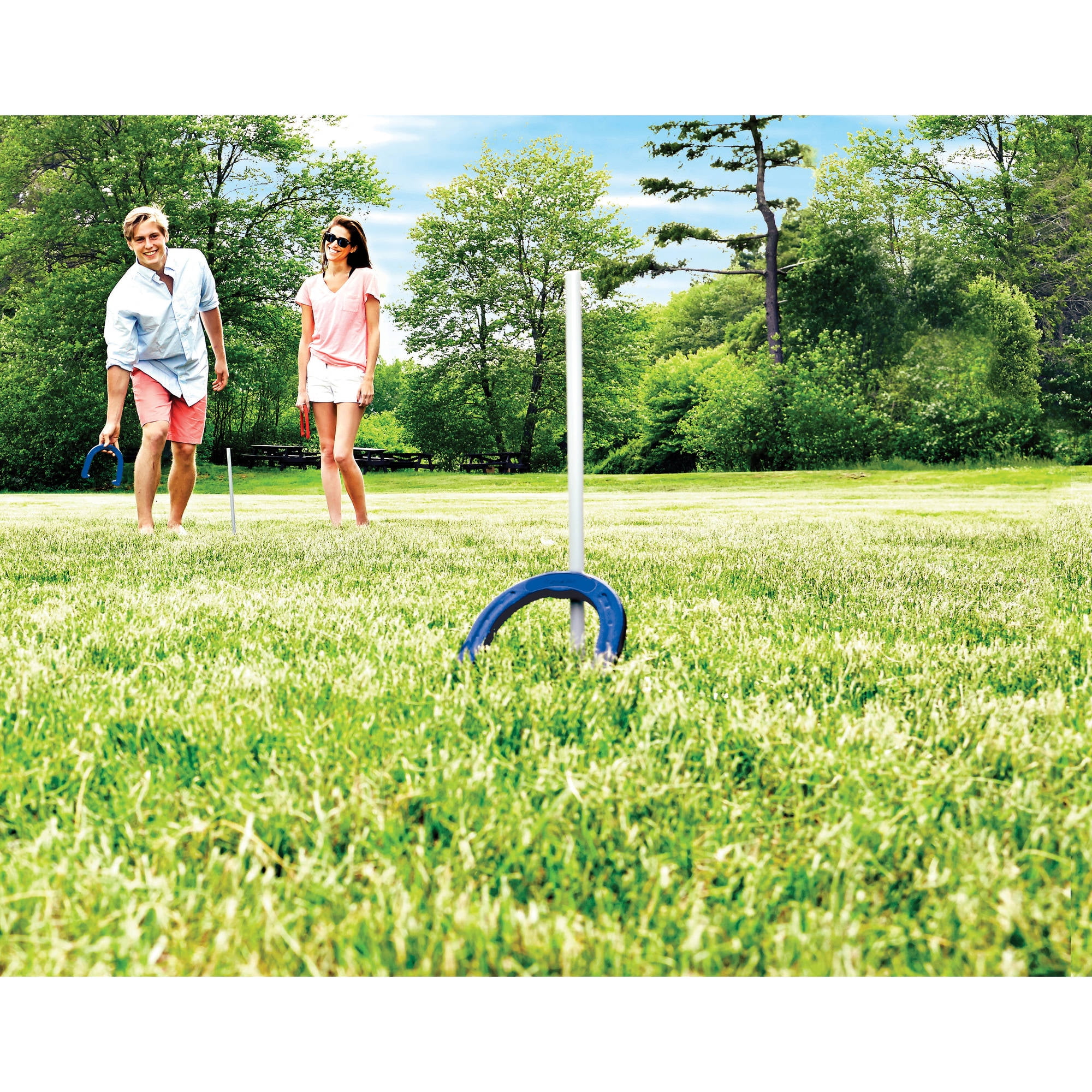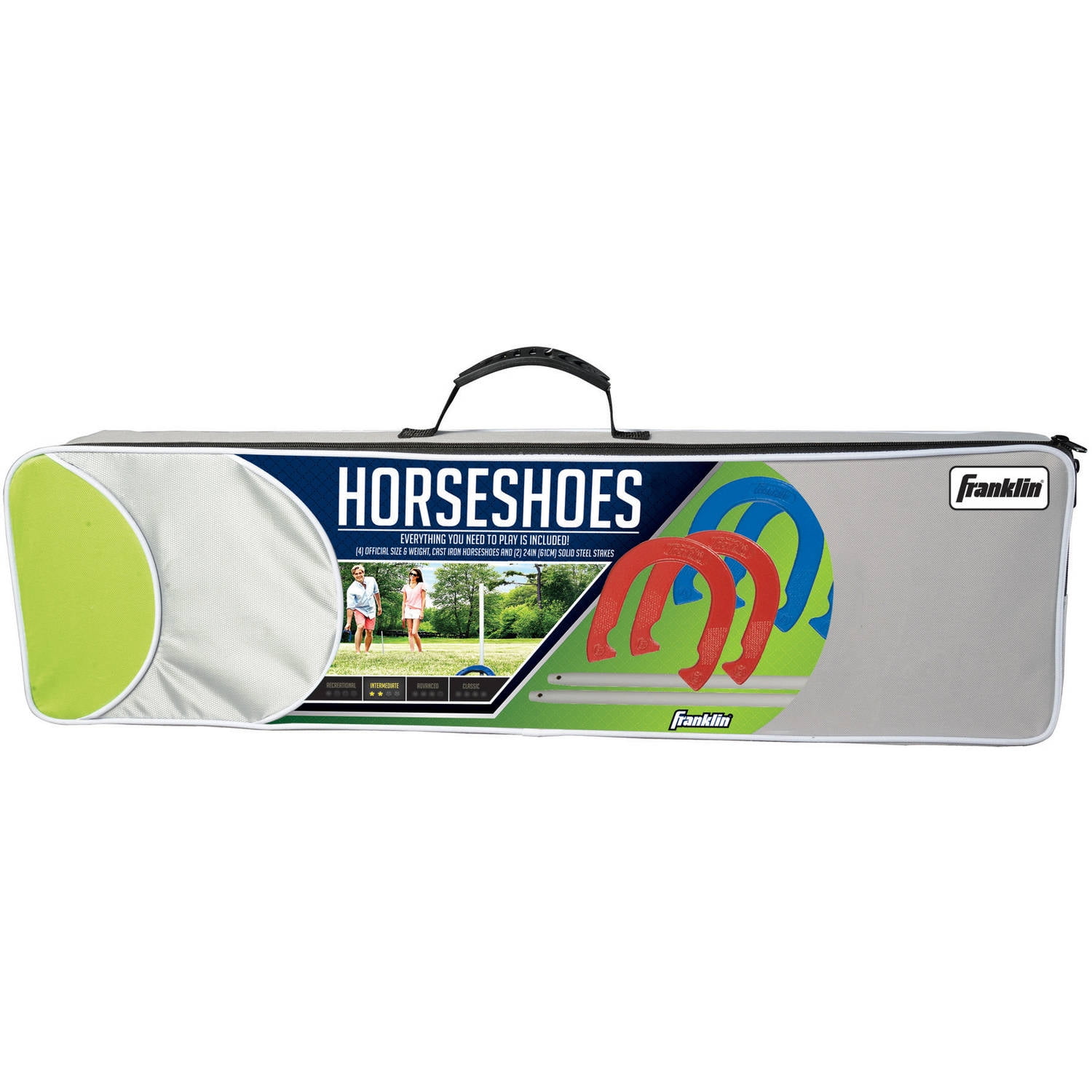 Franklin Sports Intermediate Horseshoe Set: 4 official size and weight powder-coated carbon-steel horseshoes, 2 blue and 2 red Stakes: two 24″ solid forged steel stakes Steel horseshoe set package: traditional carry bag Easy-to-use Franklin horseshoe set Portable Use in the yard or take to the beach Offers hours of family-friendly fun Durable and high-quality components