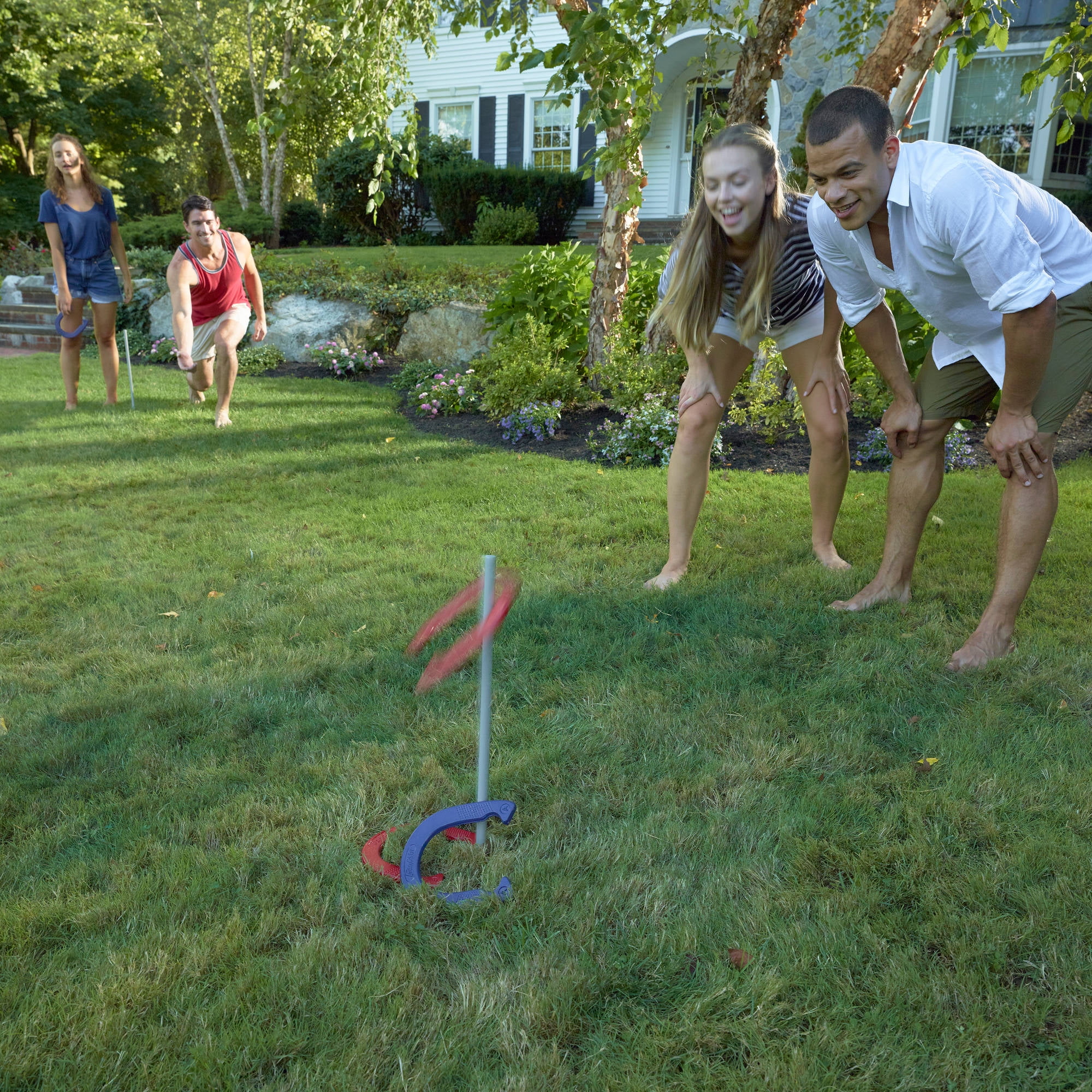 This Franklin Sports Intermediate Horseshoe Set makes a wonderful addition to any household collection of outdoor lawn games. Horseshoe is one of the world’s only games where “close” actually counts for points. This set is ideal for anything from backyard family fun to a quick and relaxing game at the beach. This tournament-quality official horseshoe kit includes four official size and weight powder-coated carbon-steel horseshoes, which are extremely durable and meant to withstand weather conditions without a problem. Two of the horseshoes are blue and two are red for easy scorekeeping. This steel horseshoe set also includes two 24″ solid forged steel stakes that you can easily plant in the sand or in the grass. This Franklin horseshoe set comes complete with a traditional carrying bag, so you can take the fun almost anywhere. This game is sure to provide you and the family with a joyful and relaxing activity on your next outdoor adventure.