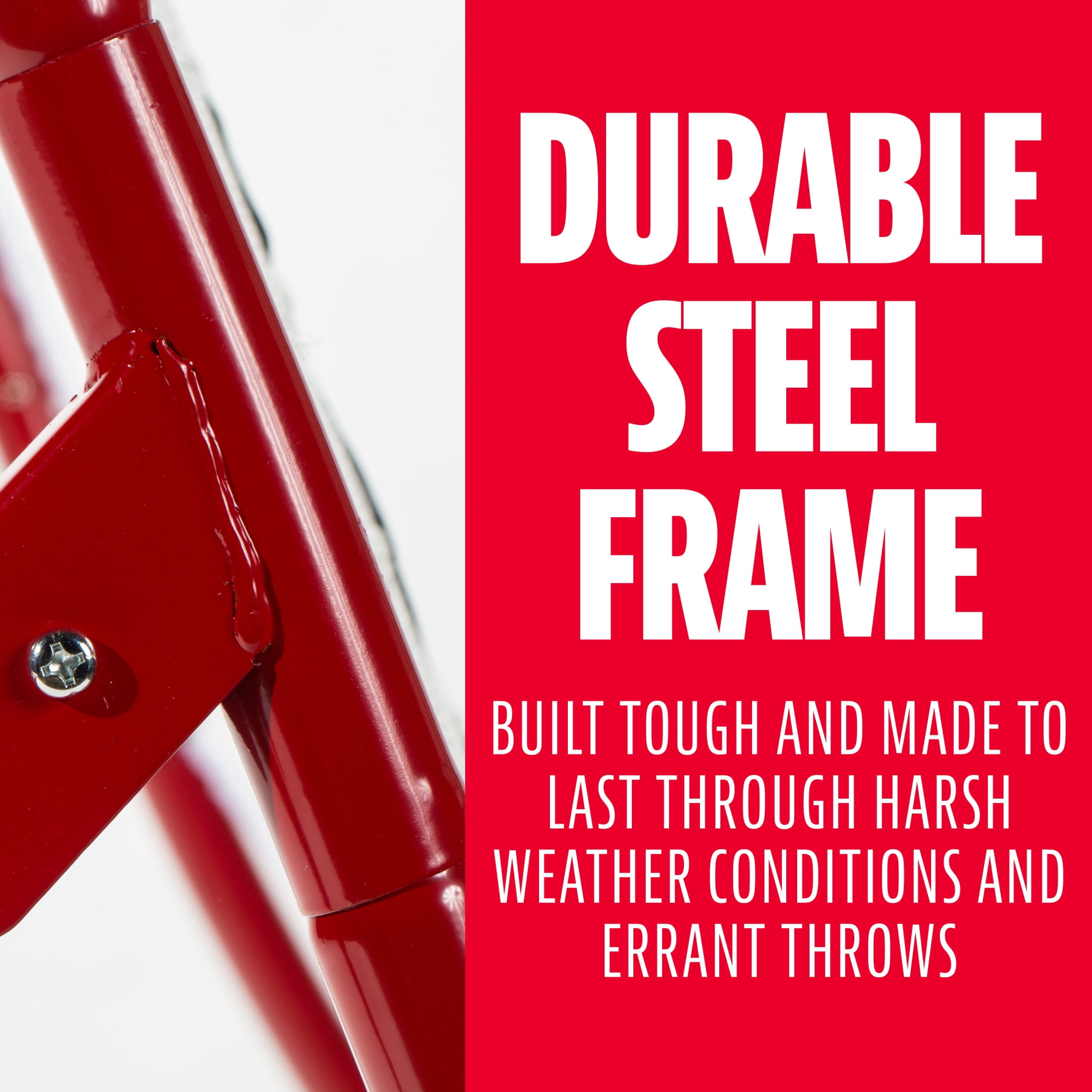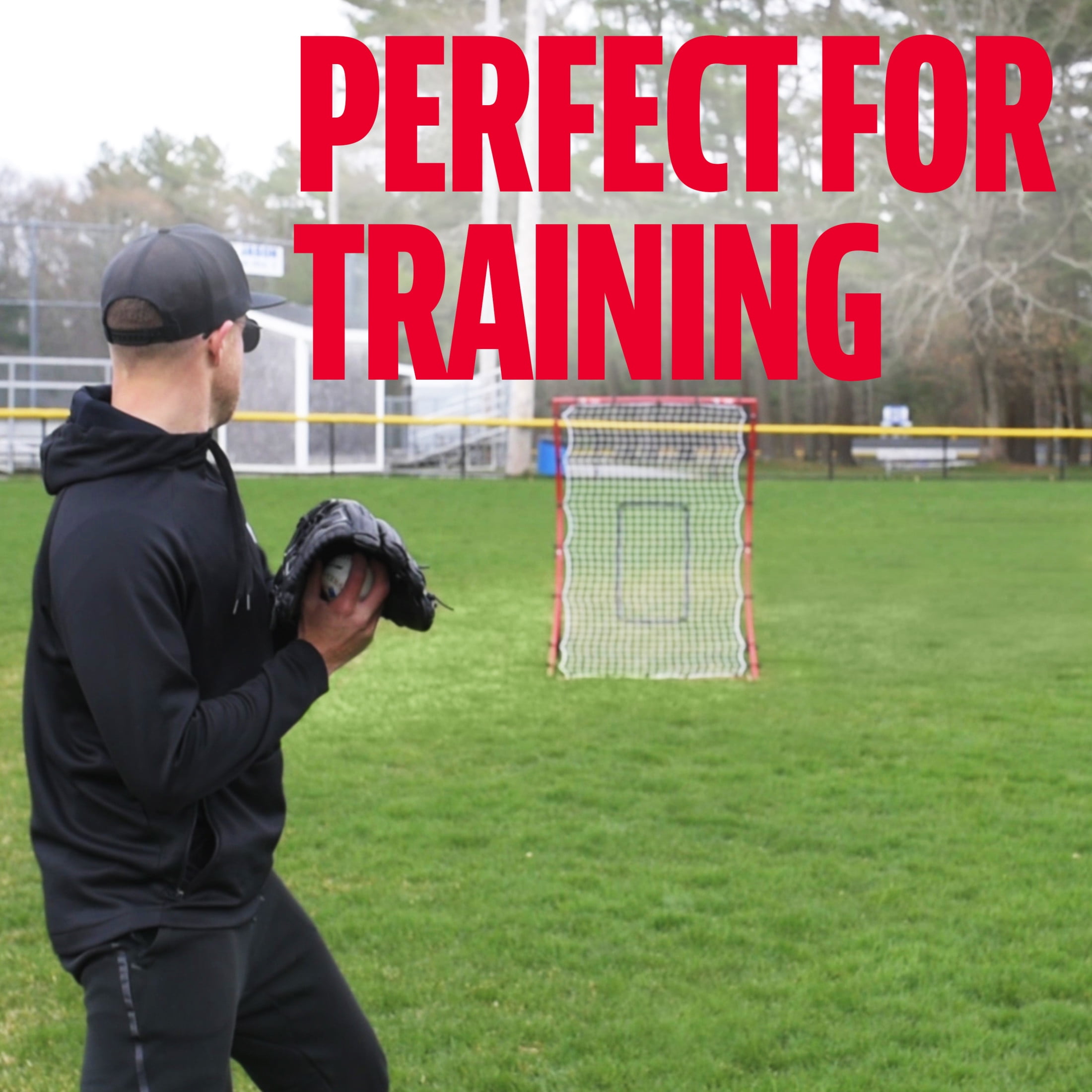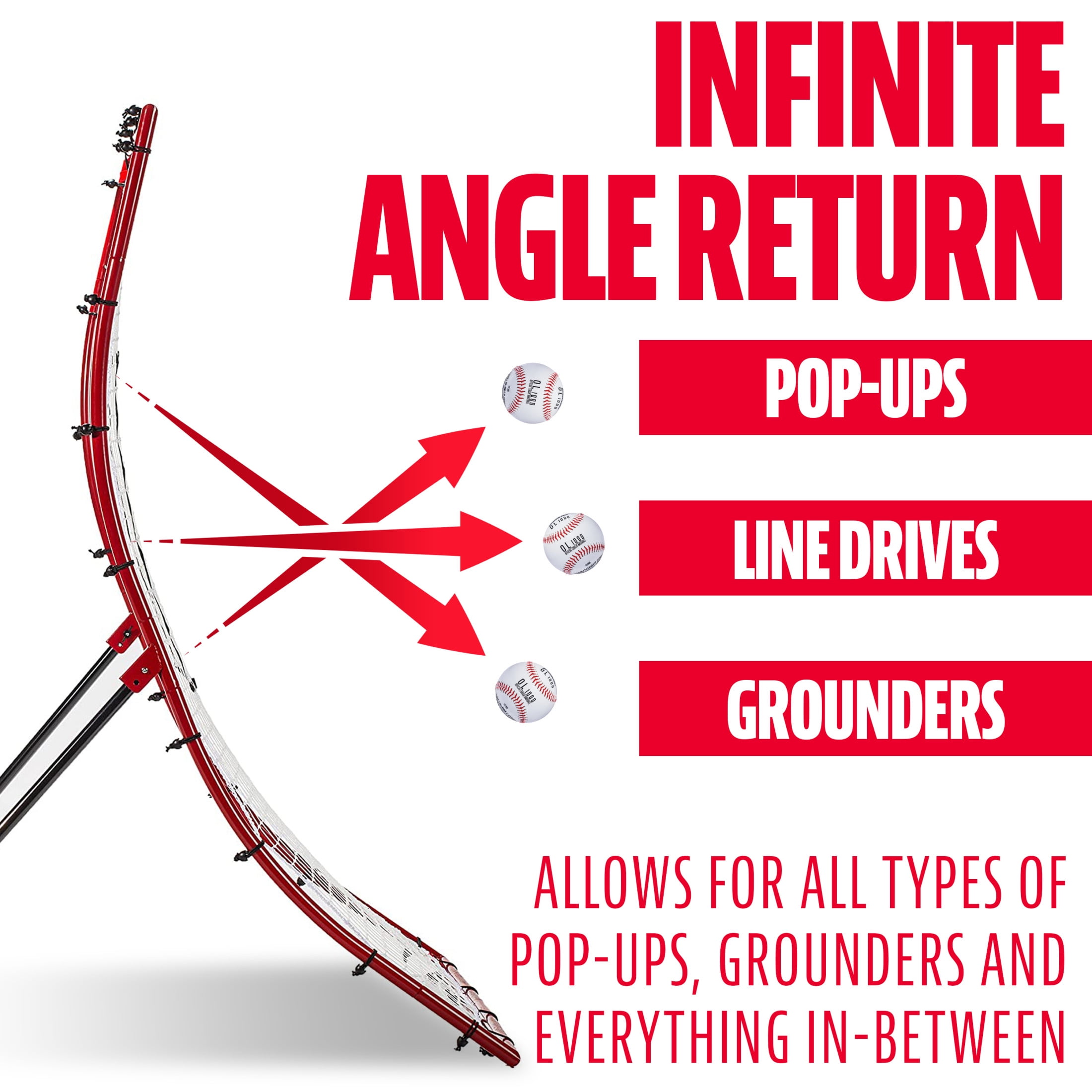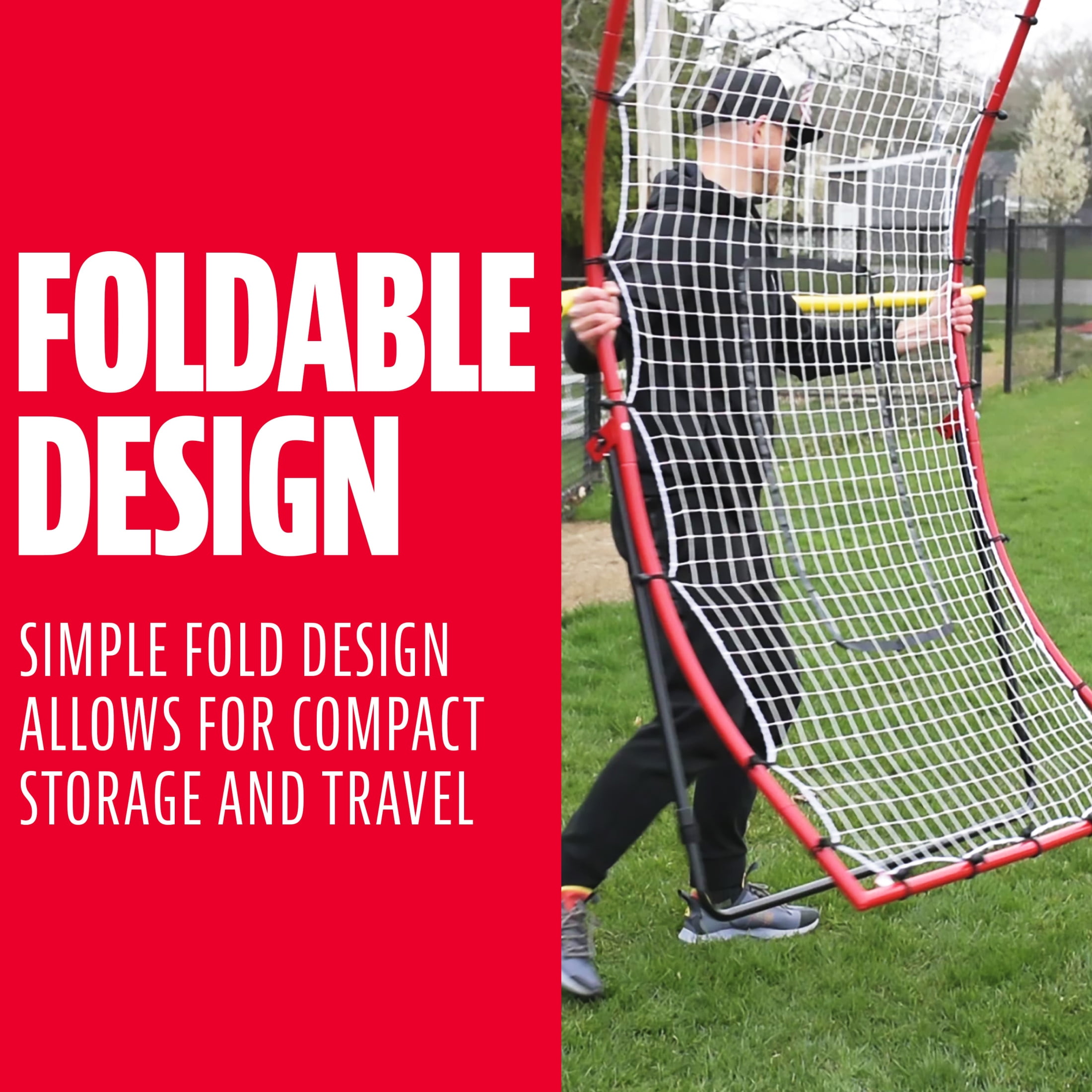 ALL-WEATHER NET: Neither spring rains nor summer heat will shred or tear the durable all-weather netting of this baseball trainer. Practice return baseball skills with ease and greater accuracy with a pitchback net that lasts UNIQUE CURVED DESIGN: Practice fielding techniques without needing someone else to hit pop-ups or grounders ADJUSTABLE ANGLES: The curved, adjustable legs allow for maximum return angles for improved practice and field performance DURABLE STEEL FRAME: Although this baseball training net is designed for all types of weather, you can fold up the durable steel frame for easy storage when not in use. Enjoy years of reliable practice with this pitching net PRACTICE FIELDING TECHNIQUES: All players will enjoy using this sturdy, solid, and reliable flyback net. In addition to its steel frame, it also comes with ground stakes for greater stability, throw after throw