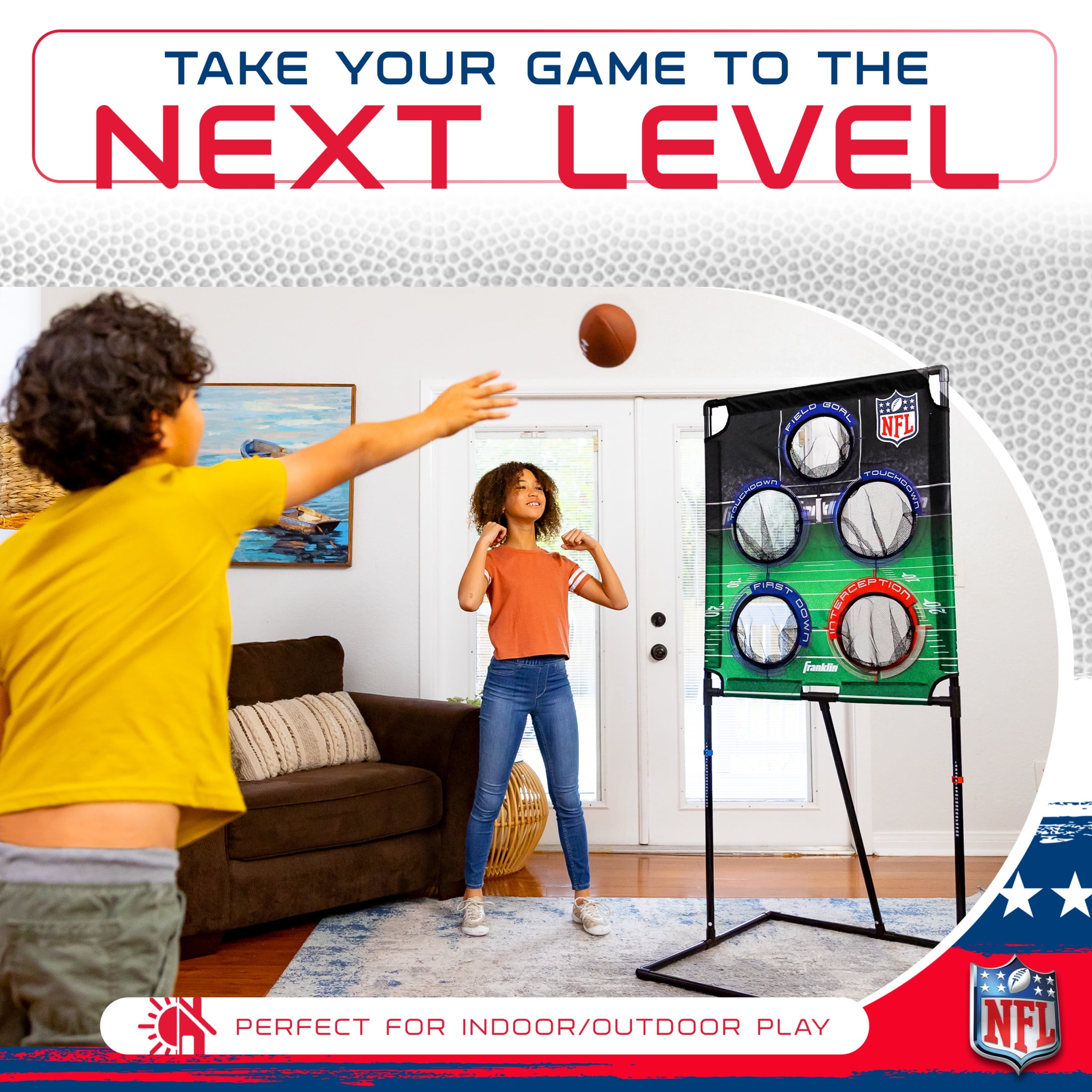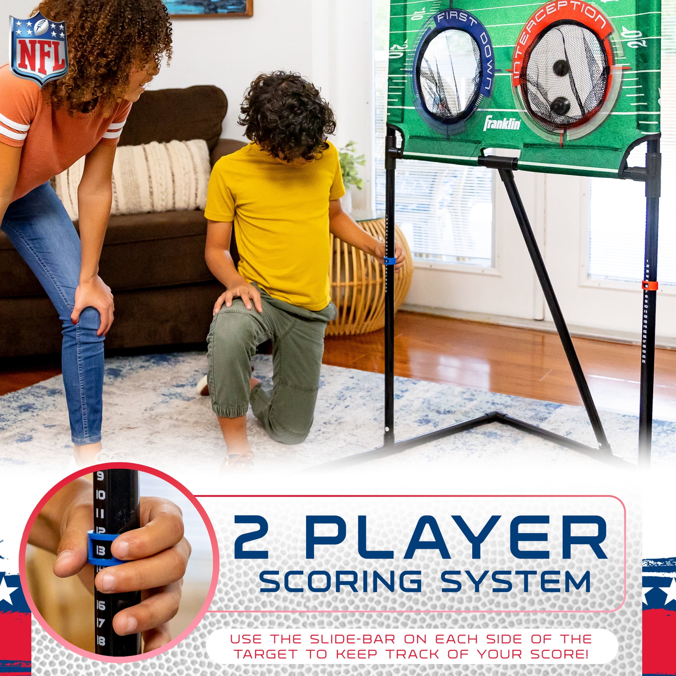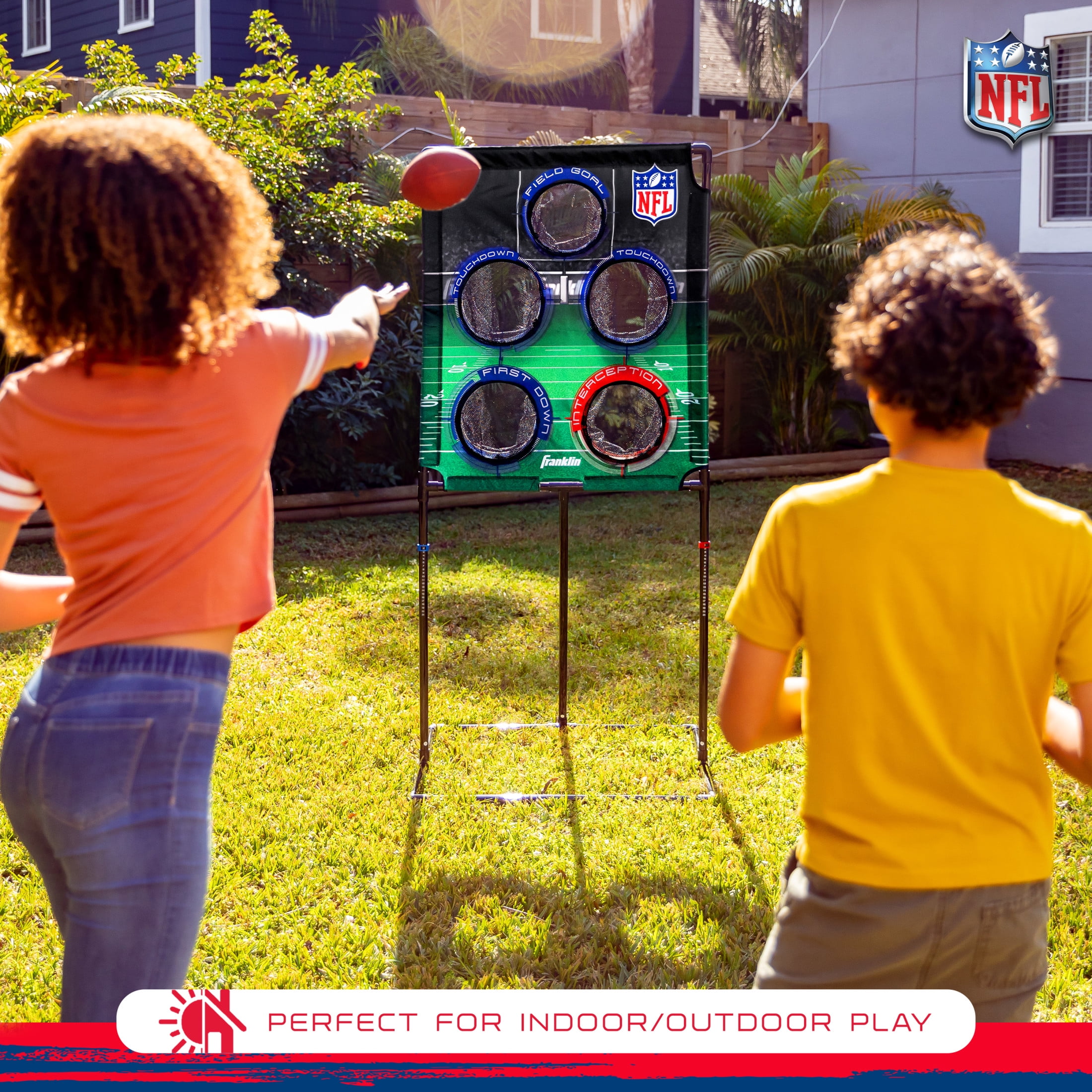 PERFECT FOR INDOORS & OUTDOORS: The NFL Deluxe Football Target is the perfect addition to your tailgate or backyard football practice. The carry bag included makes it easy to take your game anywhere! 2-PLAYER SCORING on each side! Use the slide-scoring on each side of the target to keep track of your score as you complete each pass! WEIGHTED BASE FOR ADDED STABILITY: The weighted base and back support bar ensures maximum stability so that your target can withstand all of your passes. OFFICIAL NFL LICENCED PRODUCT: Play like the pros with this official NFL licensed target featuring realistic football field graphics and game play. INCLUDES: (1) NFL Deluxe Football Target, (4) 6″ PVC rotation molded footballs, (1) carry bag & (1) inflation pump with needle