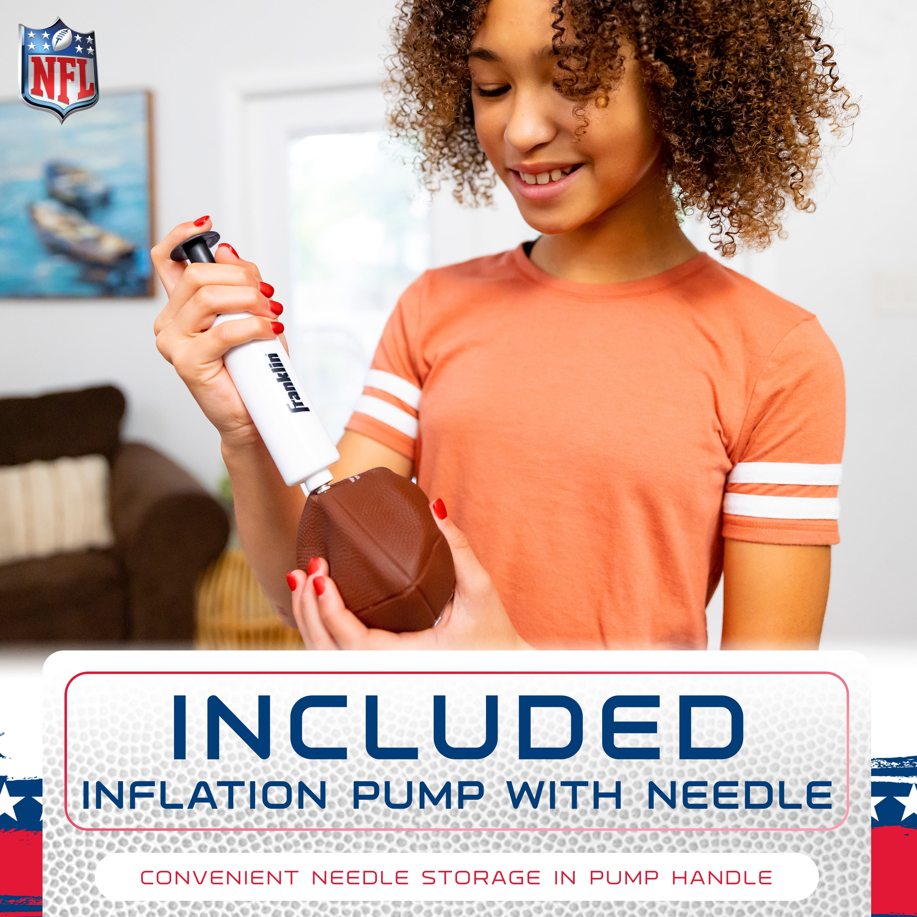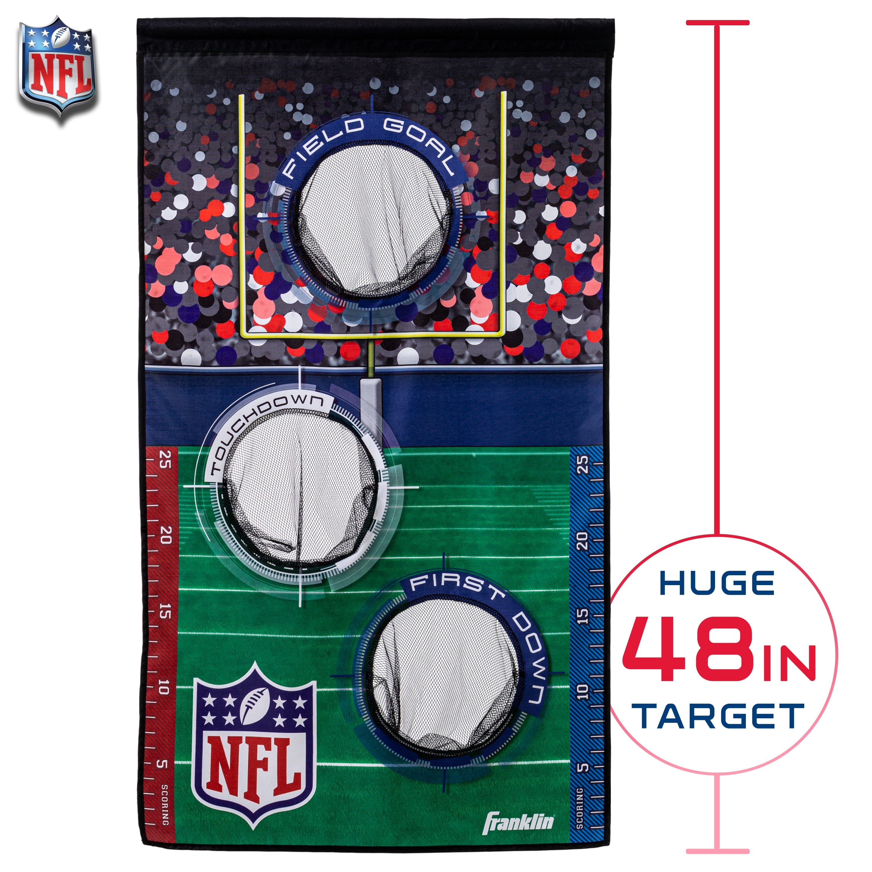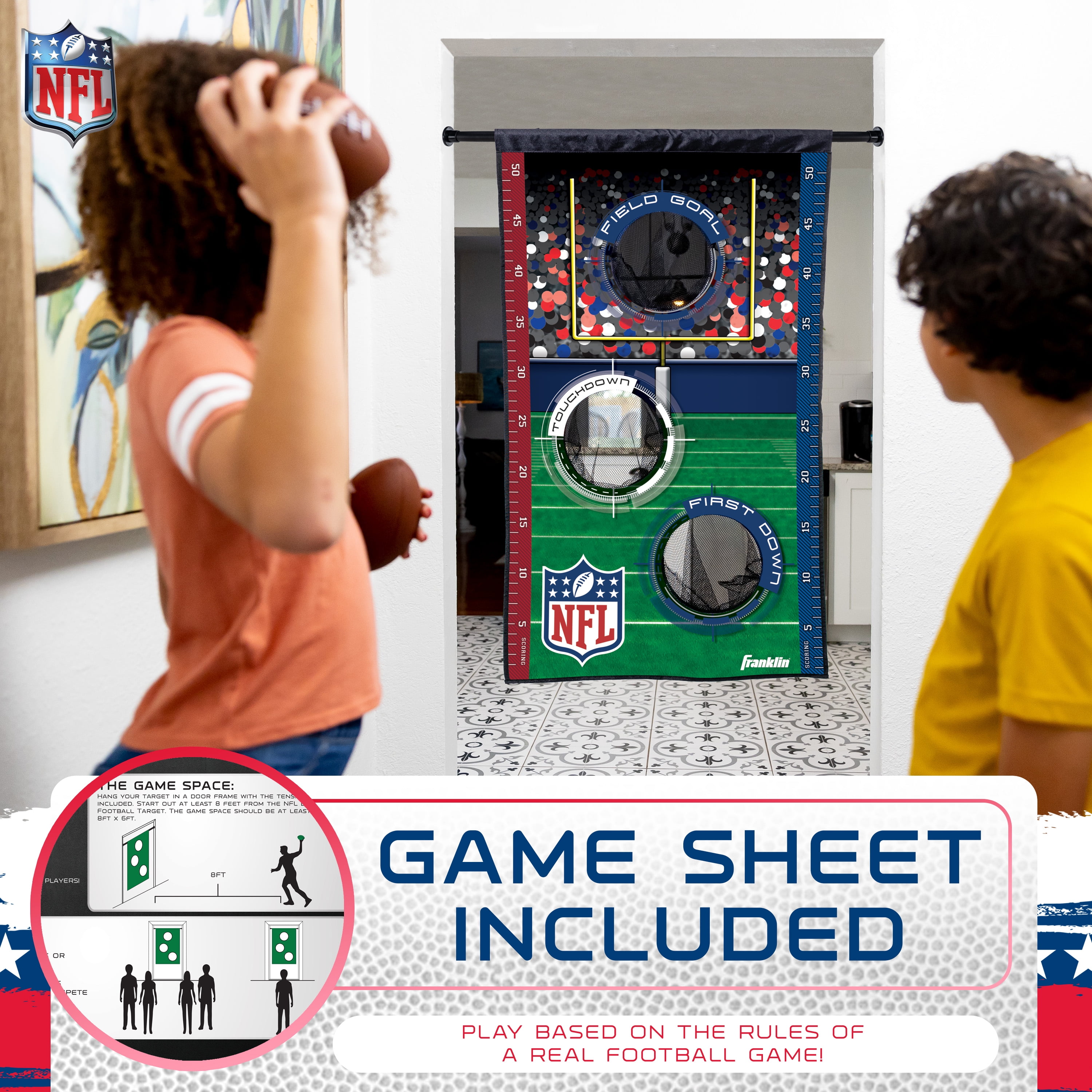 TARGET TOSS: Kids will love this mini football toss game set! Just pass the mini footballs into the target holes to rack up points and win the game! FITS ANY DOOR: The NFL Door Jam target is designed with an adjustable tension rod to fit any doorway. Simply twist to extend or shorten the rod to fit your door MINI FOOTBALLS: This passing game comes with (4) 6″ PVC mini footballs and (1) air pump included so kids have everything they need to play MULTIPLAYER SCORING: Play head to head, in teams, or challenge yourself to beat your high score! Scoring clips on both sides of the throwing target make it easy to keep score no matter how many players you have OFFICIAL NFL LICENCED PRODUCT: Play like the pros with this official NFL licensed target featuring realistic football field graphics and game play.