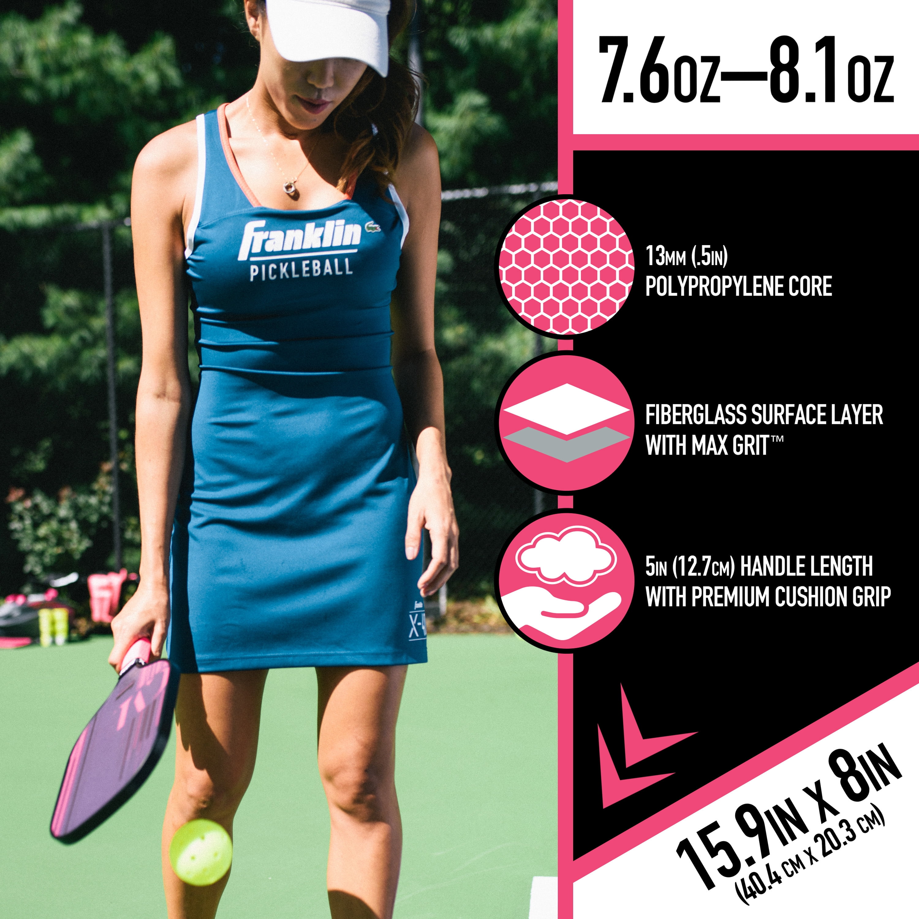 PROFESSIONAL QUALITY: Designed by Pickleball pro Christine McGrath, this premium quality Franklin Sports paddle has been constructed to compete, and win, at the highest level MAXIMUM GRIP: This paddle is constructed with Max Grit surface coating technology designed to achieve maximum spin and dampen vibration for optimal control and precision play STRONG, DURABLE CORE: The 13mm polypropylene paddle core is built for durability and effortless shot making while the fiberglass surface layer ensures a larger sweet spot in the center of the paddle for flawless contact and increased control PADDLE SPECS AND DIMENSIONS: PADDLE: 15.9″ X 8″ ; HANDLE LENGTH: 5″ ; HANDLE CIRCUMFERENCE 4.25″; WEIGHT: 7.6 – 8.1 OZ. ; CORE: 13MM Polypropylene USAPA CERTIFIED: This paddle is approved by the USAPA for competitive and tournament play