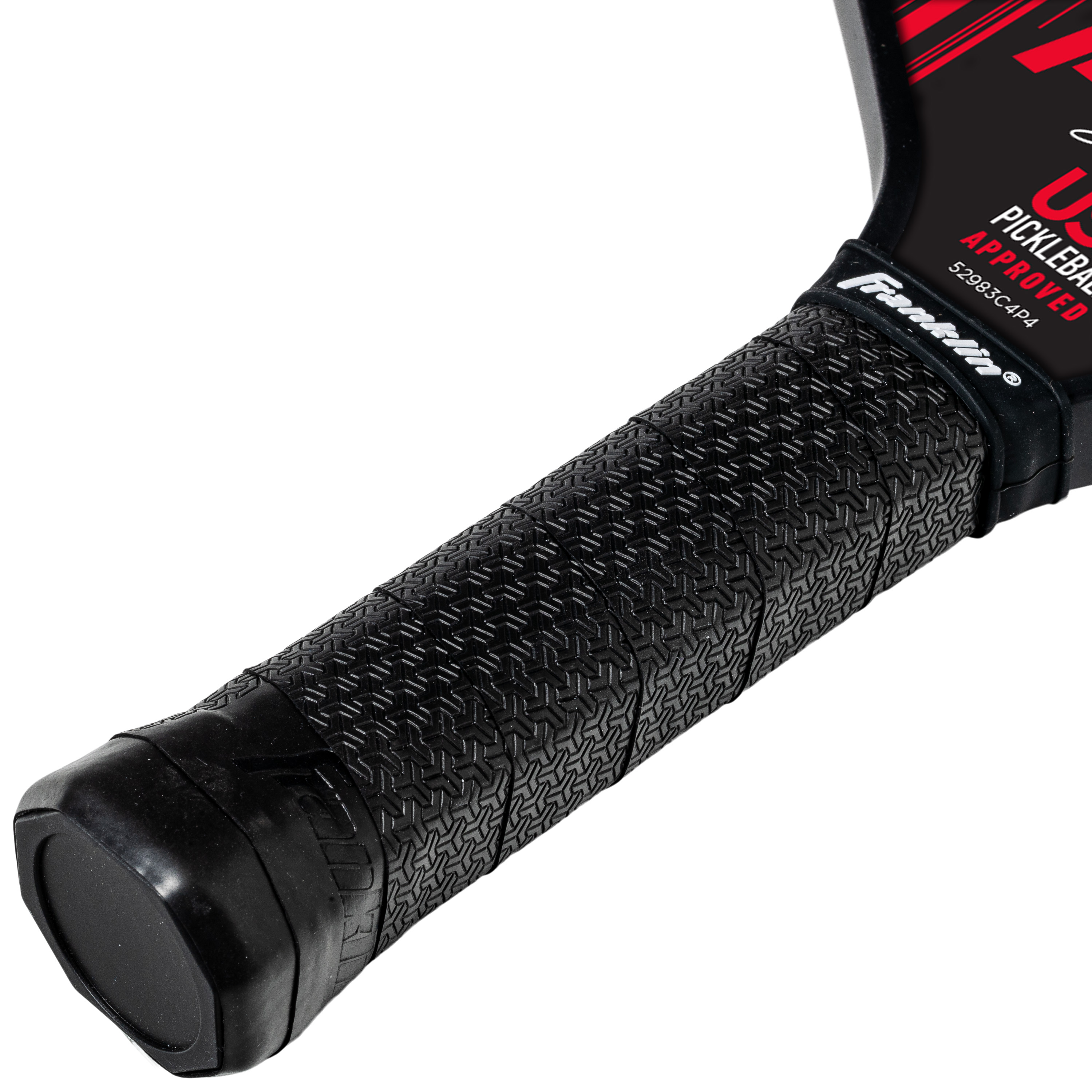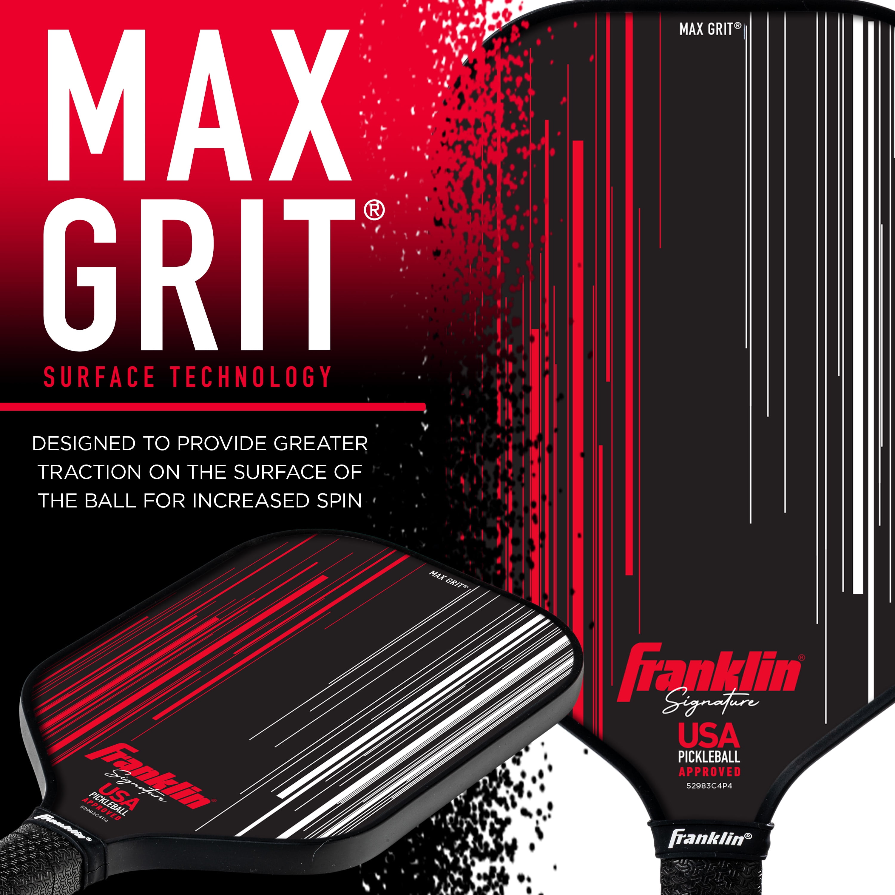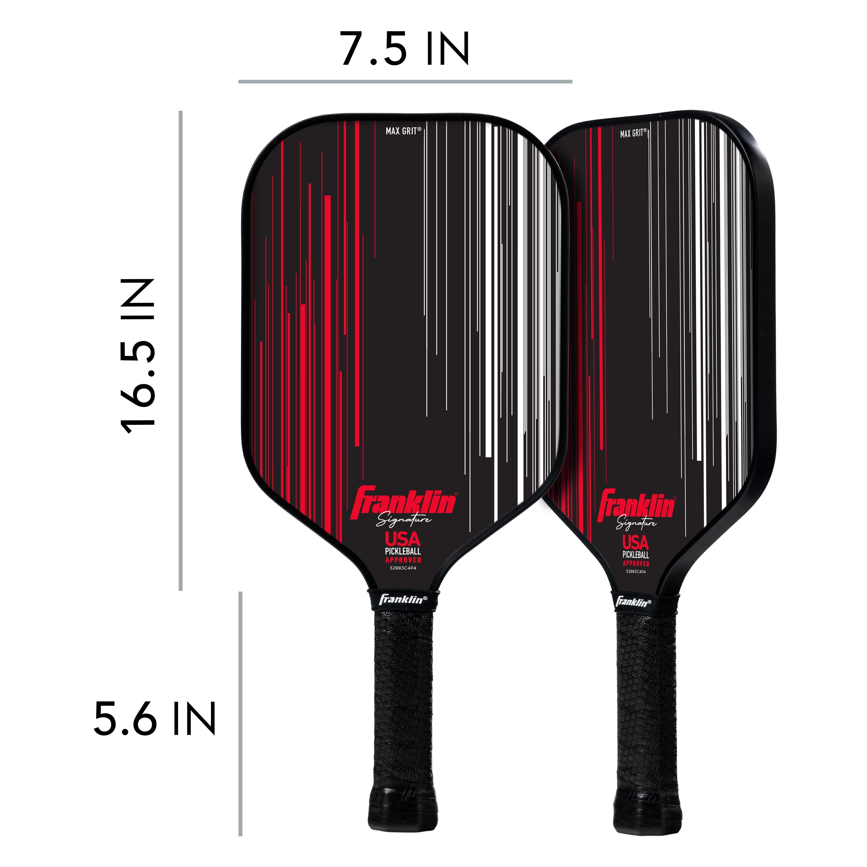 PROFESSIONAL QUALITY: Designed by professional pickleball players, this premium quality paddle has been constructed to compete, and win, at the highest level MAX GRIT: This Franklin Sports paddle is constructed with MaxGrit technology designed to increase traction on the ball so players can add more spin and control to their shots STRONG, DURABLE CORE: The 13mm polypropylene paddle core is built for durability and effortless shot making while the fiberglass surface layer ensures a larger sweet spot in the center of the paddle for flawless contact PADDLE SPECS AND DIMENSIONS: PADDLE: 16.5″ X 7.5″ ; HANDLE LENGTH: 5.6″ ; HANDLE CIRCUMFERENCE: 4.25″ ; WEIGHT: 7.5 – 8 OZ. ; CORE: 13MM Polypropylene ; COLORS: Black, White, Red USA PICKLEBALL APPROVED: This paddle is approved by the USAPA for competitive and tournament play WEIGHT: 8oz