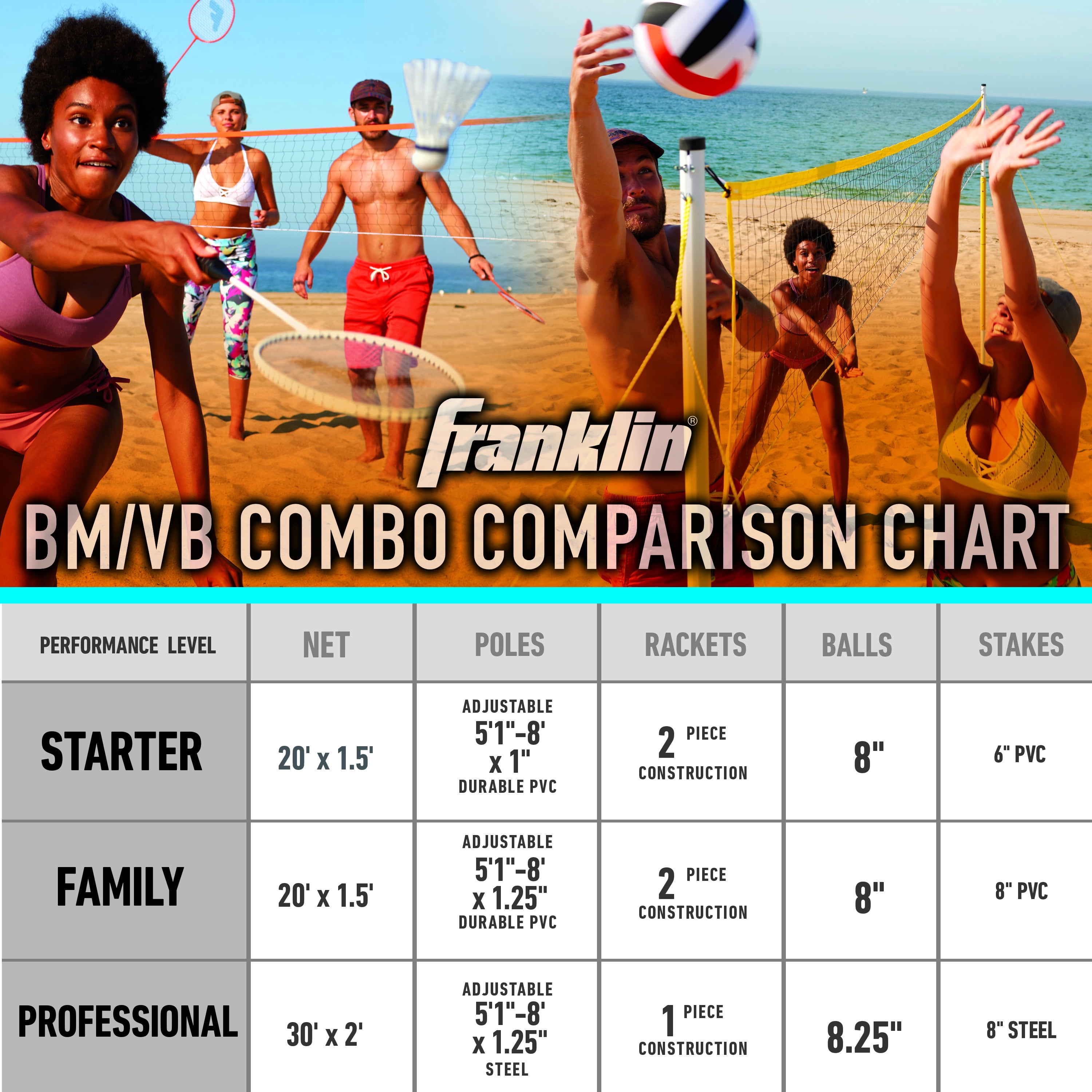 Franklin Sports Volleyball + Badminton Net Sets – Full Set – Starter: COMBO SET: Play beach volleyball or badminton in the backyard or in the park. Whether you’re at a family barbecue or having a get-together with friends, this starter volleyball and badminton combo set is everything you need for outdoor fun! EVERYTHING INCLUDED: This set includes (4) badminton rackets, (2) nylon birdies, (6) stakes and guy ropes, (1) volleyball, (1) ball pump and needle, and (1) convenient carry case to hold everything EASY SETUP: The easy-to-assemble net system includes a 1″ diameter steel pole that adjusts from 5’1″ to 8′ feet high so it’s a great set for all ages to enjoy. The net assembles to 20′ x 1.5′ so it’s big enough for many players to play PORTABLE: The carrying box holds everything that comes with this badminton and volleyball set. The portable box also makes storage easy and lasts season after season for grab-and-go fun FAMILY FUN: Great for all ages! This complete badminton and volleyball set lets you enjoy these classic sports nearly anywhere. Enjoy hours of fun and create memories that last a lifetime