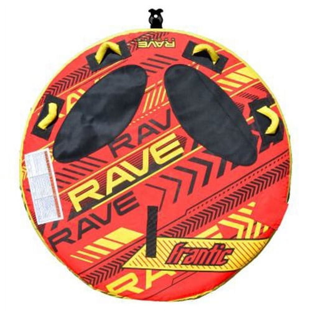 Red and Yellow Frantic 2 rider towable tube with a 56″ diameter (inflated) tapered profile, (6″ -12″) FOUR foam filled, tubular PP webbing handles with EVA knuckle guards. Tapered side gusset panel all around Quick Connect Tow System with triple reinforced stitching Two EVA anti-chafe pads Single rear boarding strap Flap cover over valve opening Self bailing cover drain on bottom.