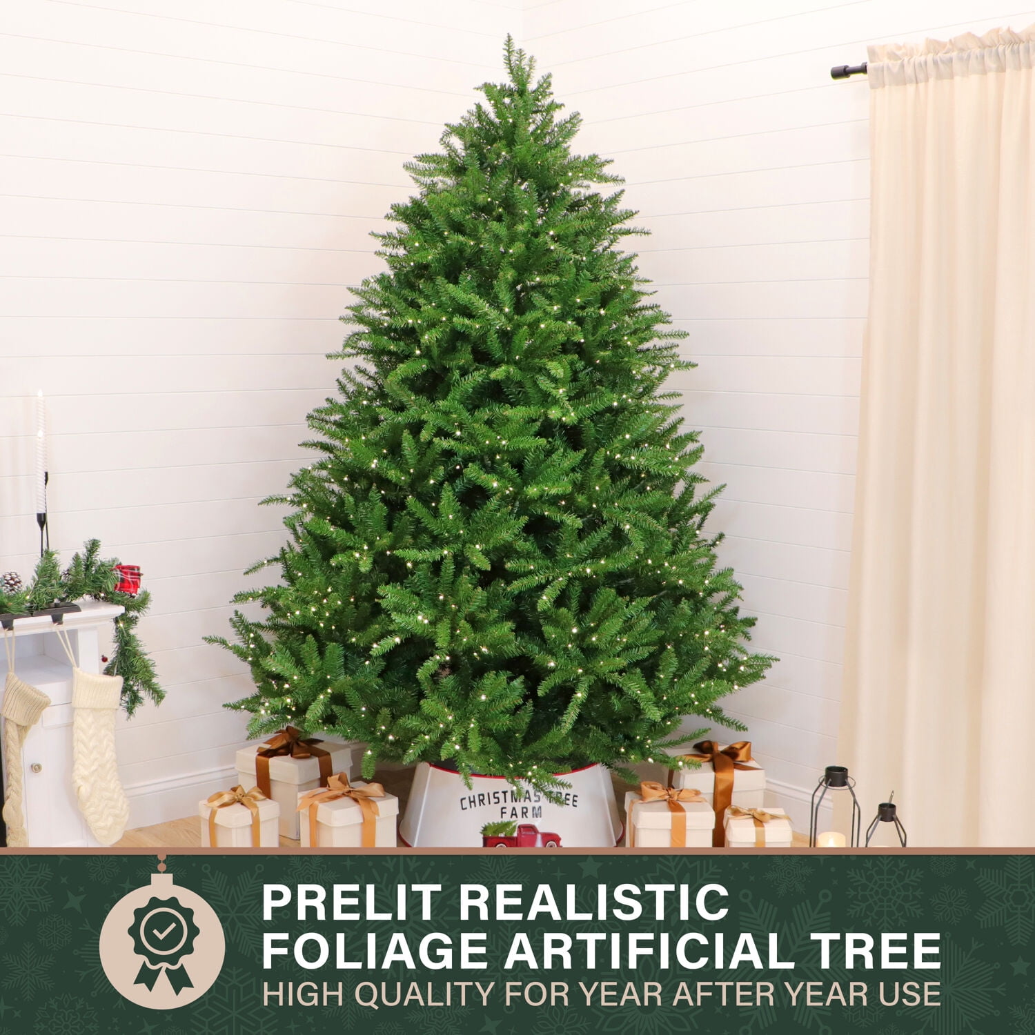 Fraser Hill Farm Artificial Tree with PVC Branches: This realistic 7.5-ft. tree features high quality PVC branches that are flame retardant and create the look of a natural tree with multiple shades of green Warm White Fairy LED Lights With 8 Functions: Tree is prestrung with 1150 warm white micro LED lights with 8 different functions to bring a festive glow to your home Lights up When Poles are Connected: EZ Connect technology makes assembly a breeze by auto-locking each tier securely into place and connects the light circuit for each section automatically Remote Control Included: Conveniently adjust the tree’s light settings to your liking from across the room with the included remote control Has Sturdy Metal Stand: Your tree will remain stable and safe for the whole season with the included metal stand Centerville Pine artificial Christmas tree Stands 7.5-ft. high with a 68-in. diameter Constructed with high quality PVC branches