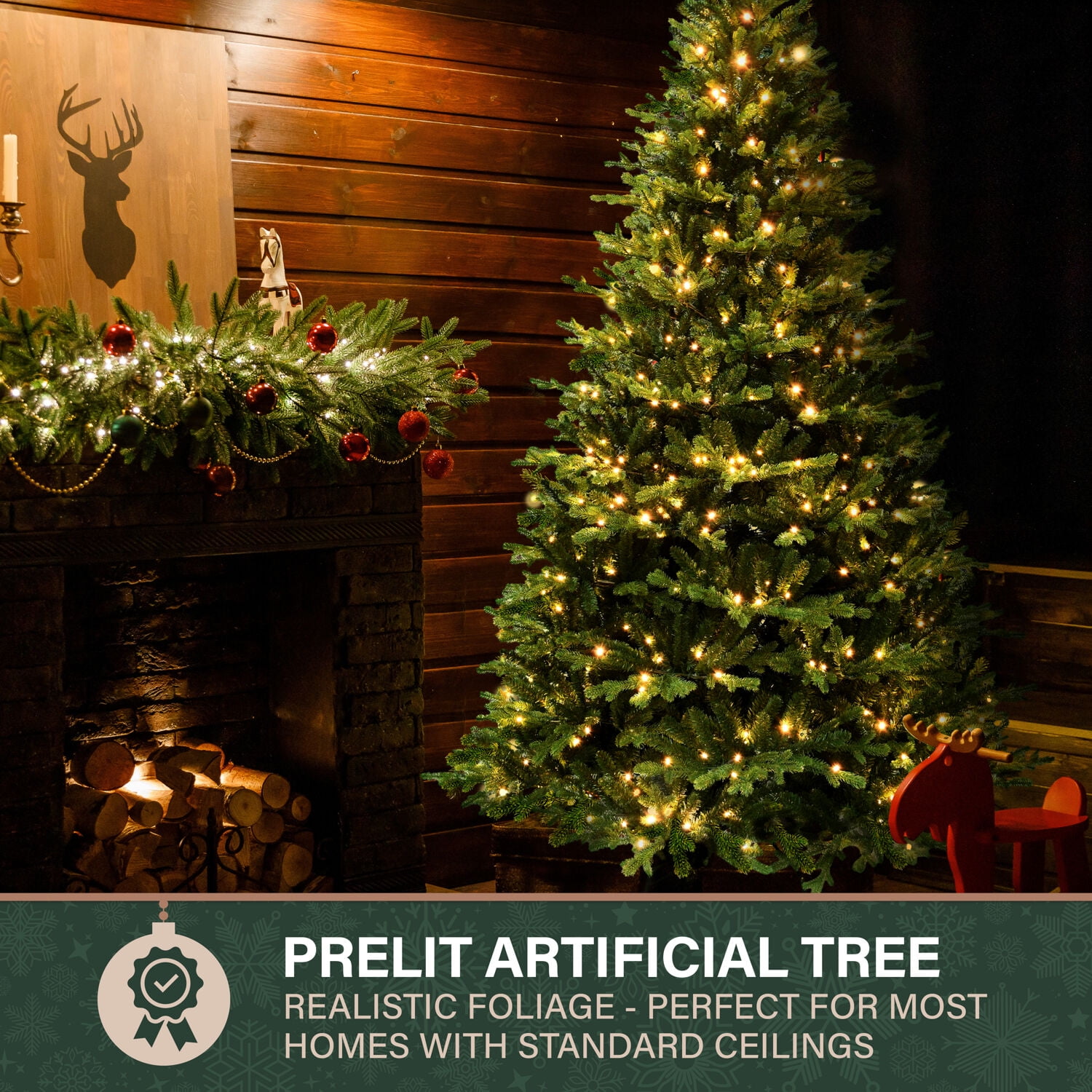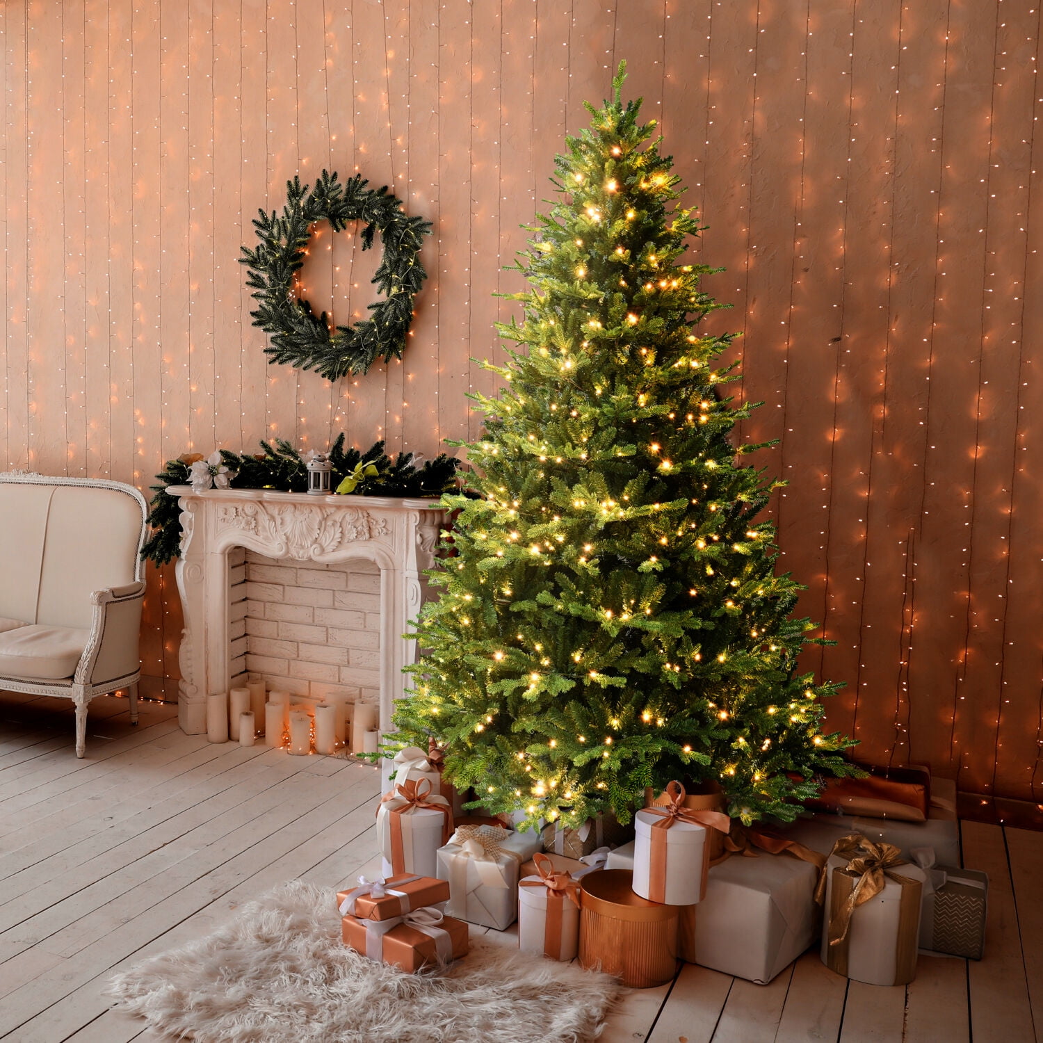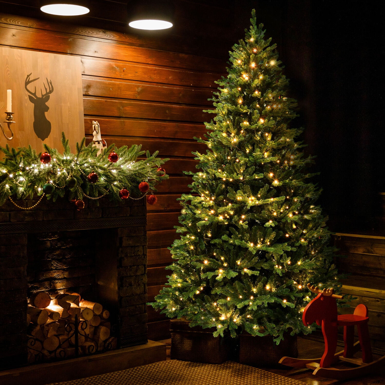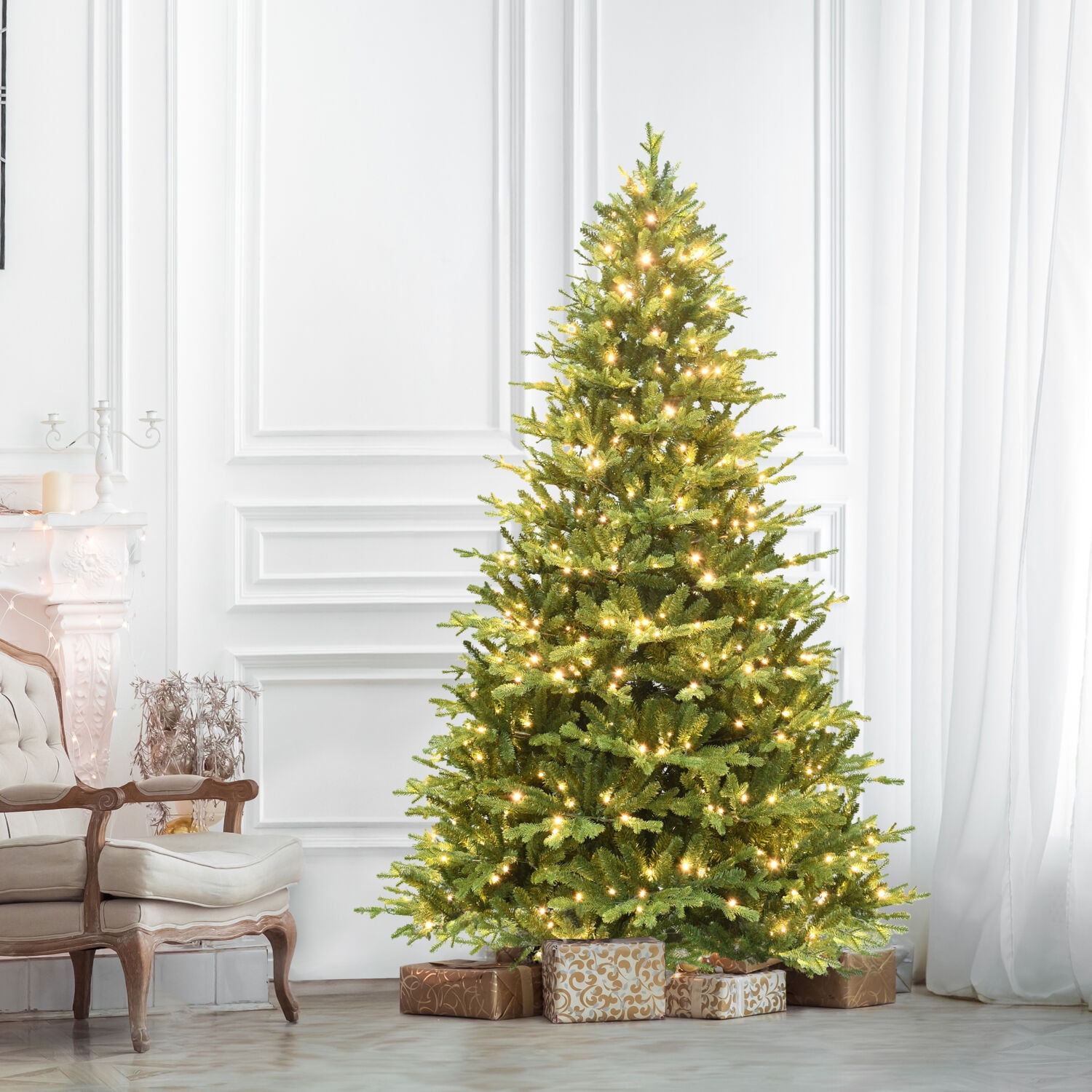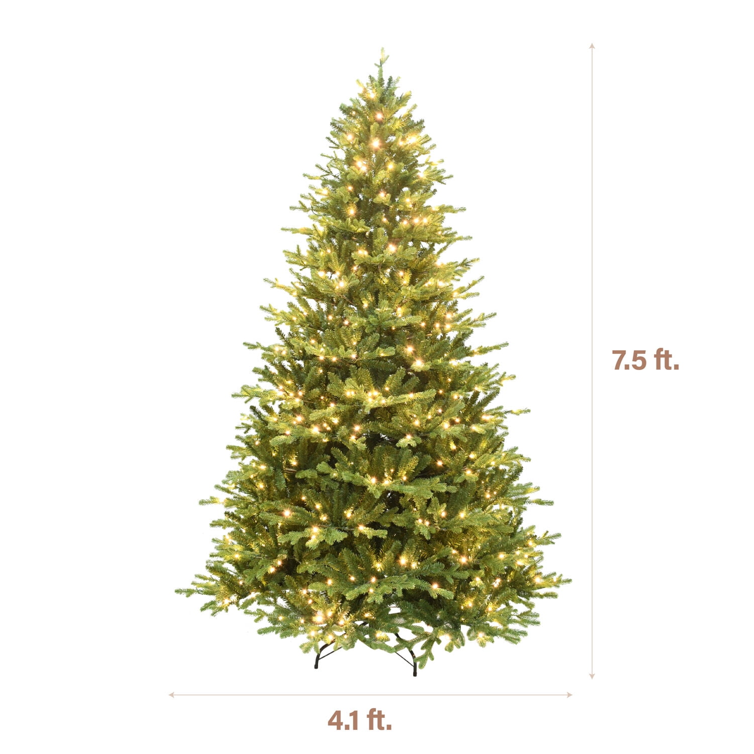 Oregon Pine artificial Christmas artificial tree Stands 7.5 ft. high with a 59-in. diameter Traditional full silhouette with lifelike foliage Metal hinged branch construction for realistic Christmas tree High-quality mix of PVC and PE needles Artificial tree with lights prestrung with warm white LED string lights Number of active bulbs: 700 Number of tips: 4062 Flame-retardant and non-allergenic