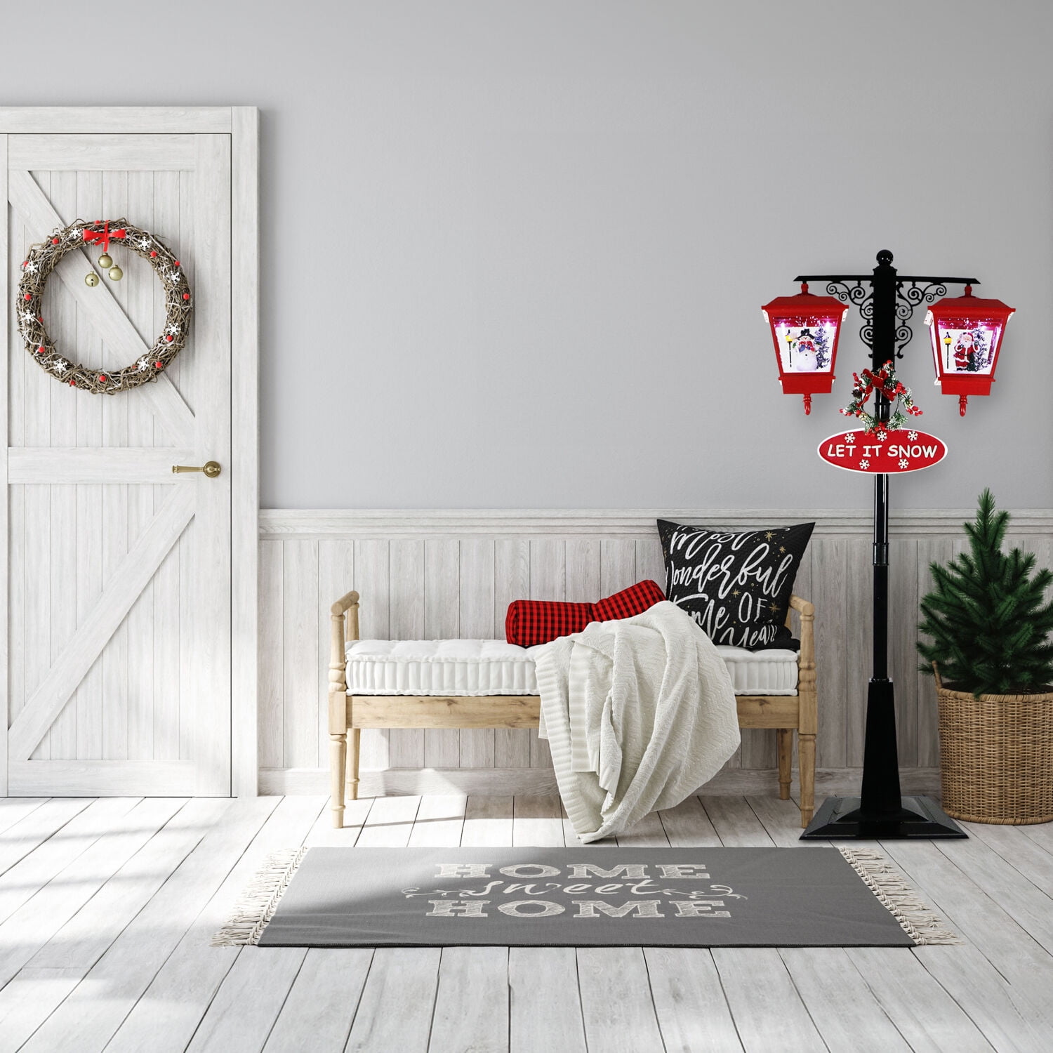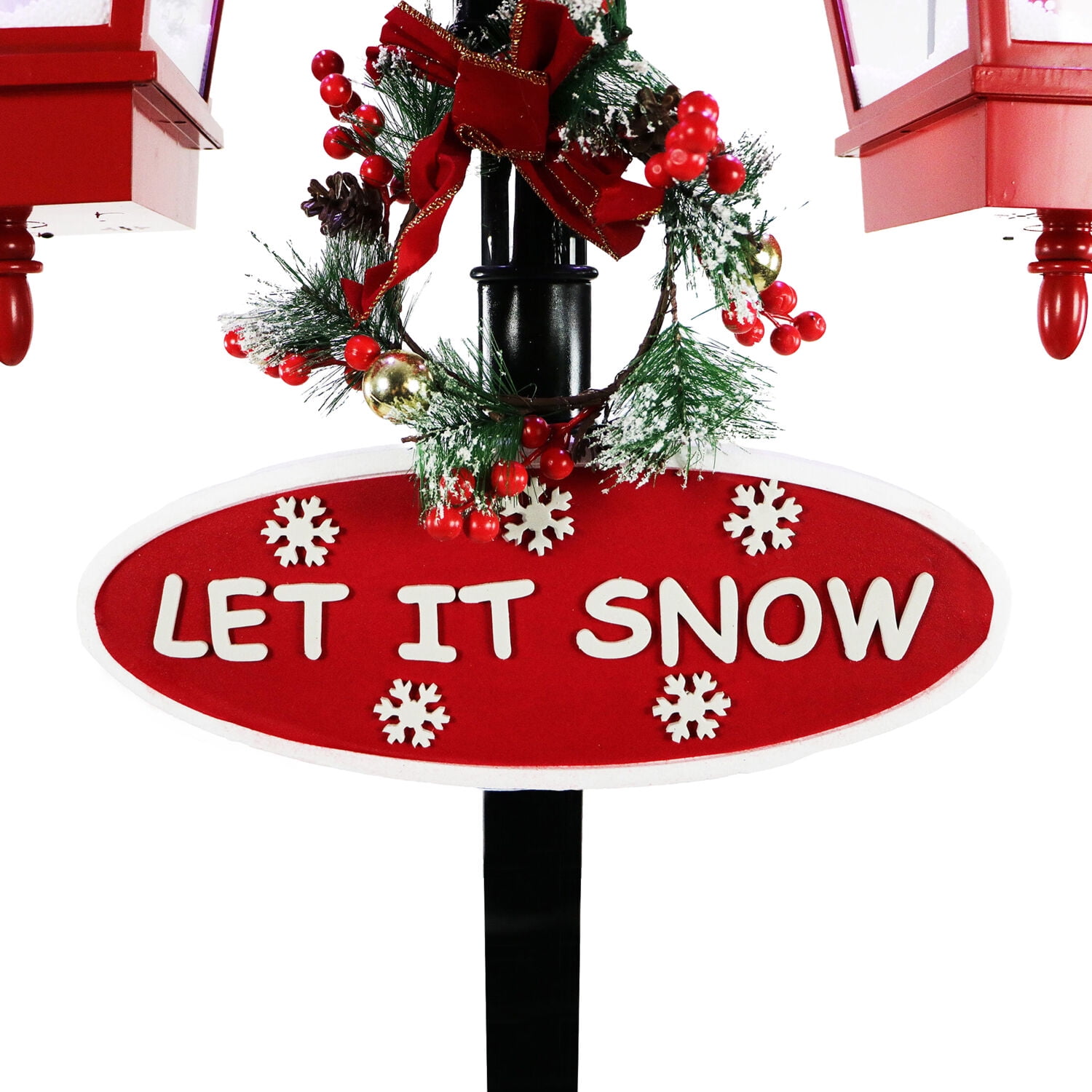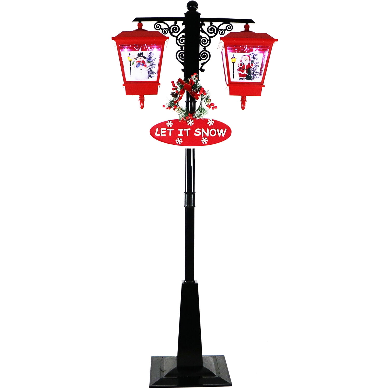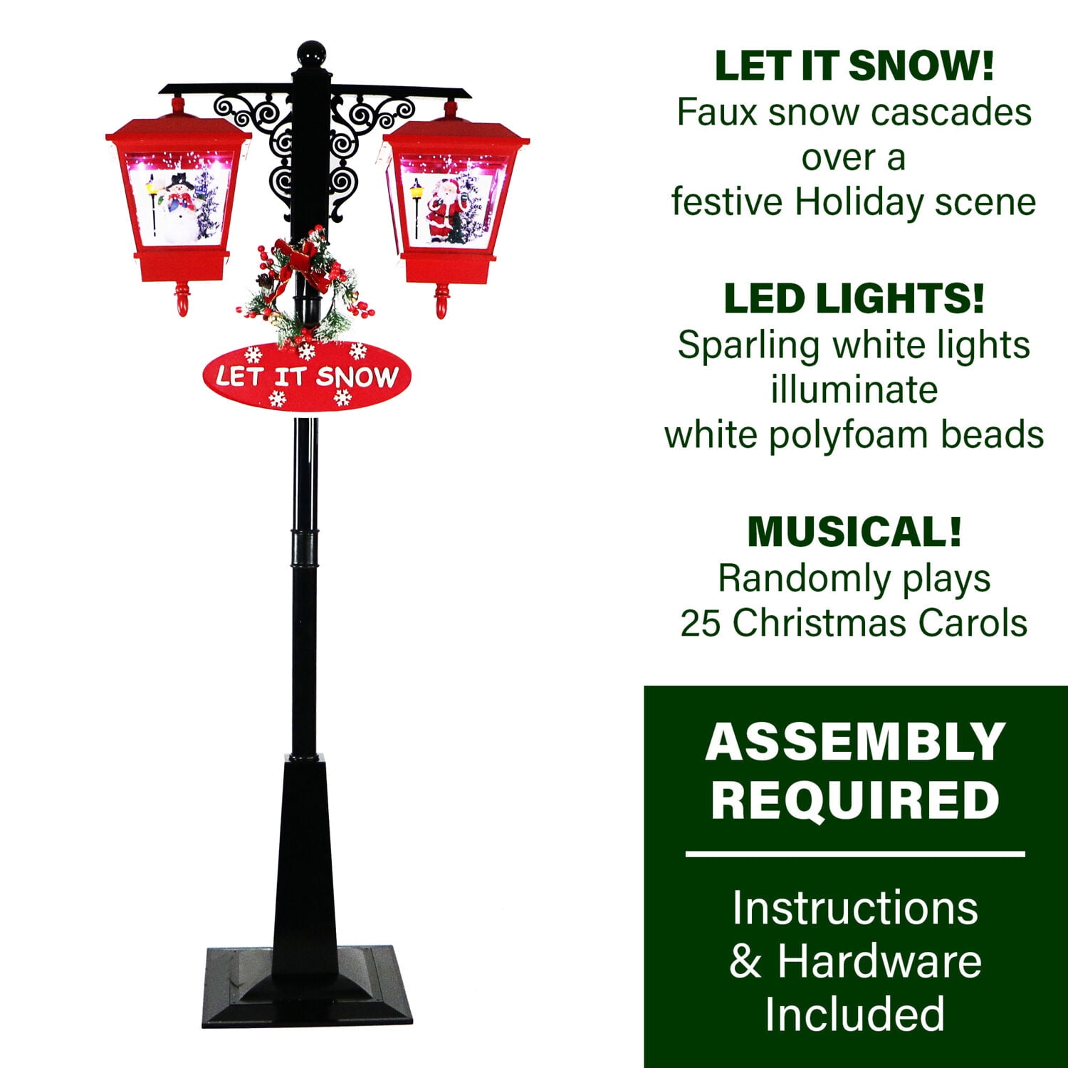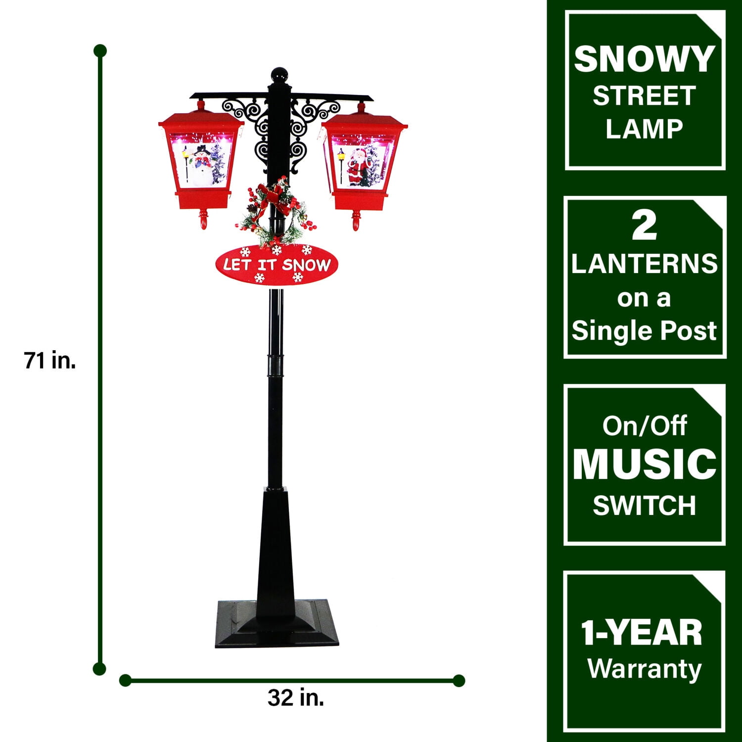 DOUBLE LANTERN SNOWY STREET LAMP: 71-inch tall dual-lantern snowing musical street lamp with self-containing snow function – perfect size for anywhere inside your home. Includes Let it Snow sign, berry-covered wreath, and classic red bow. ANIMATED DECOR: Faux-snow cascades over a delightful snowman in one lantern and a traditional Santa in the other lantern, creating a winter wonderland. PRE-LIT DECORATION: Each lantern is brightly lit inside with 18 white LED lights and 1 warm white LED light when xmas animation starts (38 lights total). MUSICAL: Plays 25 popular Christmas tunes such as Deck the Halls, Jingle Bells, Up on the Housetop and many more! ADJUSTABLE: Self-containing snowy function has adjustable switch to flow with or without music. 71-inch tall dual-lantern musical street lamp from the Let It Snow series by Fraser Hill Farm Faux-snow cascades over a delightful snowman in one lantern and a traditional Santa in the other lantern 18 white LED lights plus 1 warm LED light illuminate the flurry of white polyfoam beads in each lantern (38 lights total) Decorated with traditional scrollwork, Let it Snow sign, berry-covered wreath, and classic red bow Randomly plays 25 Christmas Carols such as Silent Night, Jingle Bells and many more Enjoy lights and snow function with or without music Generous 16-ft. power cord length for easy placement Speaker located in the lantern base near the music on/off switch Assembly required – instructions and hardware included For indoor use only – keep out of sunlight Dimensions (inches): 16 D x 32 W x 71 H 1-year limited warranty Color: red/black