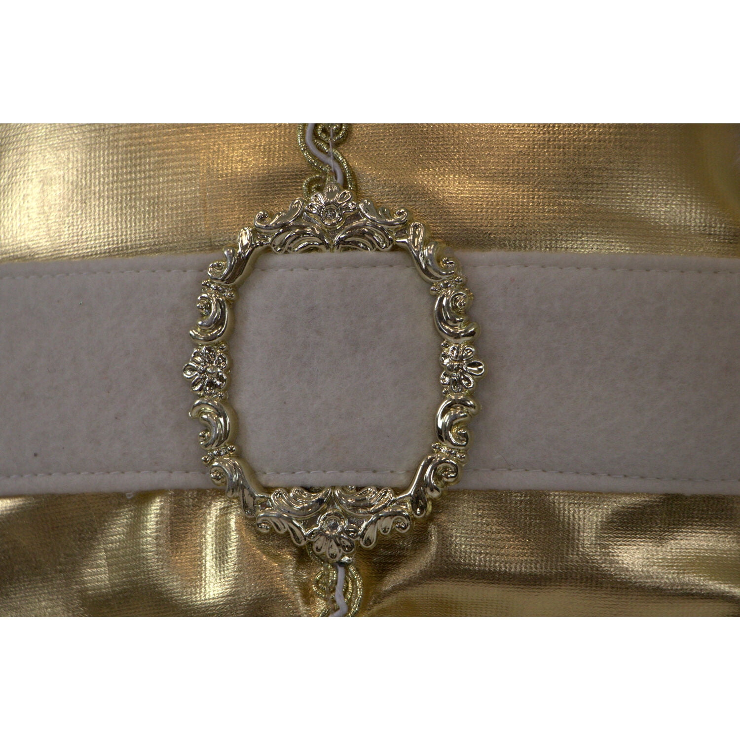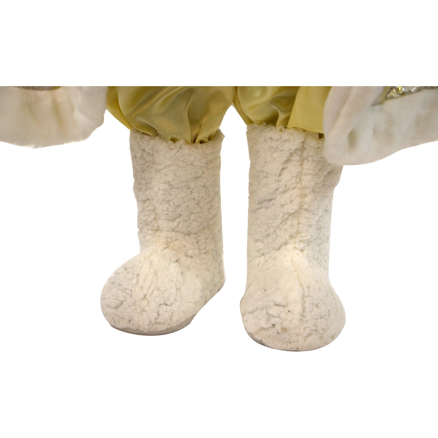 3-ft. Santa animatronic moves his head and arms Holding a lighted Christmas tree Easy to operate with a standard plug to see movement with or without music Prelit holiday tree, with 50 warm white LED bulbs, lights up via a battery operated on/off switch (requires 3 AA batteries – NOT included) Jingle Bells can be heard through the music speaker located inside his left hand and lasts 51 seconds Music on/off button is located under his left sleeve Music volume is approximately 72 dBs and cannot be adjusted Elegantly dressed in a gold-on-white paisley coat with furry white trim over a golden satin suit