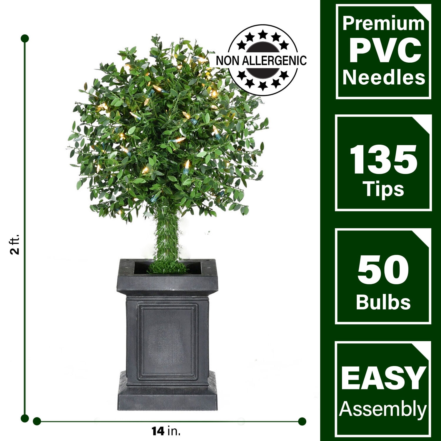 DESIGNER FINISHES: Accented with a black pot, this modern farmhouse inspired boxwood single topiary ball is the perfect addition to your Christmas or everyday decor. Measures 24 inches tall. PRELIT WITH WARM WHITE LED LIGHTS: Pre-strung with 50 long-lasting, warm white modern LED lights to add a festive touch to your home all year round. Battery-operated lights eliminate the hassle of plugs for easy display. NO CLIPPING OR NO WATERING REQUIRED: If you love a classic boxwood but not the maintenance, this is for you. Realistic, neat and hassle free, just lightly dust as needed. Suitable for indoor or covered outdoor display. HIGH-QUALITY ARTIFICIAL MATERIALS: Designed using high-quality faux materials crafted to last season after season. No maintenance required. Just dust lightly as needed. FRASER HILL FARM IS HERE TO HELP: If you are not completely satisfied with your purchase, your item was damaged in shipment, or you have questions please feel free to contact us and our customer service team will assist you. Boxwood topiary ball in a pot for small spaces, entryways, or corners Stands 2-ft. high with a 14-in. diameter Add a modern touch to your Christmas decor or display all year round Modern silhouette with all-metal structure and lifelike foliage High-quality leaves that are flame-retardant and non-allergenic Beautiful lifelike boxwood leaves without the maintenance of a real shrub Recommended for indoor or covered outdoor use for long-lasting beauty Prestrung with 50 warm white LED lights Battery operated string lights require 6 AA batteries (not included) 1 year limited warranty