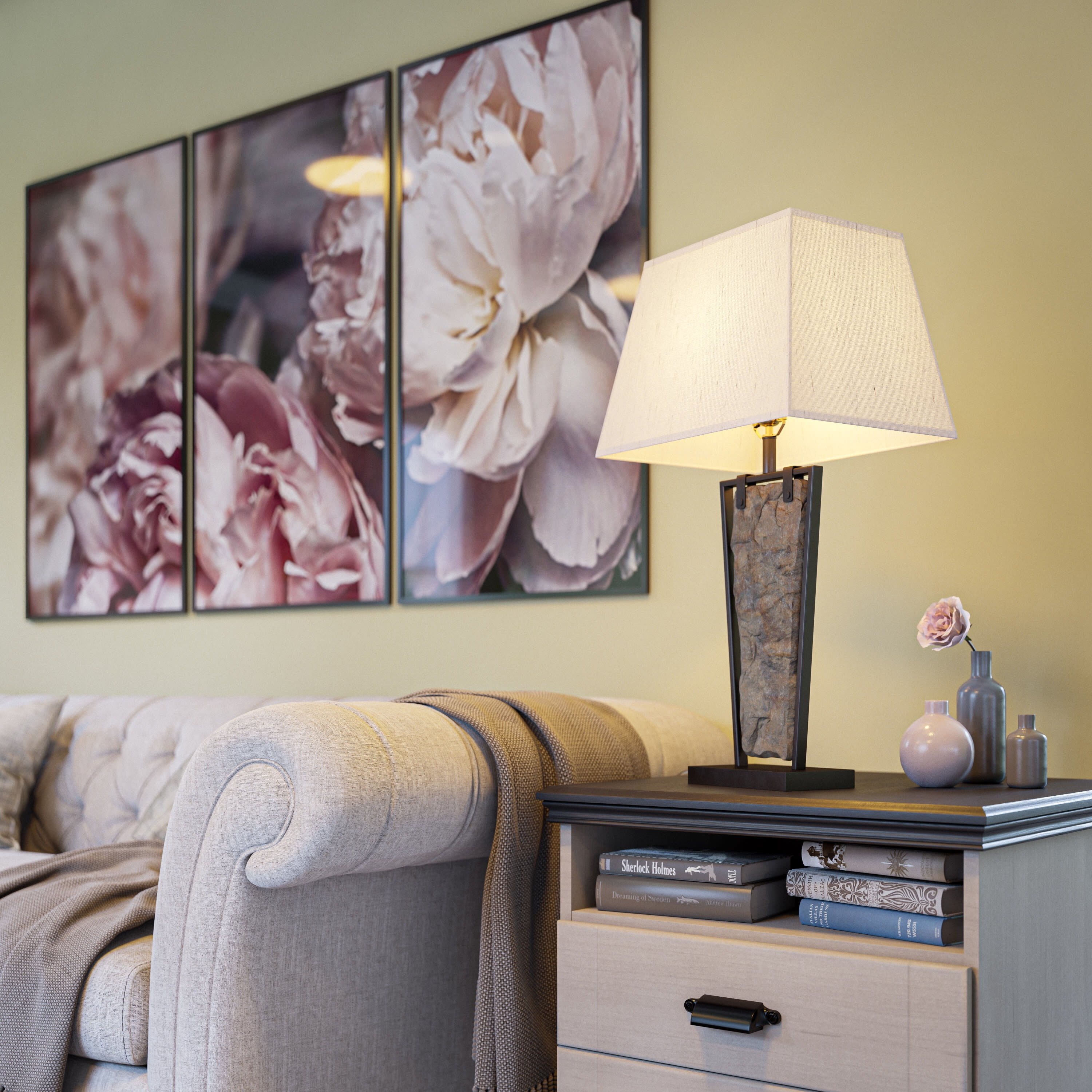 Natural Slate: The oil rubbed bronze finish and the minimalistic suspended real slate panel of the slim decorative lamp adds style to your rustic home decor Dimensions: This end table lamp is 30 Inch in height, 16 Inch in length and 12 Inch in width Alexa Compatible: Works with Alexa compatible smart plugs for on/off voice-activated operation (Alexa and smart plugs sold separately) Lighting Profile: The contemporary lamp is fitted with a 3-Way socket for high, medium, and low light settings (when used with a 3-Way Bulb, not included); The oatmeal tapered rectangular shade fills the area with warm illumination for a cozy ambiance Room Placement: This room lamp adds a touch of rustic charm and a sophisticated ambiance to your room; Perfect for placing around living room furniture, bedroom nightstands and entryway console tables, create a dramatic lift in visual flair with the presence of this nature-inspired lamp Rotary 3-way