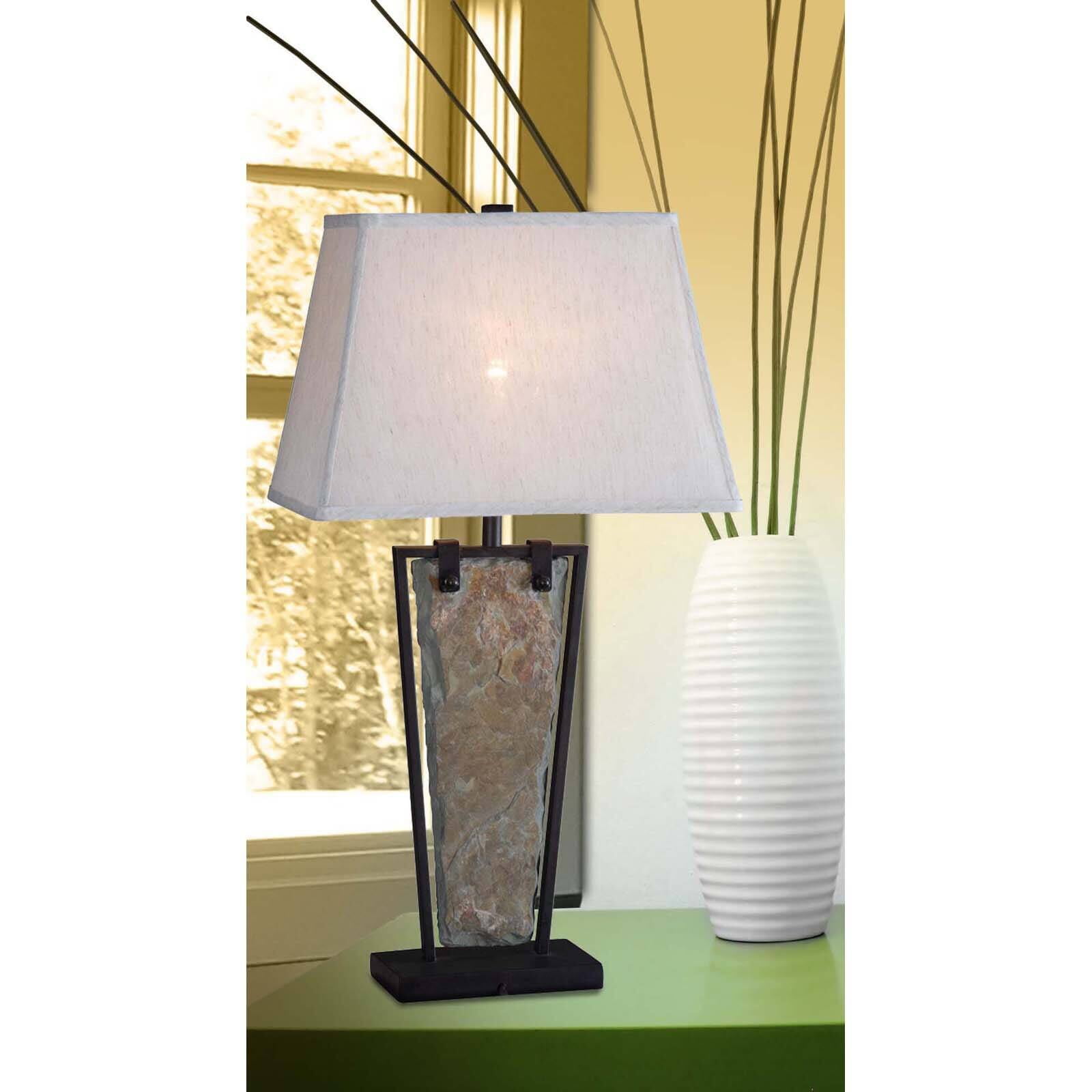 A large piece of natural slate is held aloft by the dark frame of this rustic inspired lamp. Coming in a geometric shape, the slate stands as the centerpiece of this lamp, framed by the dark finish on all sides. Light falls down the face of the base, highlighting the rich colors of the natural slate body that give this lamp a rustic charm all its own. Sporting an oatmeal shade, plenty of light can be cast around your living area when placed on a living room end table or bedroom night stand. Looking to bring a touch of nature into your workspace? This table lamp will be right at home on top of your desk, casting plenty of light for your latest projects.