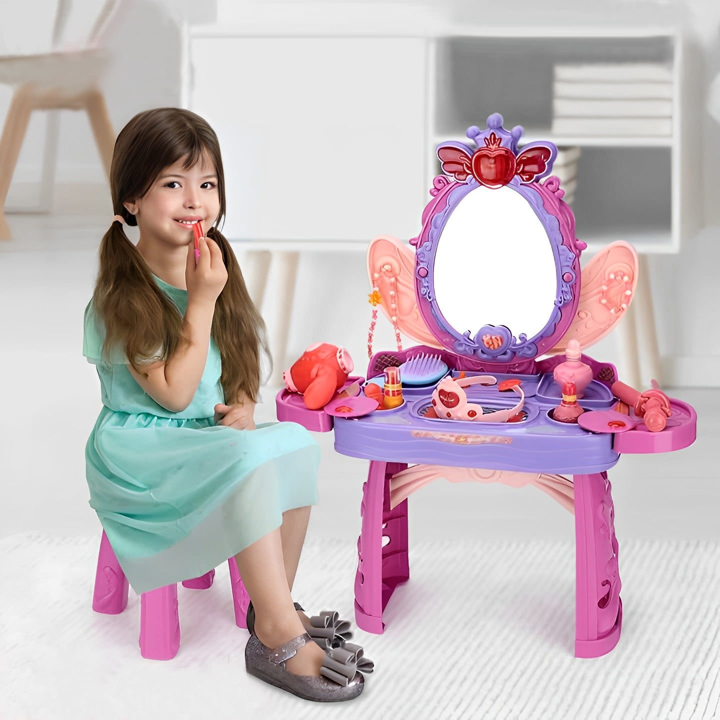 This beautifully designed children’s vanity table is sure to capture the heart of every little girl who dreams of being a princess! It comes with a mirror, a small stool, and various pretend accessories like a hairdryer and a straightening iron. The unique elf ear design allows for convenient storage of small accessories. Plus, the enchanting sensor lights and music make kids feel like they’ve stepped into a fairytale world! With this vanity table, your little one can let her imagination soar as she gets ready for royal adventures. It’s not just a toy, but a magical gateway to endless hours of creative play. Give your child the gift of princess-like transformation and watch her eyes light up with joy!