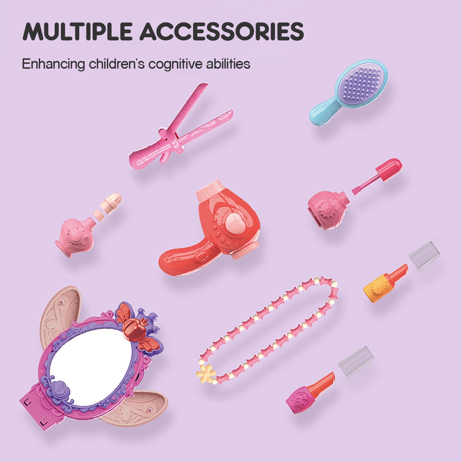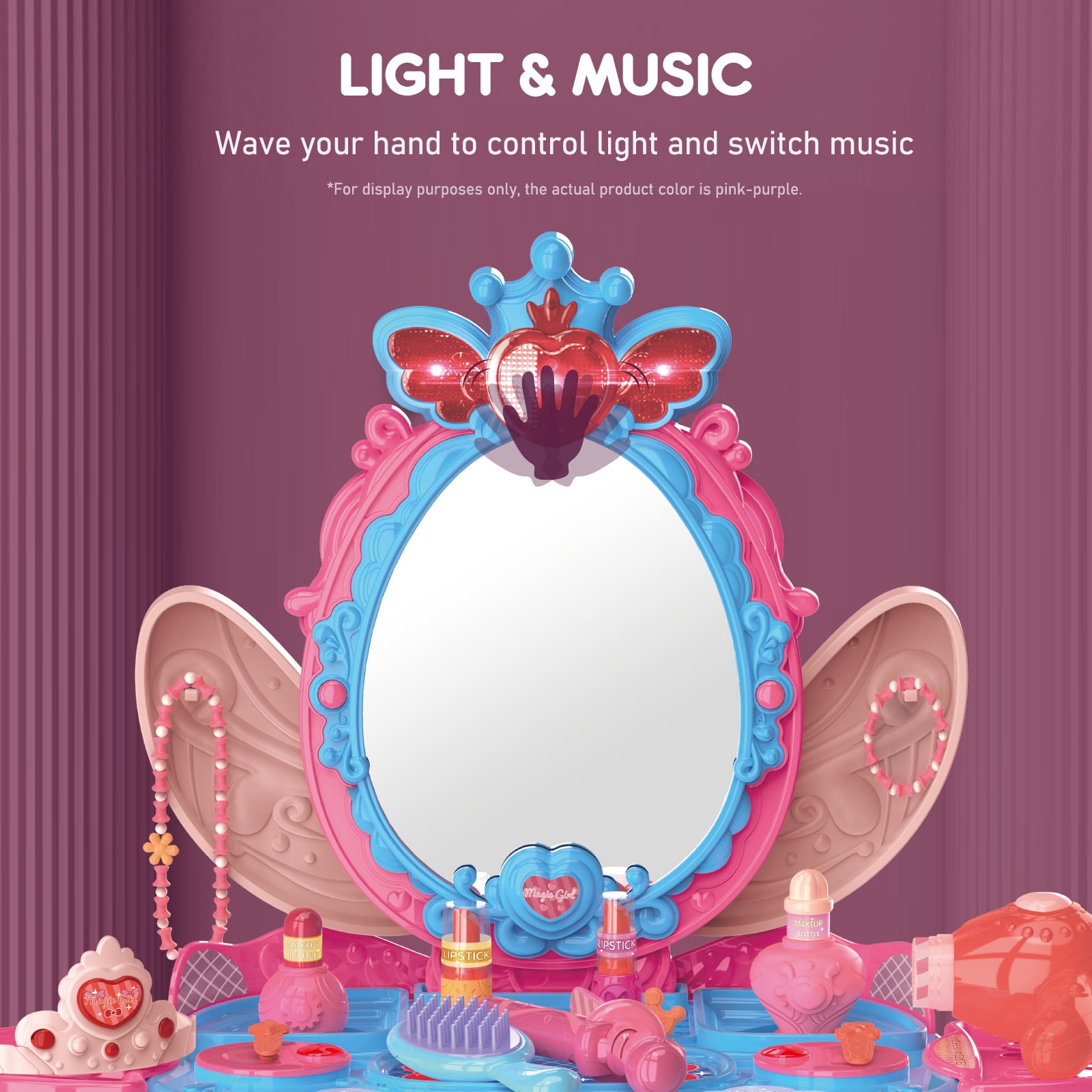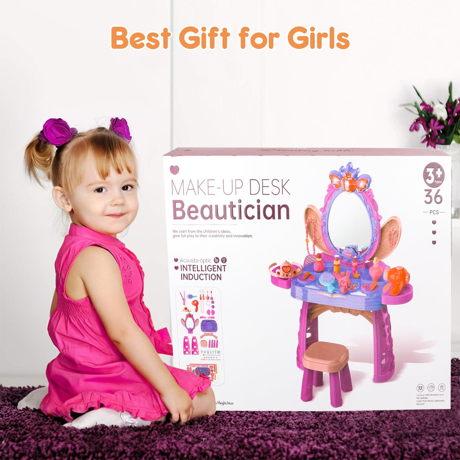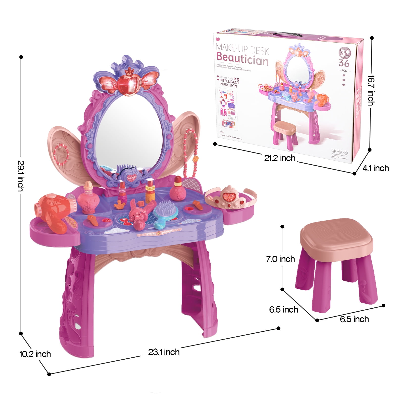 1. Kids Makeup Vanity Set: This adorable vanity table is a perfect toy for little girls aged 3 and up. It comes with a mirror, stool, and lots of accessories like a pretend blowdryer, hair straightener, comb, perfume bottles, bracelets, lipsticks, crown, and hair clips . 2. Magical Lights and Music: Turn on the mirror and watch your child get immersed in a magical princess experience with heart-shaped lights and enchanting music. They can control the lights, music, and motion sensor by waving their hand in front of the mirror. There are 8 different music options to choose from. Please note that 3*1.5V AA batteries are required (not included). 3. Compact and Easy to Set Up: This vanity table is compact and lightweight, making it easy for kids to move around. It measures 29.13*10.24*23.11 inches. It’s made from durable plastic that can withstand the playtime of preschooler girls. The quality of this toy set is top-notch. 4. Cultivation of Skills: This vanity set not only provides endless imaginative play but also helps develop self-confidence, creativity, fine motor skills, and social skills. It’s a delightful surprise gift that encourages learning and growth. 5. Perfect Gift for Little Girls: Every little girl dreams of having her own vanity with lights and a makeup table. This set is perfect for dressing-up parties, pretend play, and more. It’s a great gift idea for Chirtmas, birthdays and holidays for girls aged 3-6.