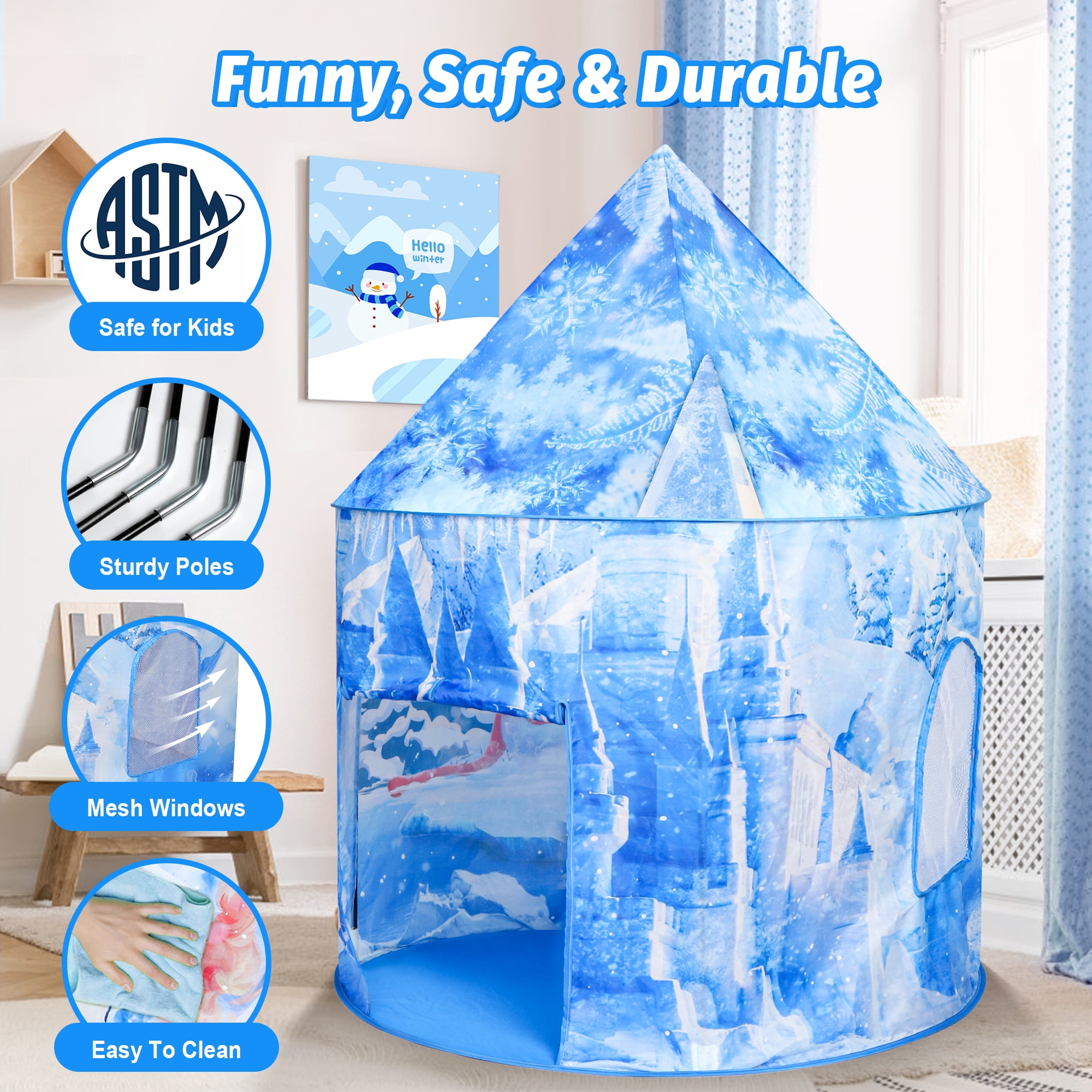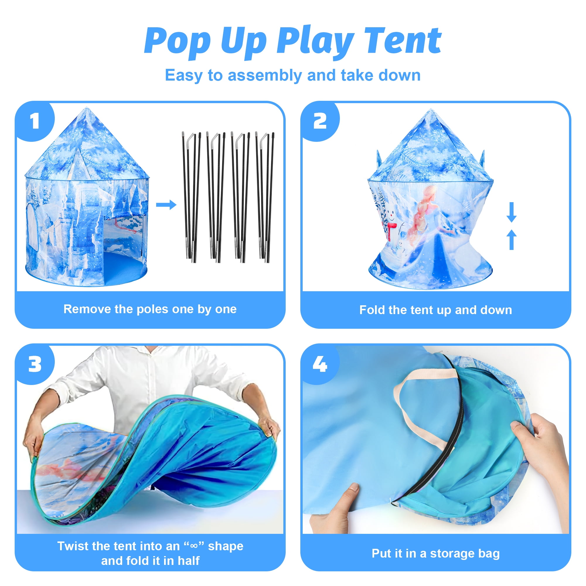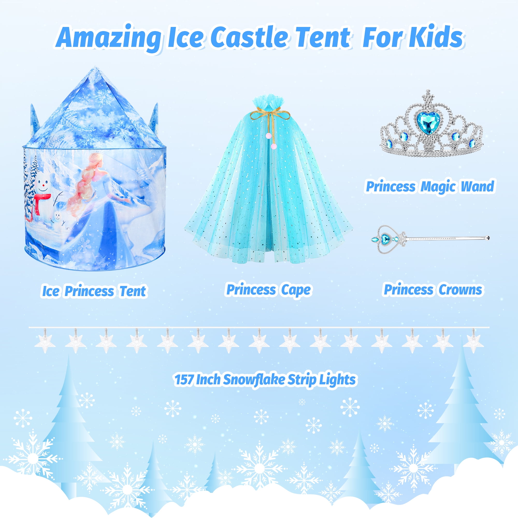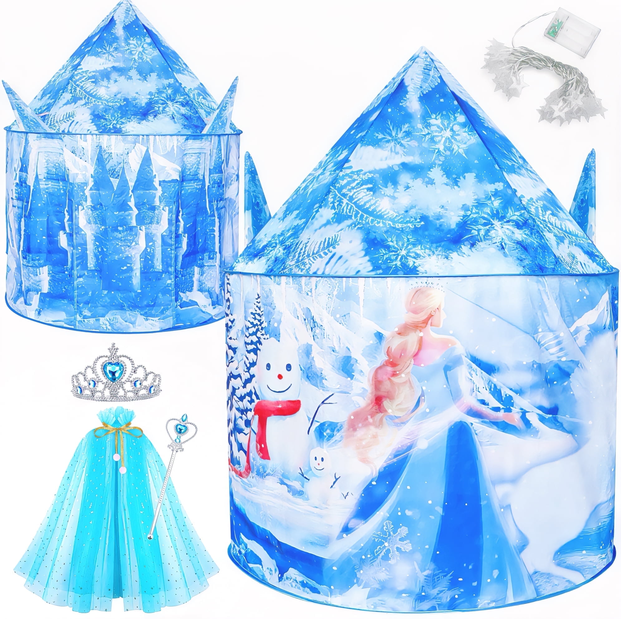 ❄️【Ice Princess Tent】Freecat Princess Tent comes with an ice castle tent, princess cape, magic wand, and crown, providing abundant princess accessories for your child to fully immerse in princess role-playing and explore a colorful magical world. ❄️【Spacious Frozen Tent】The kids play tent measures 42*53 inches and can accommodate 2-3 children. Your boys&girls can read and play inside with friends or family, creating joyful and wonderful moments! Children can also use the indoor tent as a game room. ❄️【Easy to Install 】Our tent is made of high-quality polyester fiber material, durable and easy to clean. The installation process only takes a few seconds: open the tent, insert the corresponding foot sleeve into the installation pole, fasten the rope, and you’re done! ☃️【100% Child Safety】Our tent has undergone strict testing, and all materials are 100% child-safe. Kids can play inside with peace of mind. Besides a breathable window, both adults and children can see each other and won’t feel bored inside! ????【The Most Desired Gift for Girls】Comes with a dreamy snowflake light string (batteries not included), which can be turned on at night. Girls can play inside to their heart’s content. With the snow light string, the frozen tent can create a cozy and magical space for your child. Give it as a Christmas gift to girls aged 3 4 5 6 7 8.
