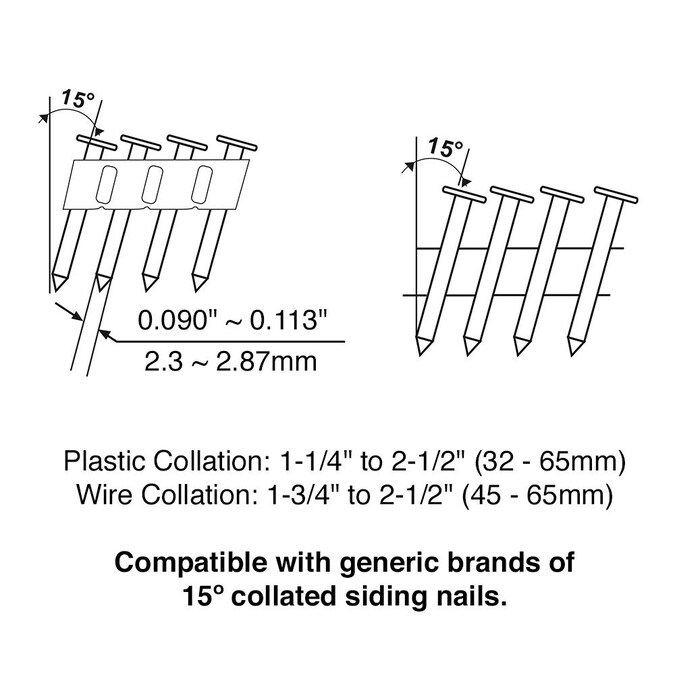 - Shoots 15-degree nails wire and plastic collated siding nails, ranging from plastic 1-1/4 In to 2-1/2 In wire 1-3/4 In to 2-1/2 In