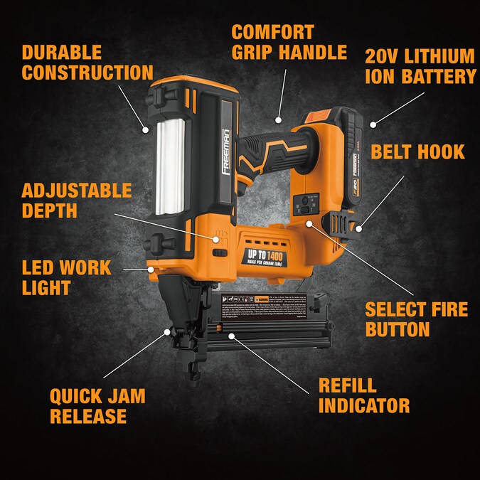 The Freeman PE20V2118G2 20 Volt Cordless 2-in-1 18-Gauge 2 in Nailer / Stapler Kit with Lithium Ion Battery, Charger, Bag, and Nails (400 Count) can drive up to 1400 fasteners per charge and 90 pieces per minute, and is powered by a high-capacity rechargeable 20 volt 2.0 Ah lithium-ion battery. The cordless electric design eliminates the need to be tethered to a loud and heavy air compressor, improving mobility around the house or jobsite. A 2-in-1 multi-purpose magazine allows both nailing and stapling with just one tool and is ideal for decorative trim, moulding, cabinetry, paneling, upholstery, insulation, plastic sheeting, window casing, furniture trim, picture frame assembly, and hobbies and crafts. Use the select fire button to toggle fast and easy between single sequential firing for precision or bump firing for speed. The depth of the fasteners is adjusted by simply turning a wheel near the drive blade, and a quick jam release provides easy access clearing in the event of a jammed fastener. A no mar tip protects your work surface, ensuring professional results for DIYers as well as construction contractors. This cordless finish nailer comes with everything you need to get right to work, including a 20 volt 2.0 Ah lithium-ion battery, rapid charger, canvas bag, belt hook, and fasteners. The 20 Volt Cordless 2-in-1 18-Gauge 2 in Nailer / Stapler Kit will significantly increase your productivity when tackling home improvement and repair projects, and is covered by Freeman’s 1 Year Professional Tool Warranty.