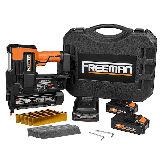 The dual functionality and range of features in the freeman PE2118G 18-Volt 2-in-1 nailer and stapler make it the ideal tool to tackle home improvement jobs including molding and trim, cabinetry, paneling, upholstery, insulation, plastic sheeting, crafts and other finish work. The cordless electric design provides consistent and reliable performance due to the powerful 18-Volt lithium ion battery, eliminating the need to drag around a loud and heavy compressor or worry about tripping over a long air hose. Charging in only 45 minutes, the battery fires up to 400 shots per charge and 30 fasteners per minute. This versatile nail gun and stapler combo tool features a 2-in-1 bottom loading magazine compatible with 18 gauge brad nails from 3/4 in. to 2 in., and 18 gauge 1/4 in. narrow crown staples from 3/4 in. to 1-5/8 in. select the single firing mode to ensure precise fastener placement or switch to the bump fire contact mode for faster firing speeds. Use the tool-free depth adjustment wheel to customize the firing depth, making it easy to achieve professional results. The no-mar tip protects your work surface, while the work contact element and two-stage trigger protect the user from accidental firing. The 18-Volt 2-in-1 nailer and stapler kit comes with everything you need to get started, including two 18V lithium-ion batteries, a quick charger, 500 brad nails, 500 staples, two hex keys, and a blow molded storage case, and is covered by freeman’s 1 year limited warranty.