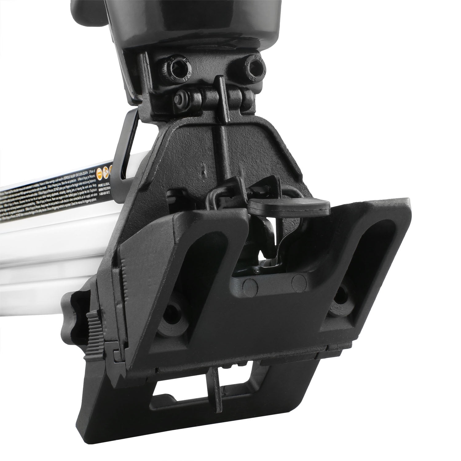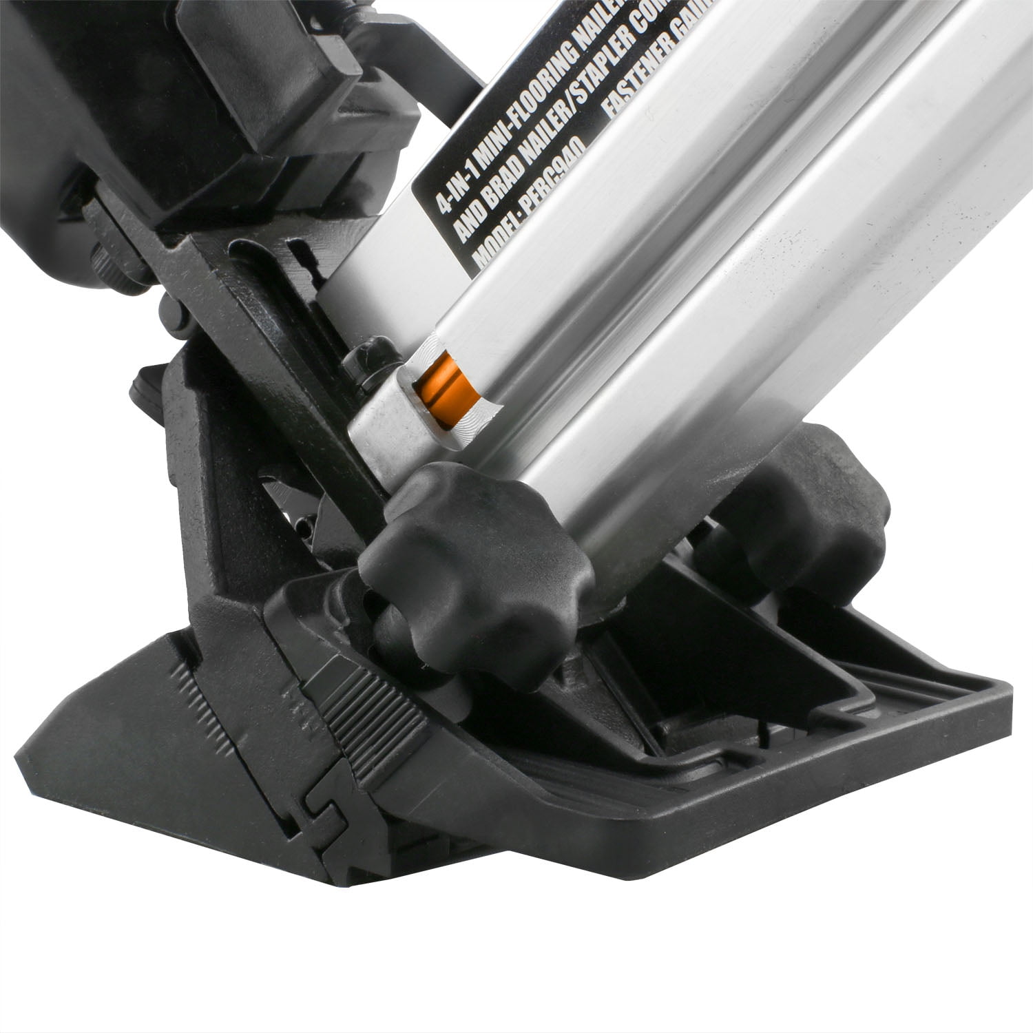 Construction Applications: Perfect for engineered or solid hardwood tongue and groove flooring installation, decorative trim, moulding, cabinetry, paneling, upholstery, insulation, plastic sheeting, window casing, furniture trim, picture frame assembly, and hobbies and crafts 4-in-1 Nail / Staple Gun: Specifically designed to take on both flooring from 1/4″ – 5/8″ and finish work with just one tool, saving time and money (multi-purpose magazine also holds 18 gauge brad nails from 5/8″ – 1-5/8″, and 18 gauge 1/4″ narrow crown staples from 3/8″ – 1-5/8″) Built to Last: One piece hardened steel drive blade, and anodized aluminum cylinder and magazine result in a durable pneumatic tool resistant to damage Tool-free Depth Adjust: Simply turn the depth adjustment wheel by hand to change the driving depth of nails and staples for various projects and materials Quick Jam Release: Allows for easy access clearing in the event of a jammed fastener so you can get right back to work Reload Indicator: View remaining fasteners and eliminate the guesswork Ergonomic Body: Rugged but also lightweight and comfortable for extended use Comfort Grip Handle: Reduces fatigue during long shifts and increases accuracy of fastener placement 360 Degree Adjustable Exhaust: Conveniently allows user to direct air away from face Included: 45 degree angle flooring attachment