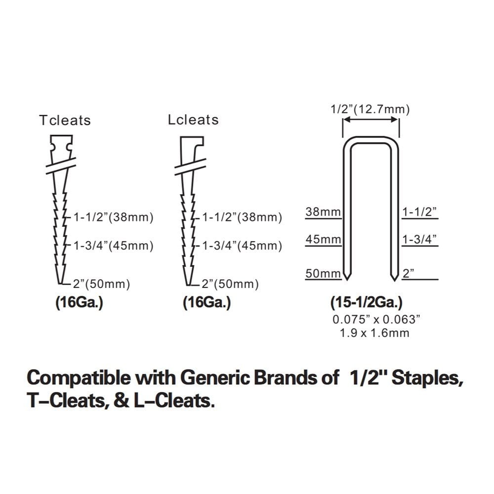 Construction Applications: Perfect for the installation of tongue and groove hardwood flooring 3-in-1 Flooring Nailer / Stapler: Multi-purpose design allows nailing and stapling with just one tool, saving time and money (16 gauge T-cleats and L-cleats, and 15.5 gauge 1/2″ crown staples from 1-1/2″ – 2″ L for all three types of fasteners) Built to Last: High strength and lightweight aluminum body, anodized aluminum magazine, and heat treated steel parts result in a durable pneumatic tool resistant to damage Semi-Quick Jam Release: Upgraded to allow faster access to the drive blade in the event of a jammed fastener Ergonomic Extended Reach Handle and Light Strike Bumper: Reduce fatigue and provide ease of operation during long shifts (2) Interchangeable No Mar Base Plates: Protect even finished flooring surfaces from damage, easily change to allow working on 1/2″ – 3/4″ flooring Included: Long reach fiberglass mallet with padded grip and a blow molded case Increase Productivity Even More: Add the Freeman PFNRB Flooring Nailer Roller Base Converter when purchasing this tool Warranty: Covered by Freeman’s 7 Year Limited Warranty and 90 Day Wearable Parts Warranty