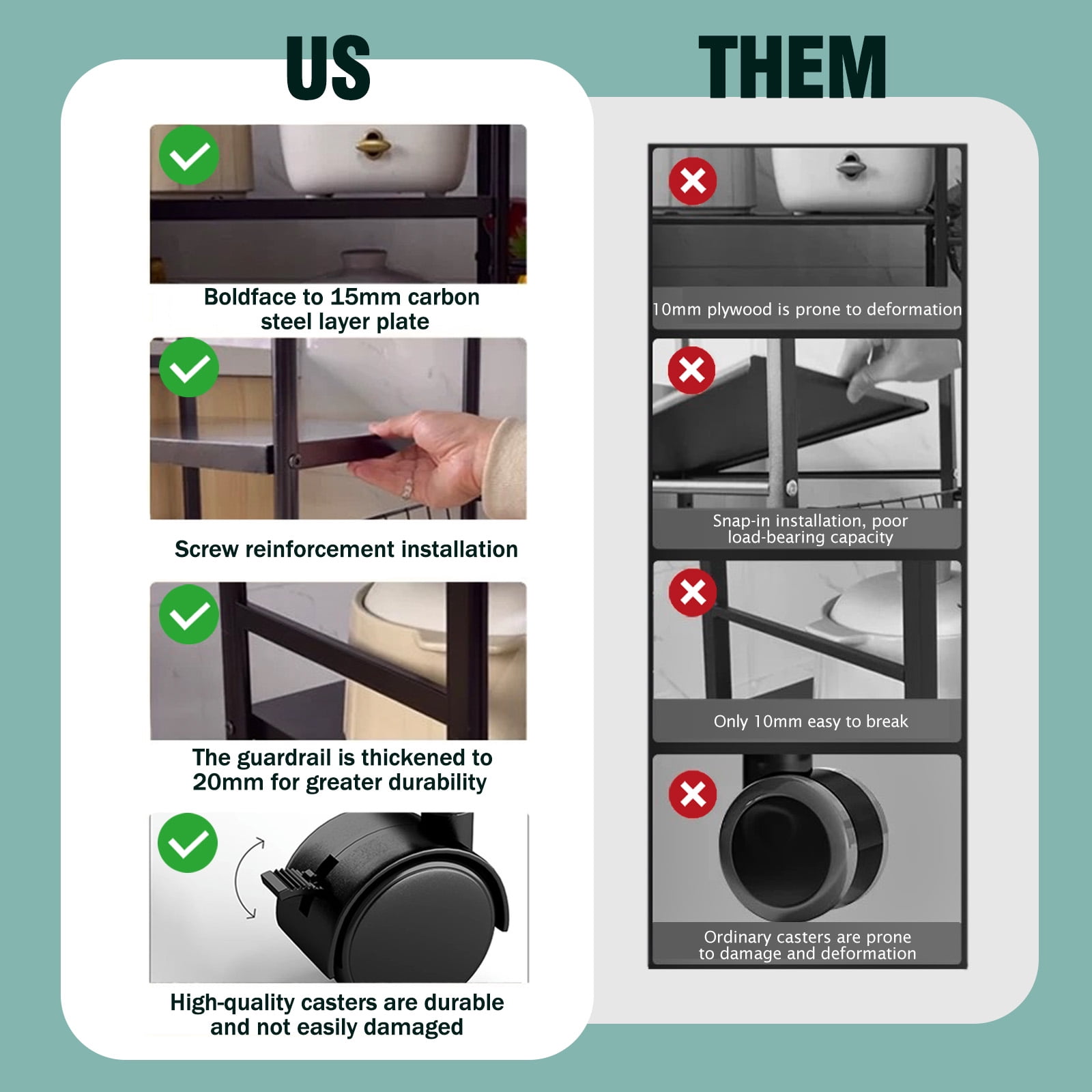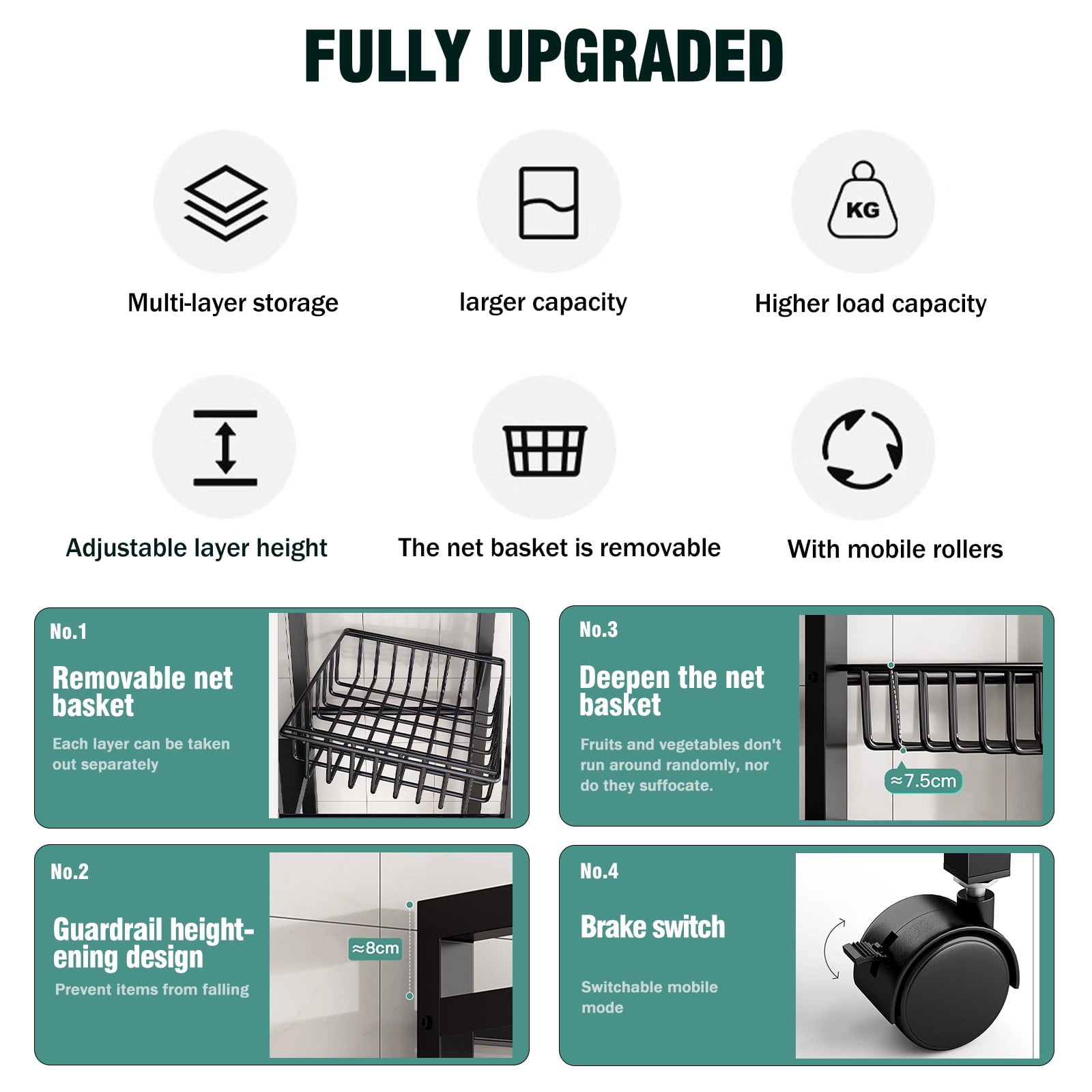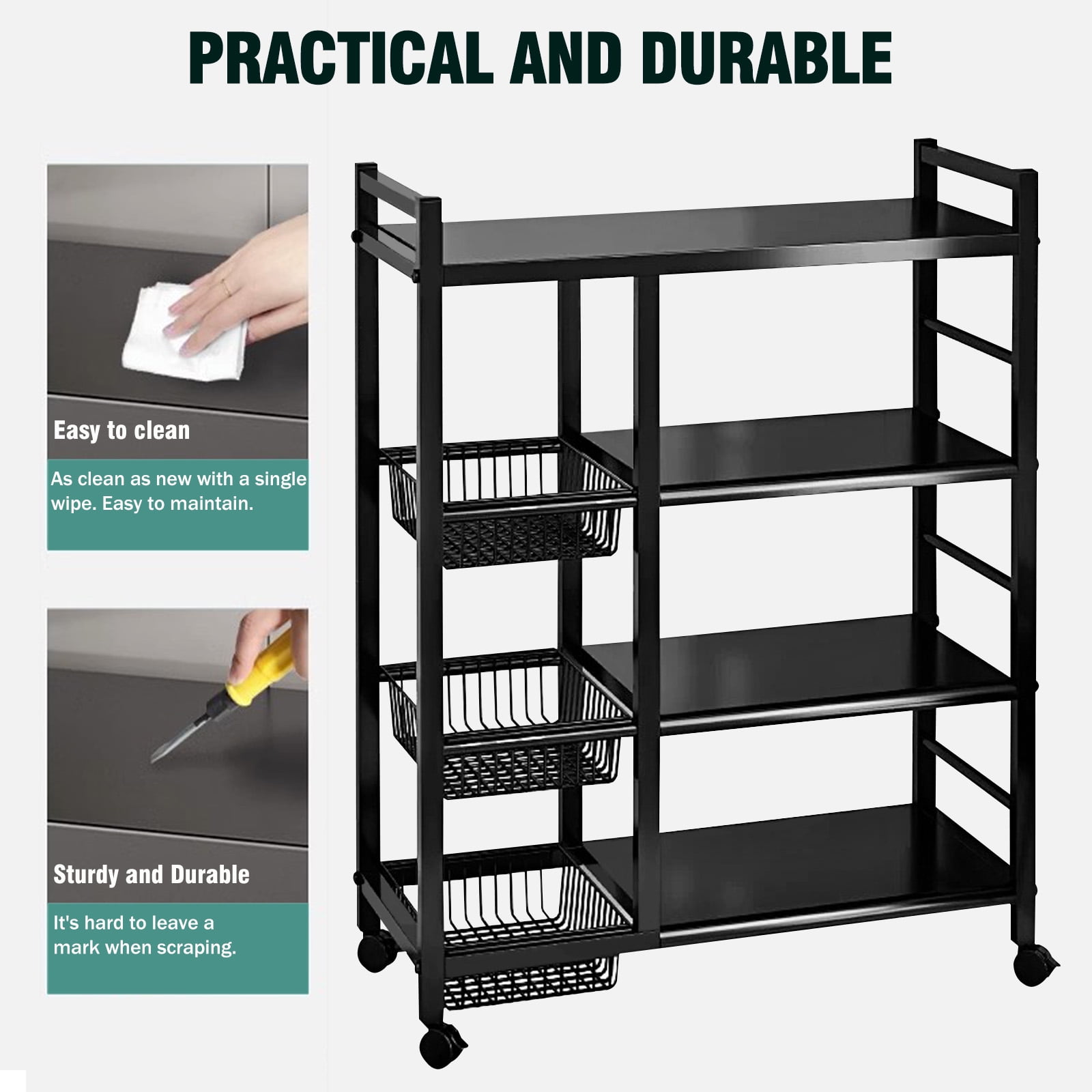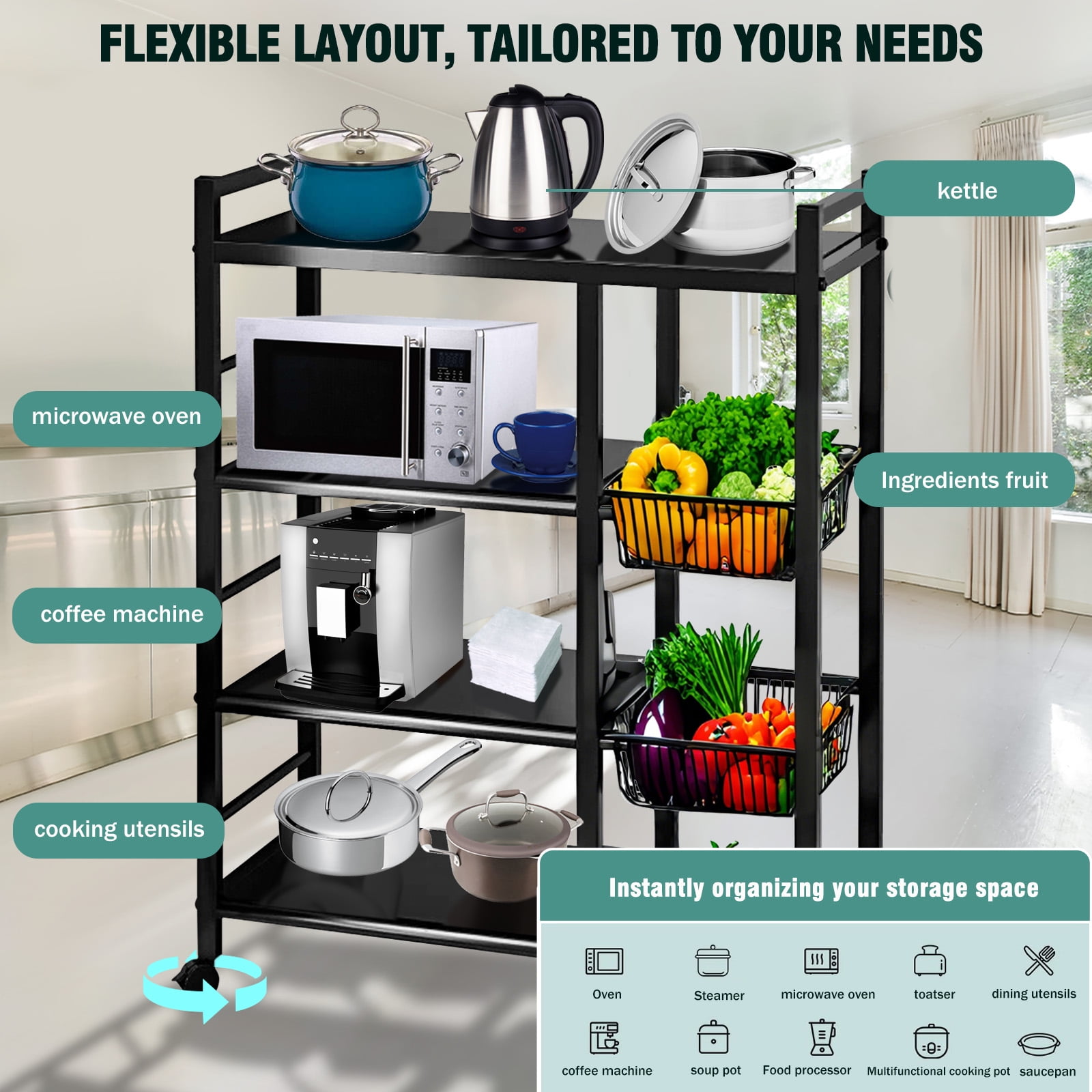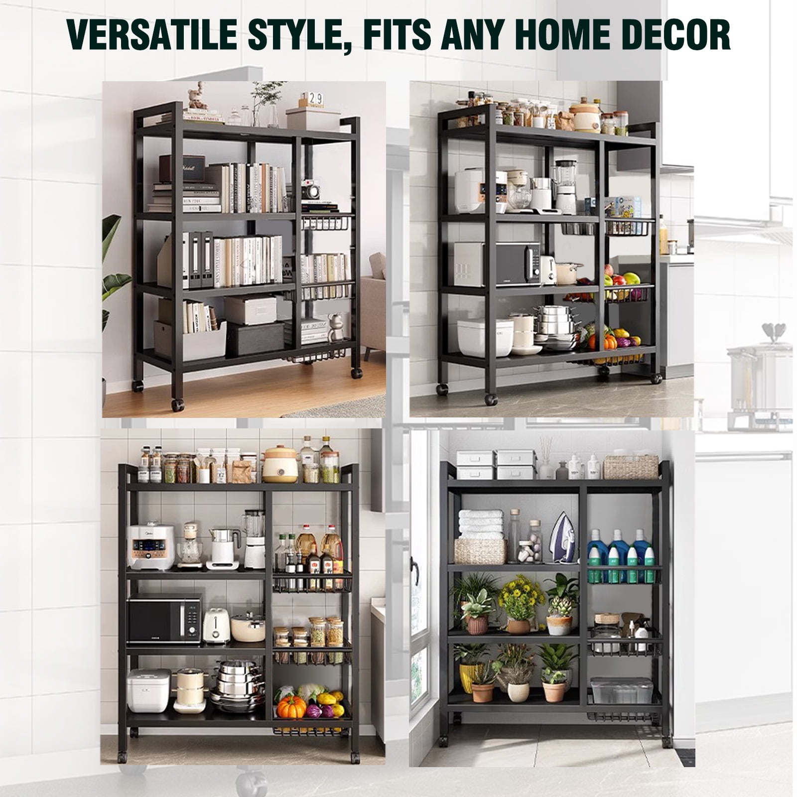 ????【Flexible Layout, Tailored to Your Needs】Imagine a storage rack where bulky kitchen pots and pans or stacks of detergent boxes in the laundry room find their perfect place. Thanks to the unique adjustable shelving system, a simple adjustment can accommodate items of any size and shape, instantly organizing your storage space. ????【Easy Mobility, Convenient Living】Say goodbye to cumbersome lifting. This storage shelf with wheels is equipped with smooth-rolling wheels, allowing you to easily move it between the kitchen, storage room, laundry room, and more. Whether for temporary storage or long-term placement, it offers unmatched convenience and comfort in your daily life. ????【Sturdy and Durable, A Quality Choice】Made from high-quality steel, this kitchen storage rack is designed to withstand daily wear and heavy loads. It maintains its stability and durability through long-term use or unexpected bumps, providing a safe haven for your belongings. ????【Versatile Style, Fits Any Home Decor】The stylish black coating not only gives this shelf with wheels a high-end look but also allows it to blend seamlessly into any interior design style. Whether your decor is modern, Scandinavian, or vintage, it complements it perfectly. The open structure also ensures that items are easily visible and accessible. ????【Simple Installation, Enjoy Immediately】The installation process is simplified, with a clear instruction manual provided. No special tools or professional skills are required—just follow the steps, and you’ll have it assembled in no time, ready to bring order and convenience to your space.