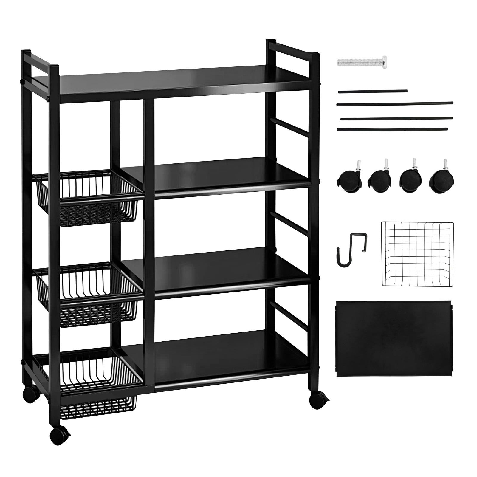 Freestanding Kitchen Storage Rack, Multi-Functional Multi-Layer Mobile Storage Shelf, 4 Tiers with 3 Baskets, Suitable for Kitchen, Bedroom, Living Room, and Balcony